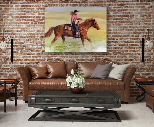 Original "Wild Ride: A Girl Cowboy's Gallop" Hand Painted Artwork for Living Room, Bedroom, Foyer, Bar or Office - Framed Canvas