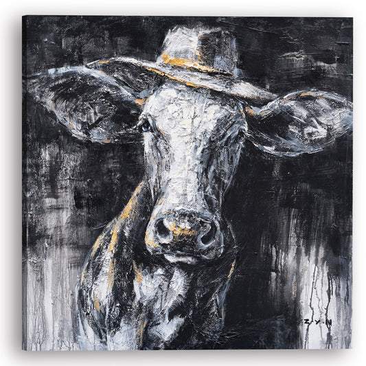 "Cow Wearing a Hat Oil Painting" Hand Painted on Wrapped Canvas