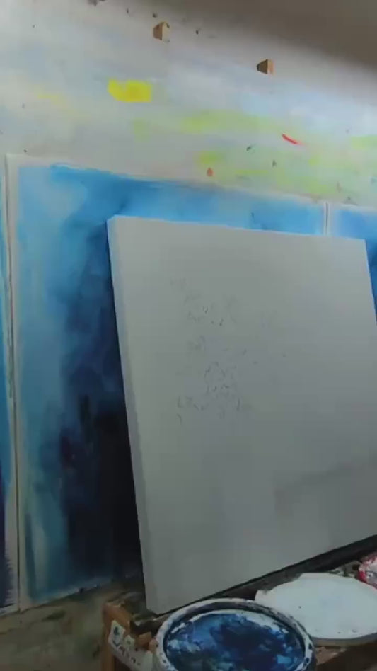Hand-painted "Abstract blue leaves in the rain" original art, Canvas Wall art for living room, bedroom, office - Wrapped Canvas Painting