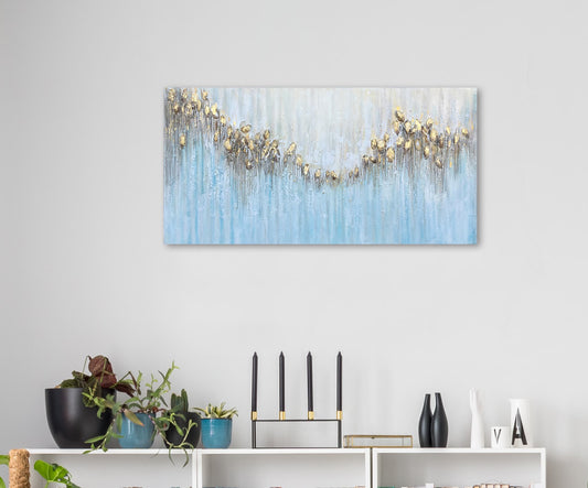 Hand-painted "Abstract blue leaves in the rain" original art, Canvas Wall art for living room, bedroom, office - Wrapped Canvas Painting