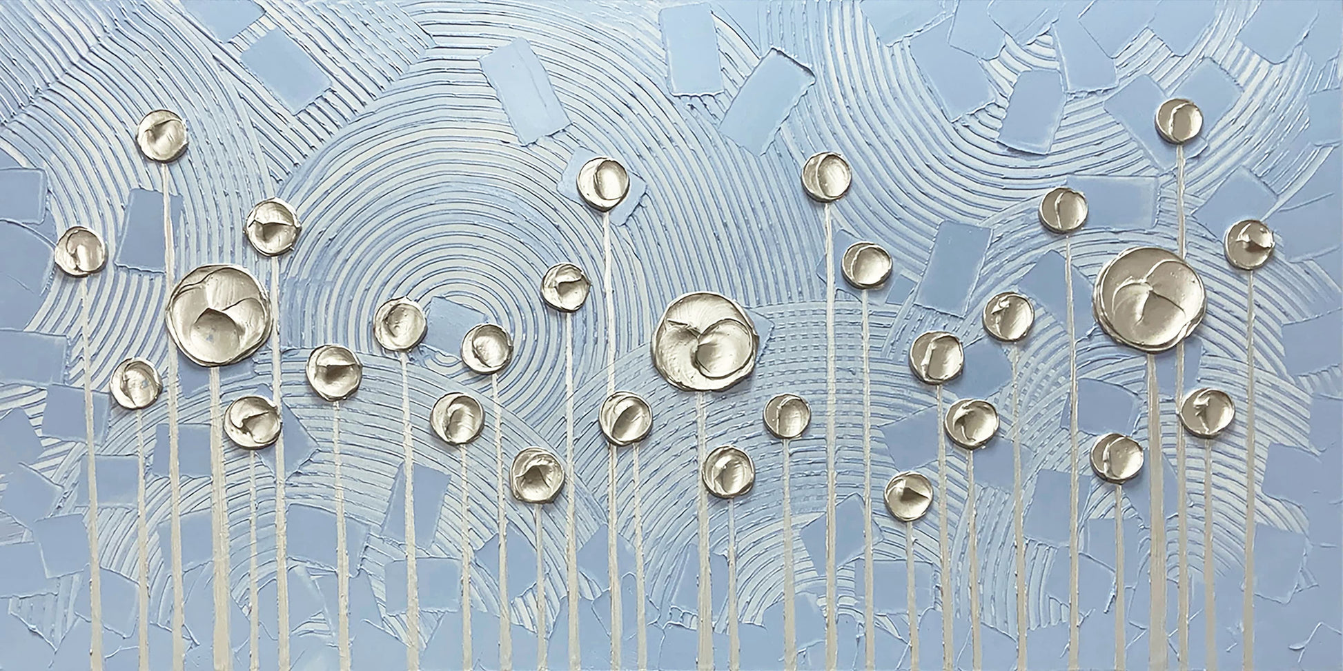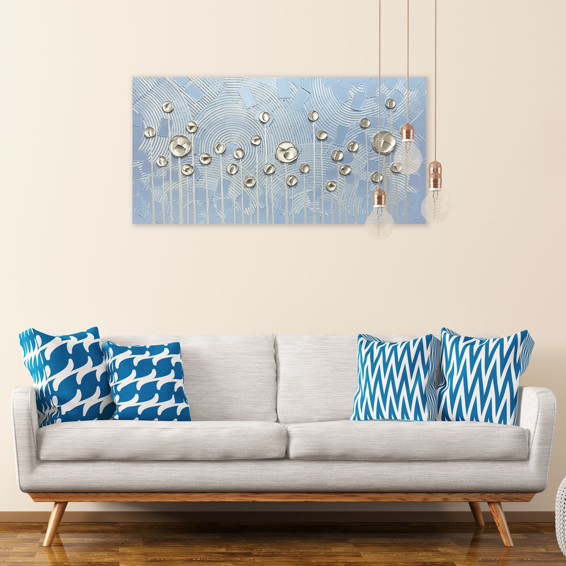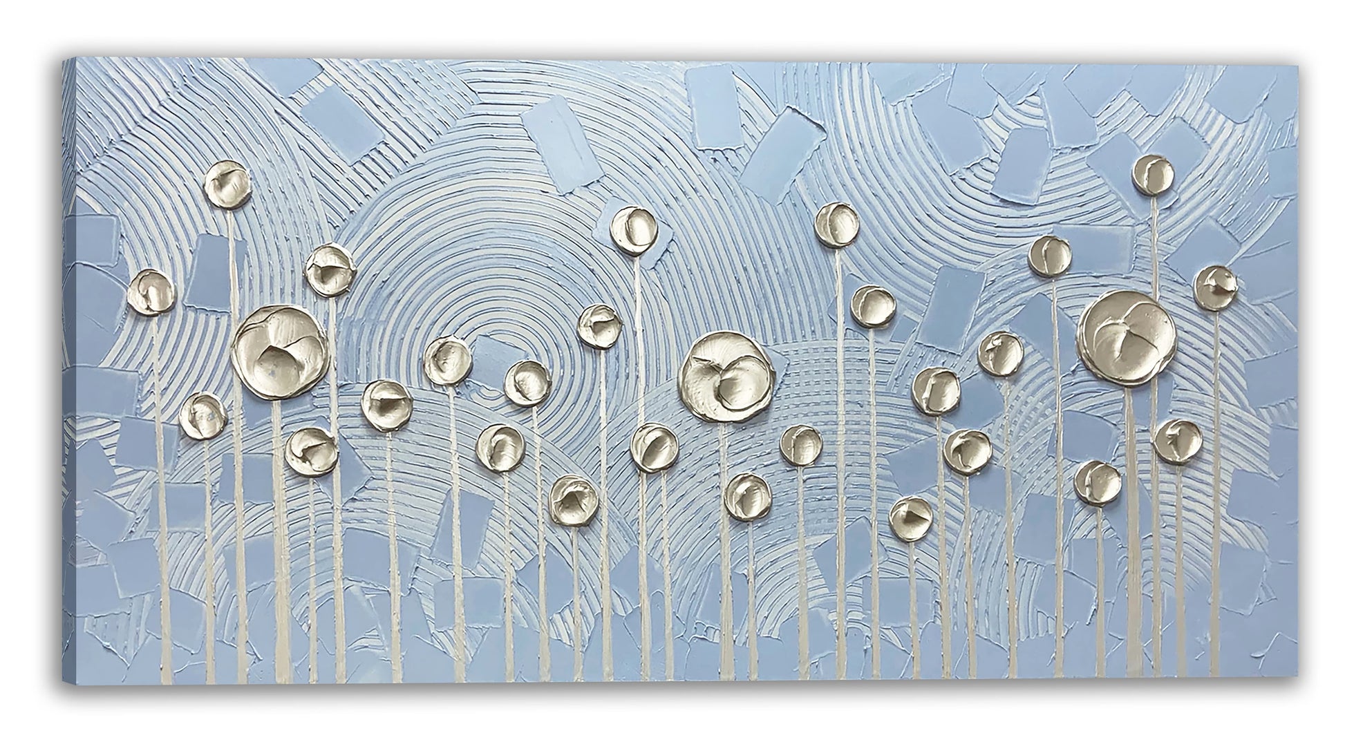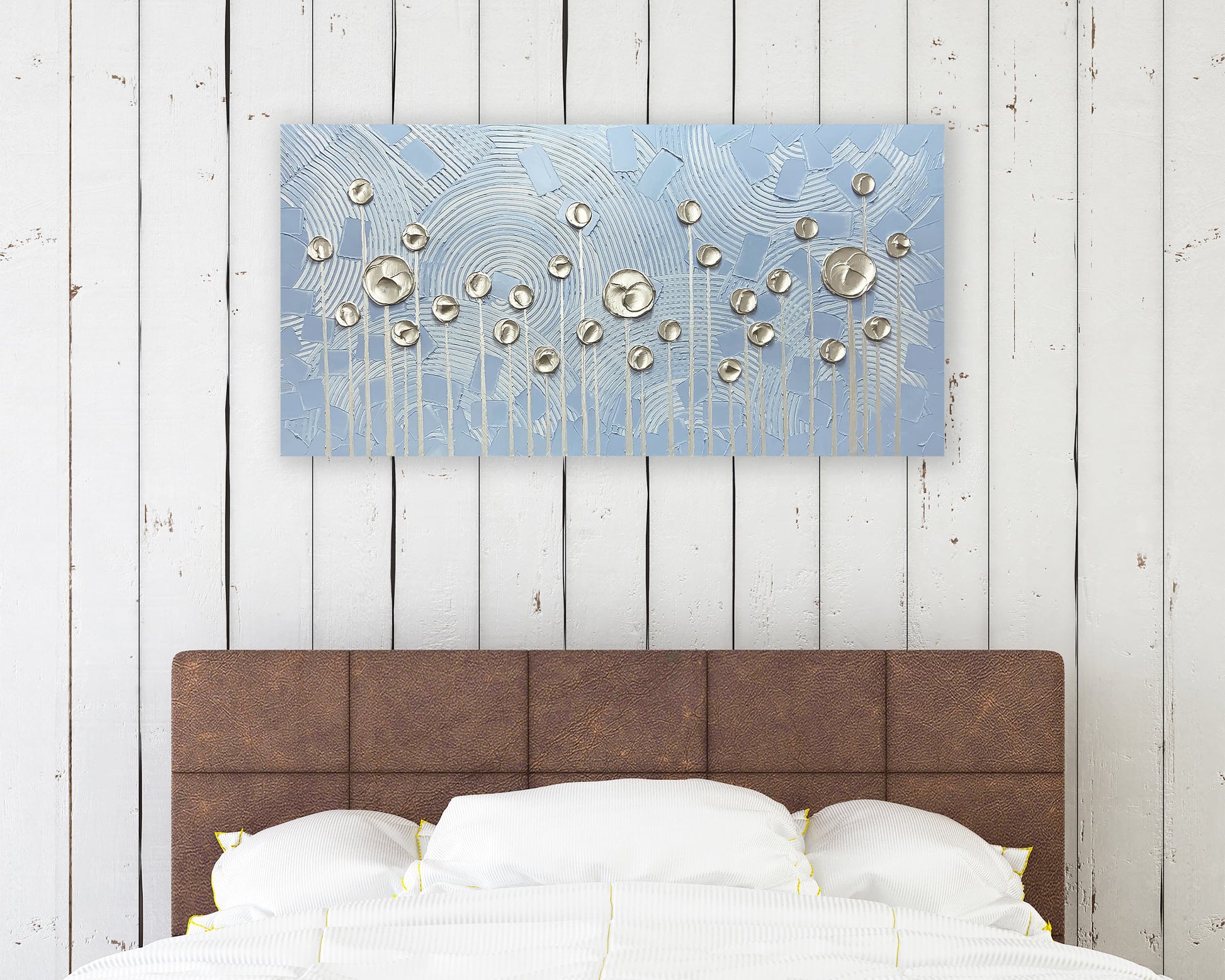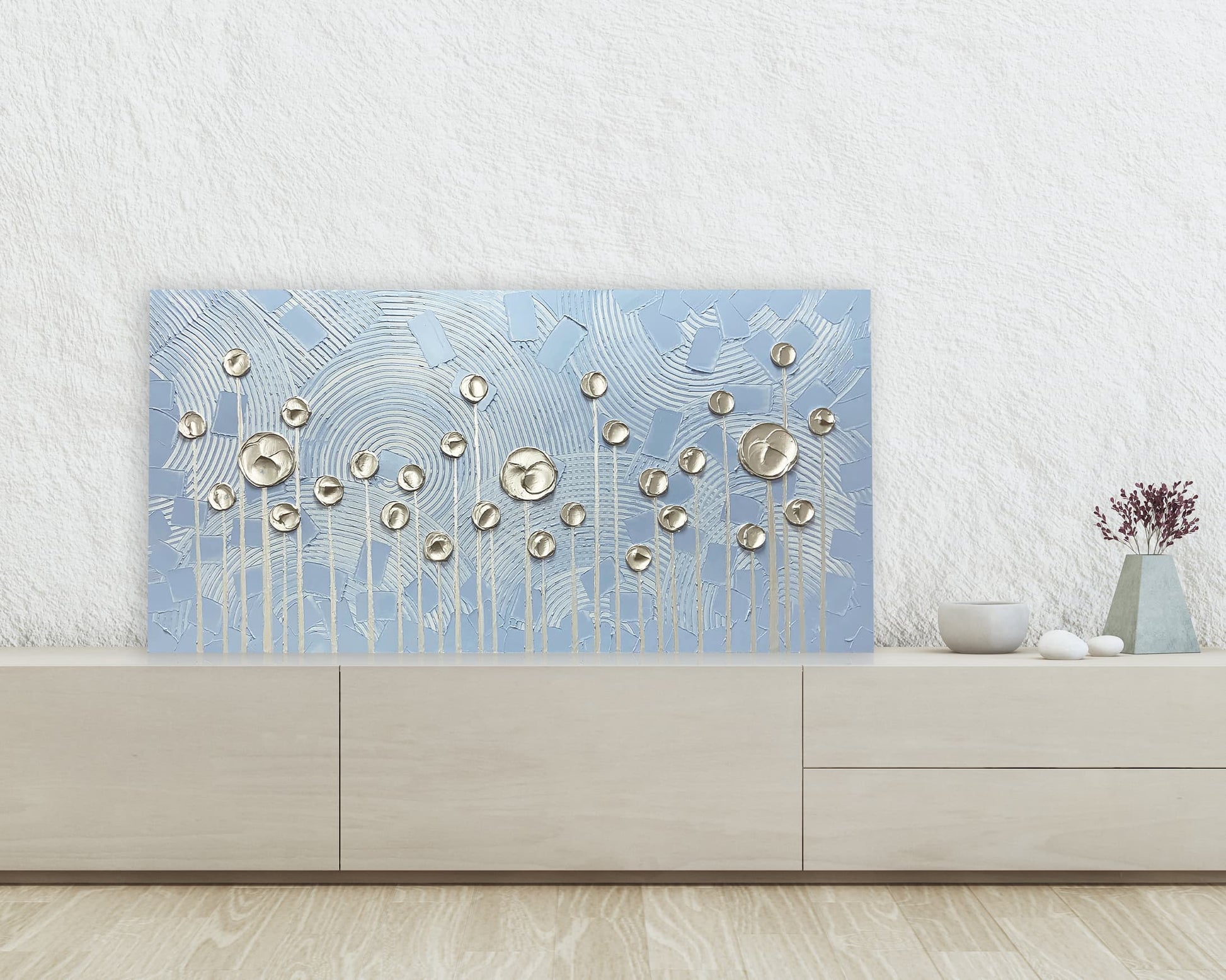 The use of metallic silver against the cool blue creates a stunning contrast, reminiscent of the first morning dew glistening on fresh petals. The abstract design lends a contemporary edge, making it an ideal choice for modern interiors. Each stroke and sculpted petal is thoughtfully placed, inviting the viewer into a peaceful, reflective state.