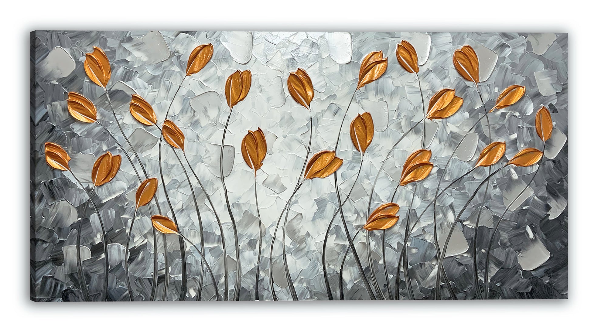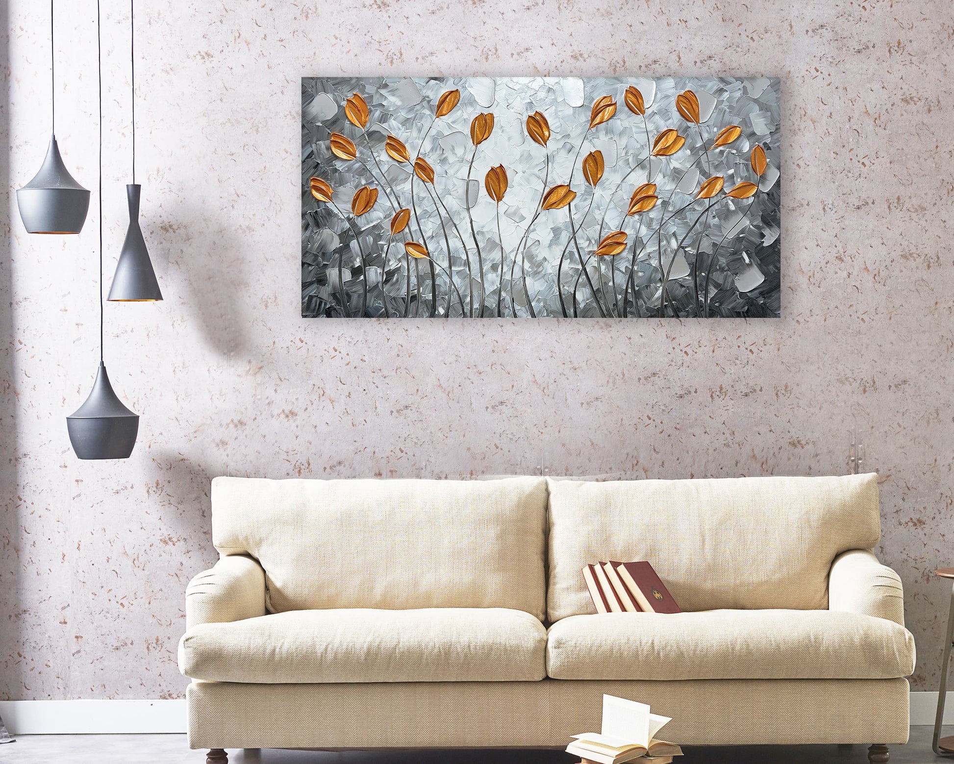 "Fall's Echo" is a captivating work of art that elegantly captures the essence of autumn's splendor. The painting is a symphony of warmth, with leaves in rich copper tones that dance gracefully across a textured backdrop of cool grey. Each leaf is depicted with a luminous quality, as if reflecting the gentle light of an autumn afternoon.