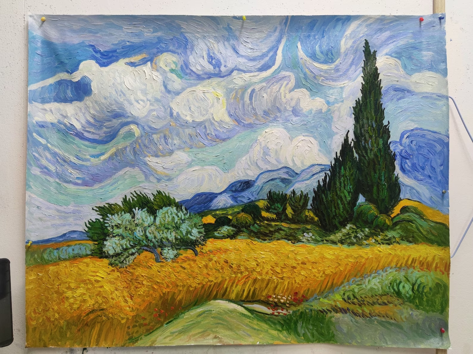Experience the beauty of Vincent van Gogh's "Wheat Field and Cypresses" with our high quality reproduction. Each piece is meticulously hand-painted by one of our talented artists, ensuring 100% unique and high-quality oil painting. The artwork is part of van Gogh's iconic Wheat Fields series and was inspired by views from the Saint Paul-de-Messor mental asylum where he spent his time as a patient. This is a reproduction and our painter has captured the stunning essence of this masterpiece.