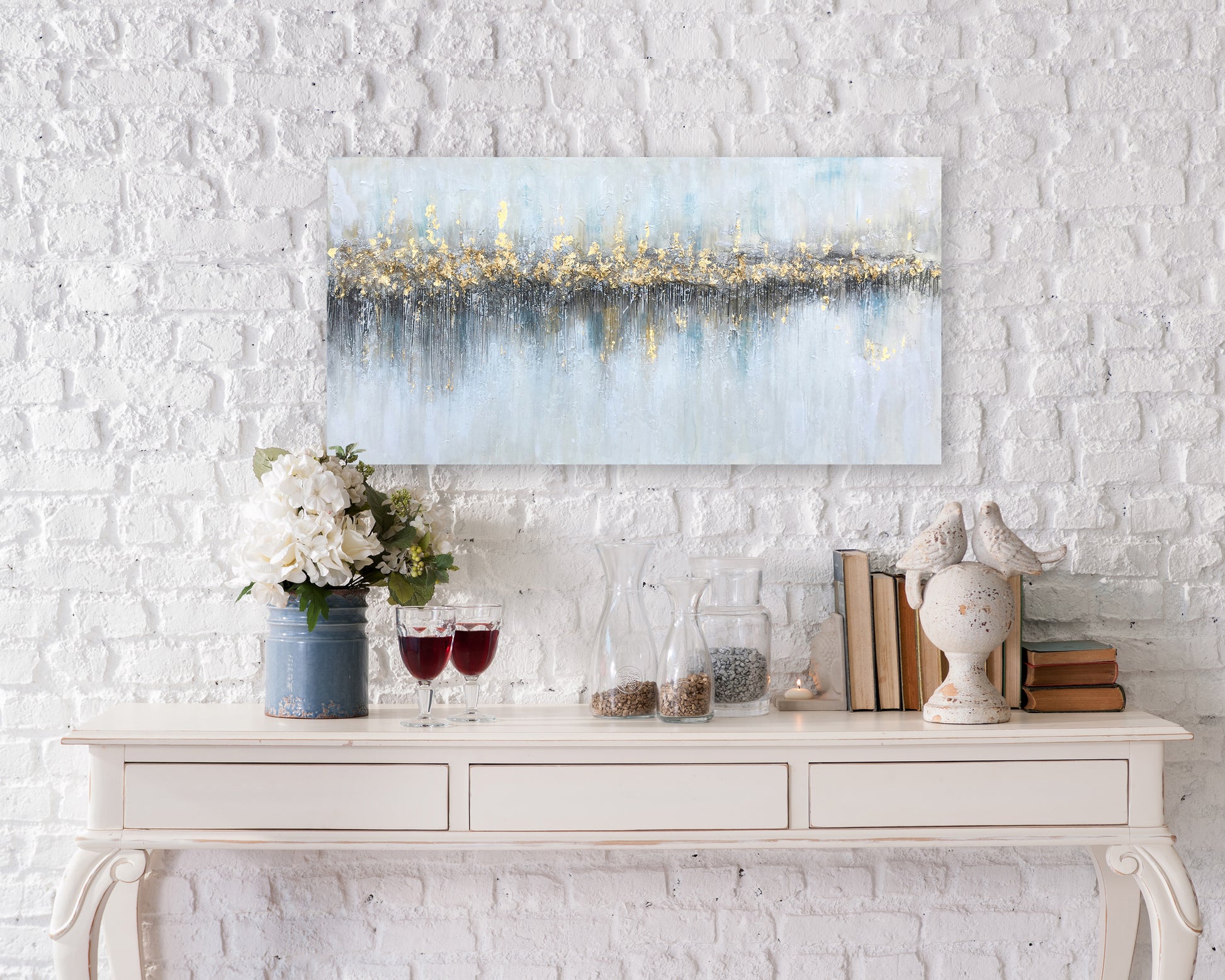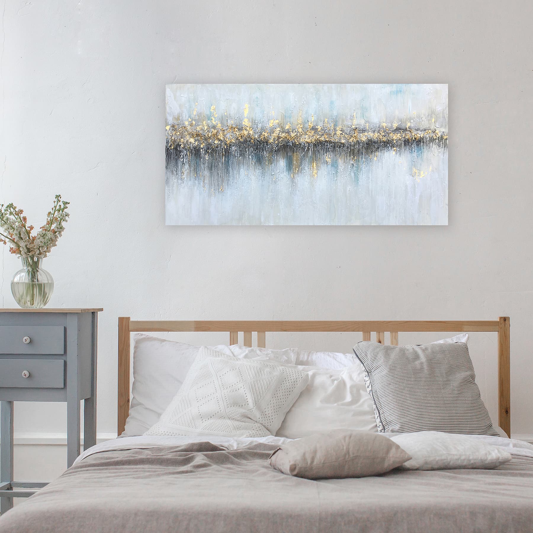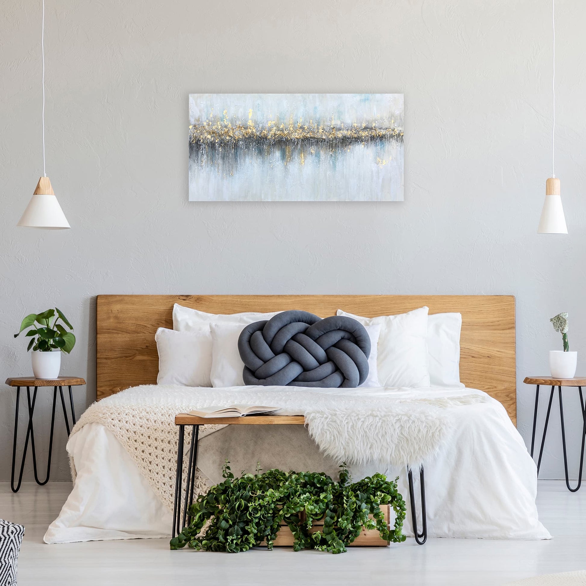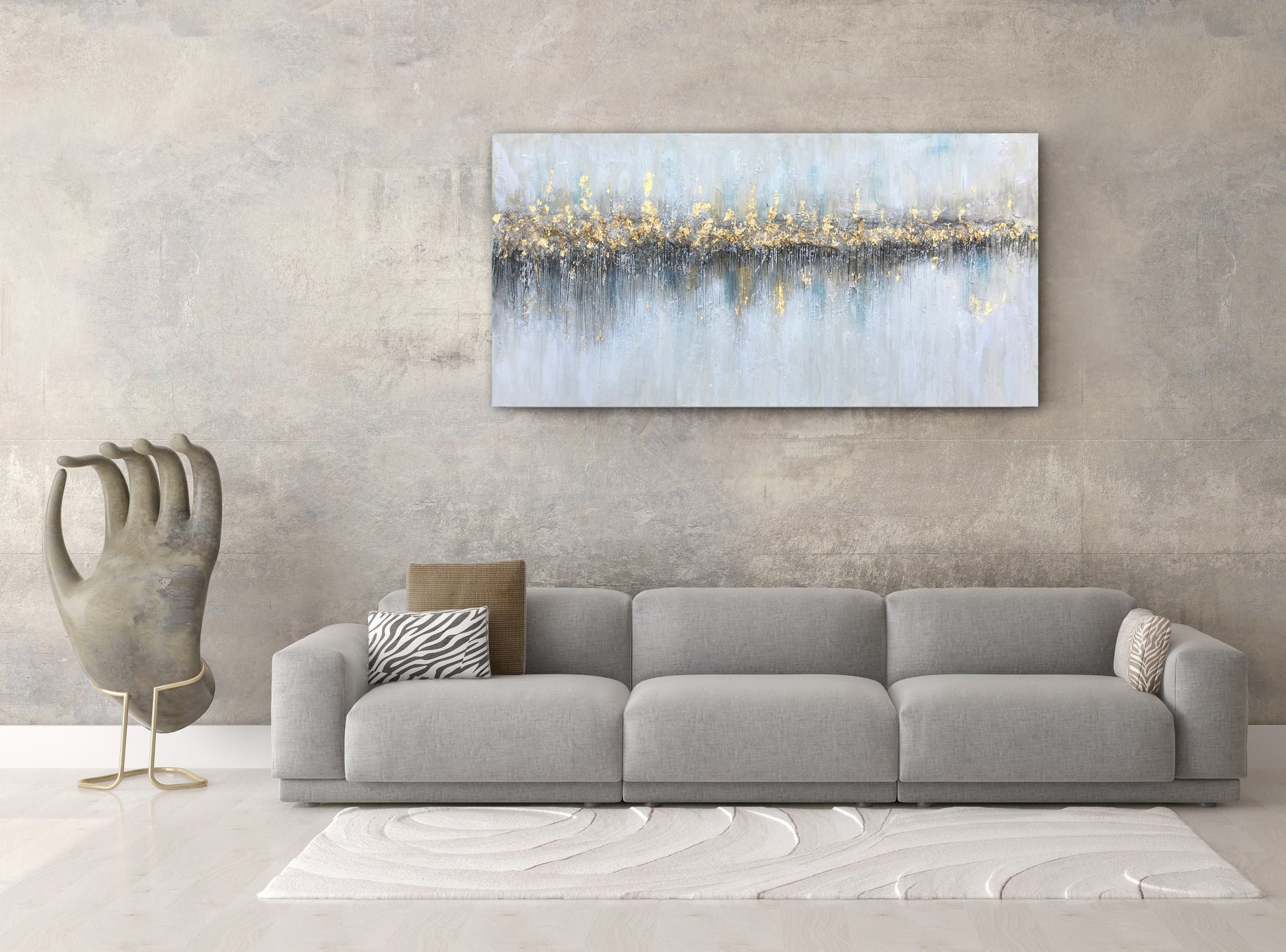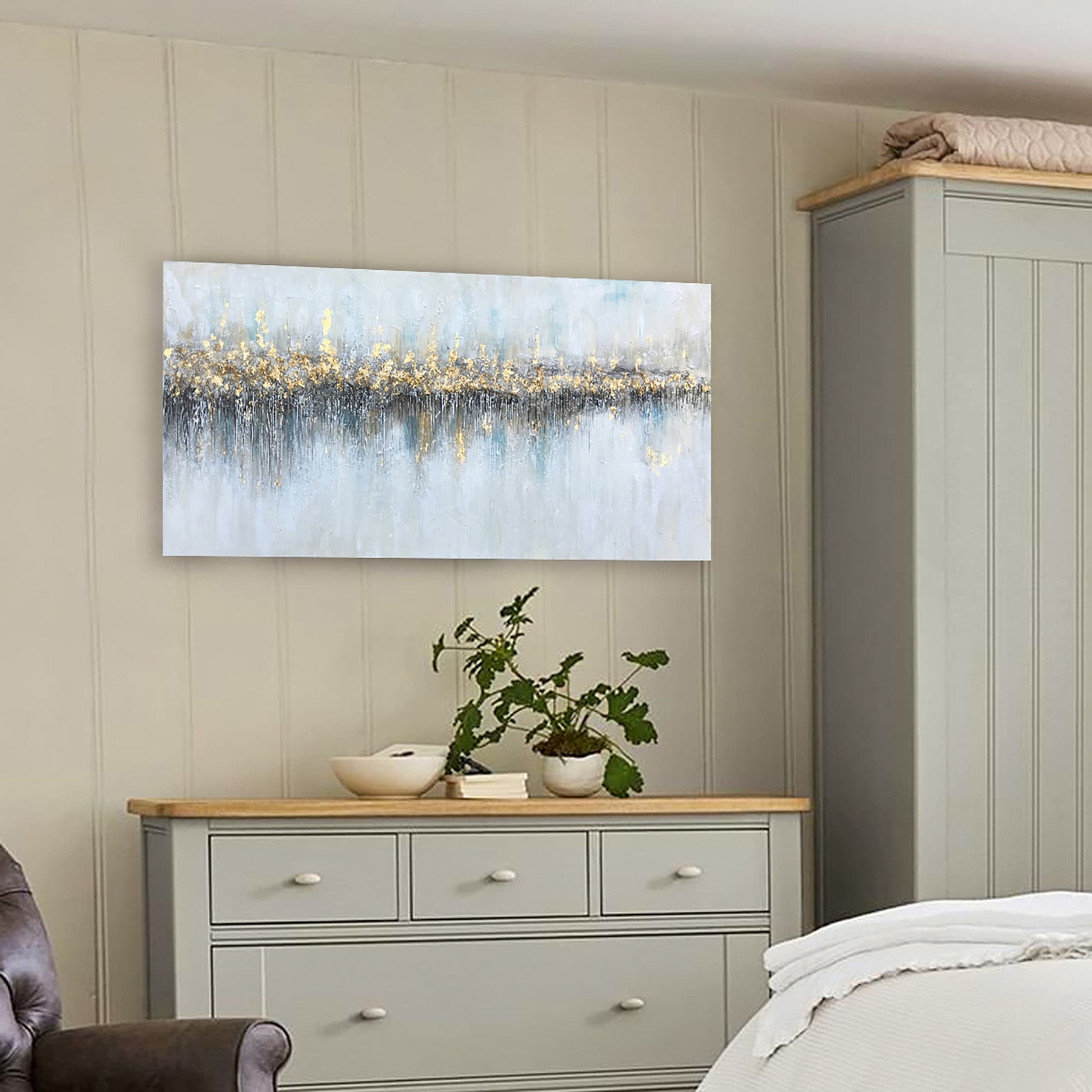 Crafted with a masterful application of gold highlights, this painting offers a shimmering horizon that stands as a testament to the beauty found in the quiet moments of life. Each stroke tells a story of contrasts - the cool, calming grays and blues against the warm, vibrant golds - creating a dance of color and light that mesmerizes and draws the viewer into a meditative state.
