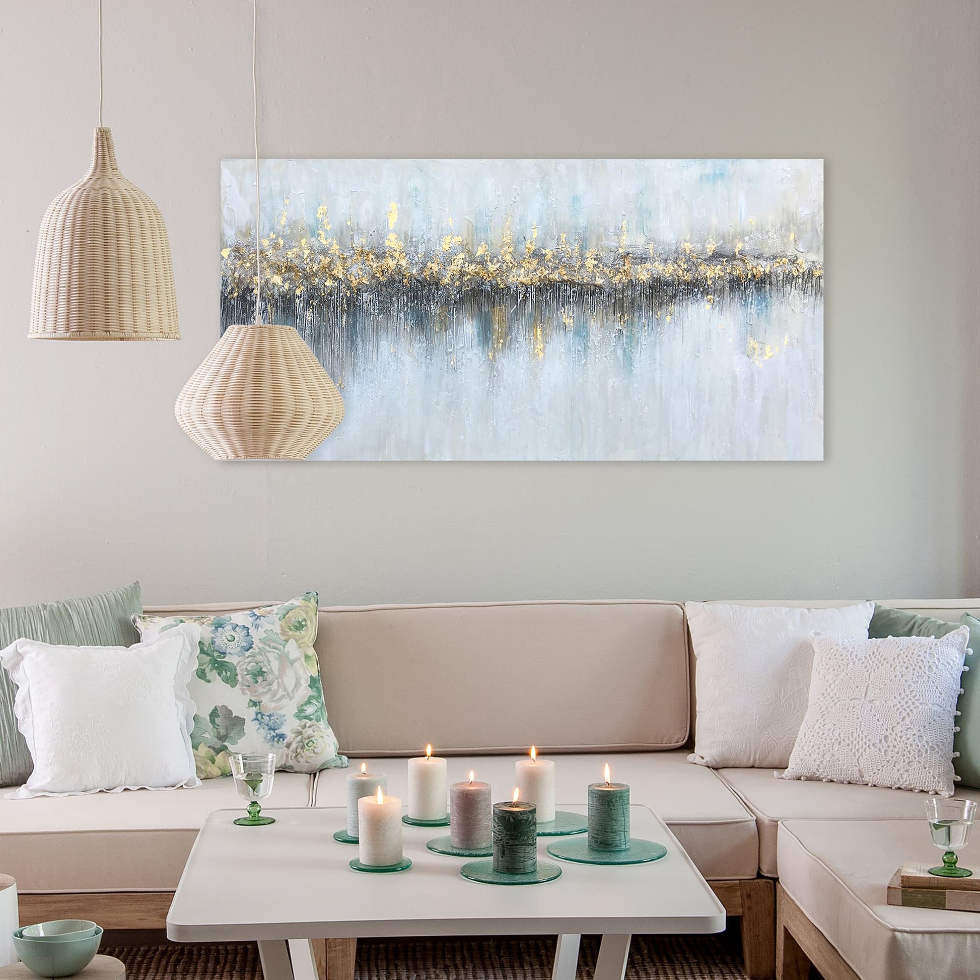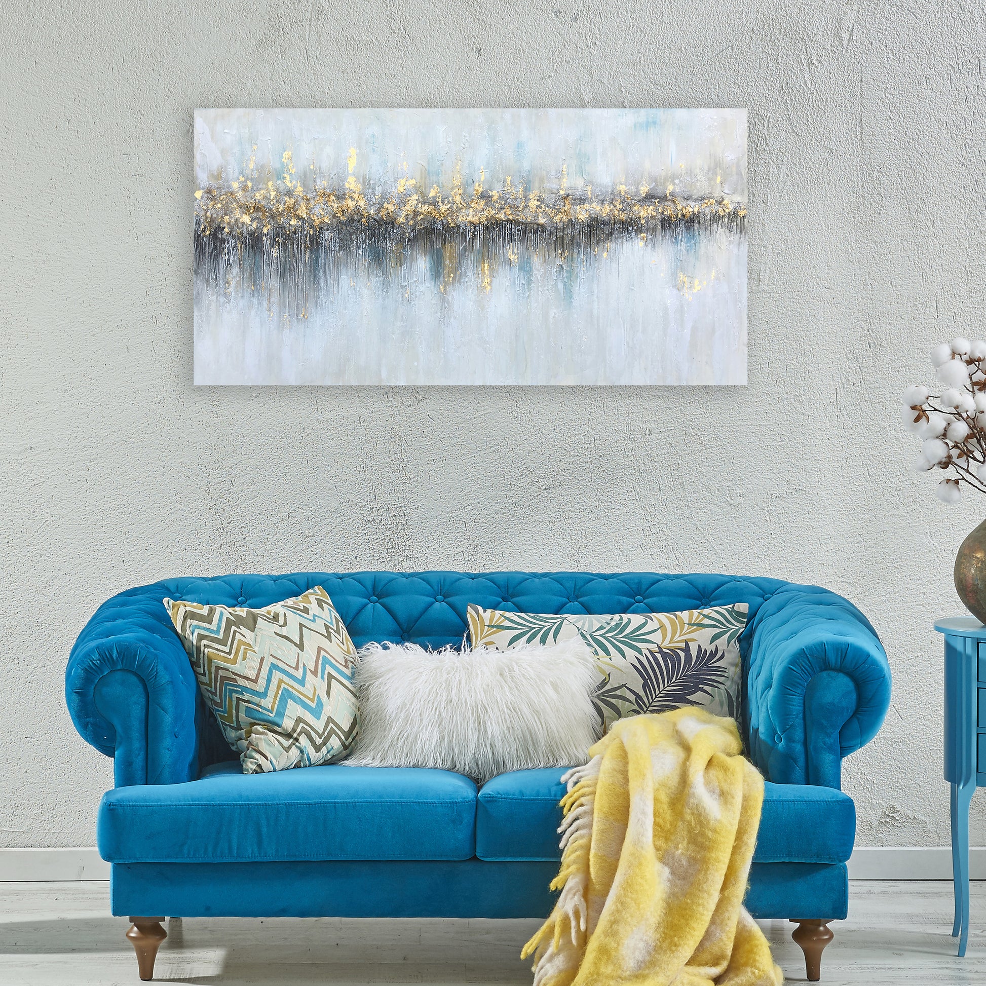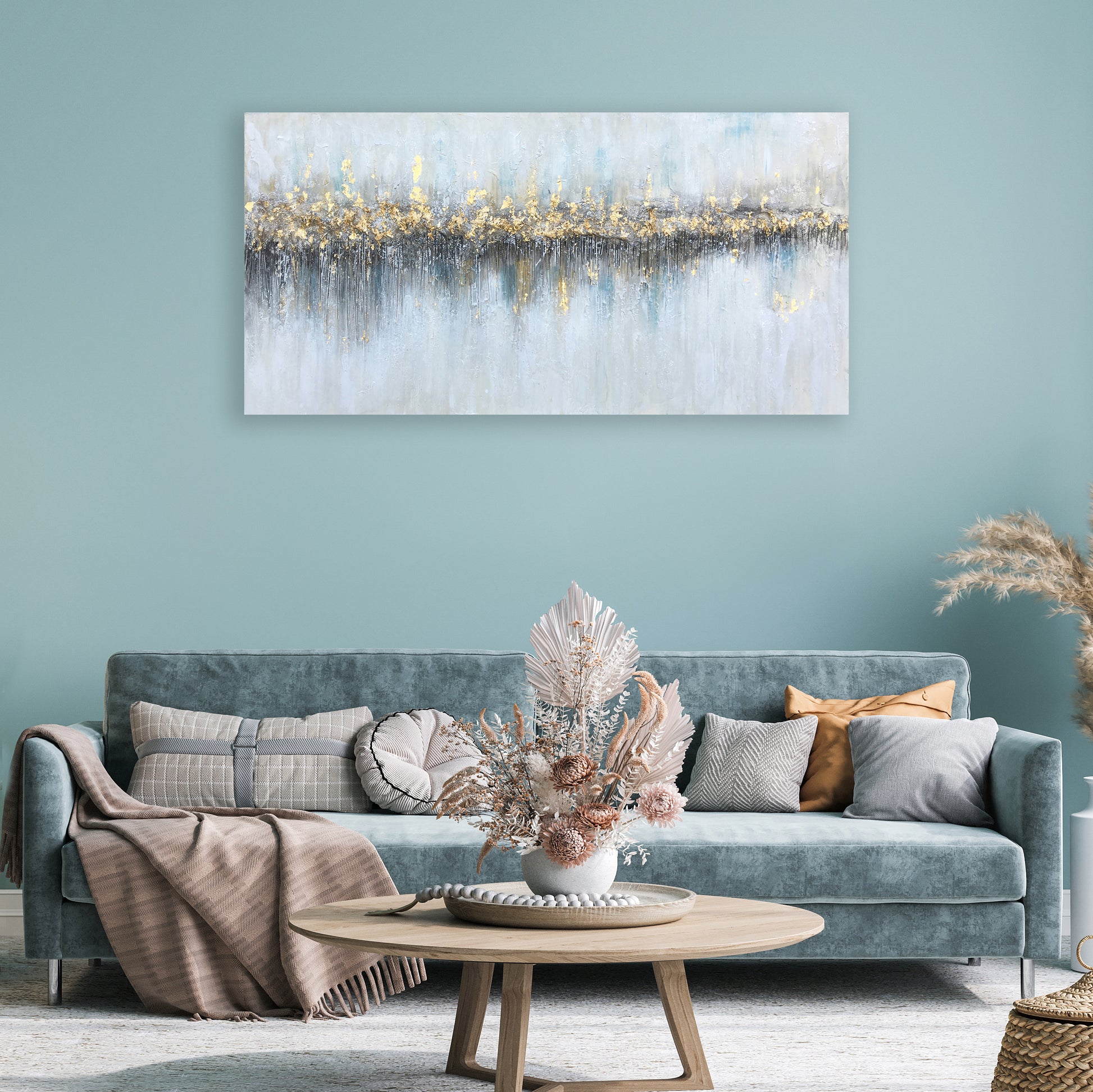 This piece will not only serve as a stunning focal point in your home or office but will also be a source of continuous inspiration and calm. Whether you are an avid art collector or looking to start your collection with a significant piece, "Golden Horizon" promises to transform any room into a gallery of modern tranquility.