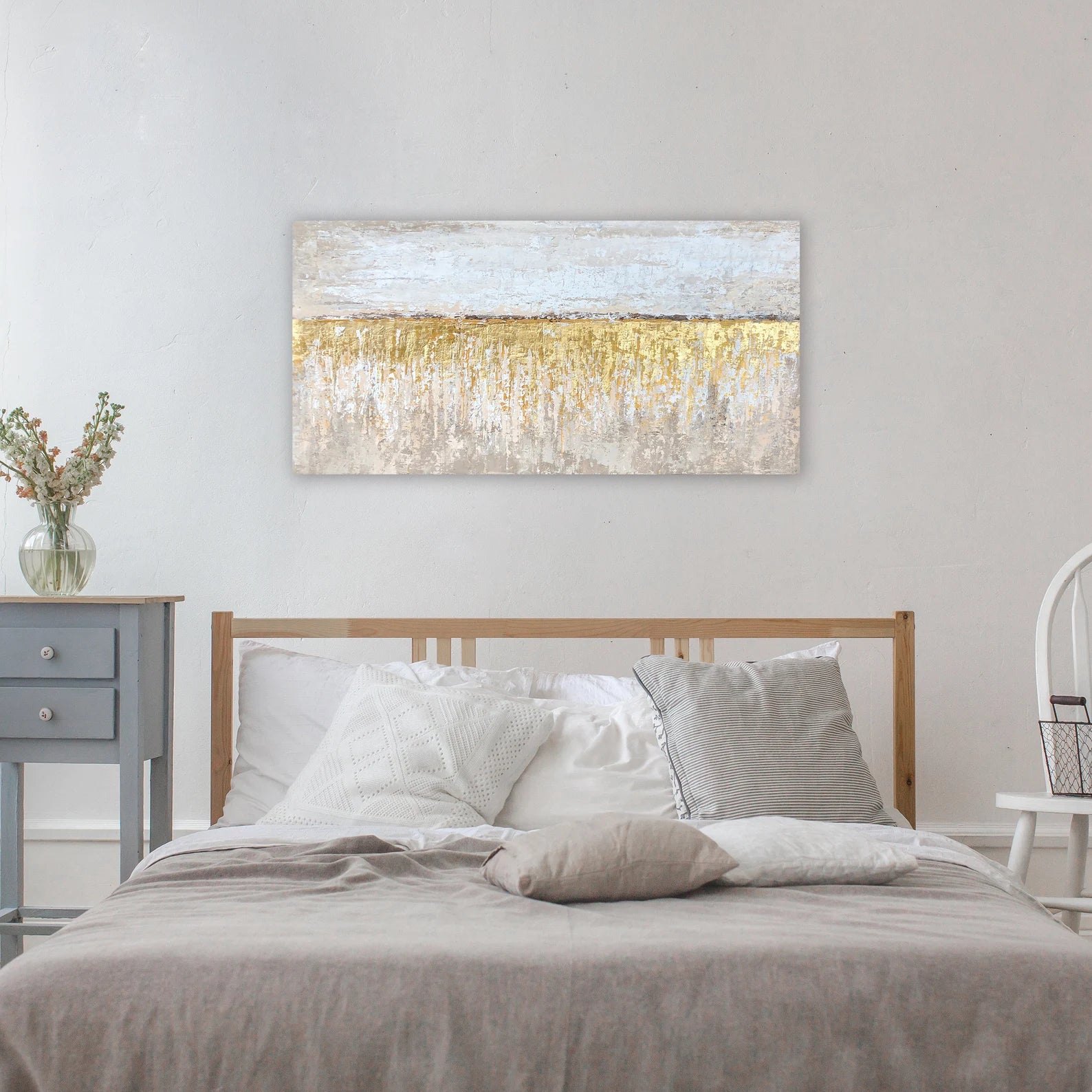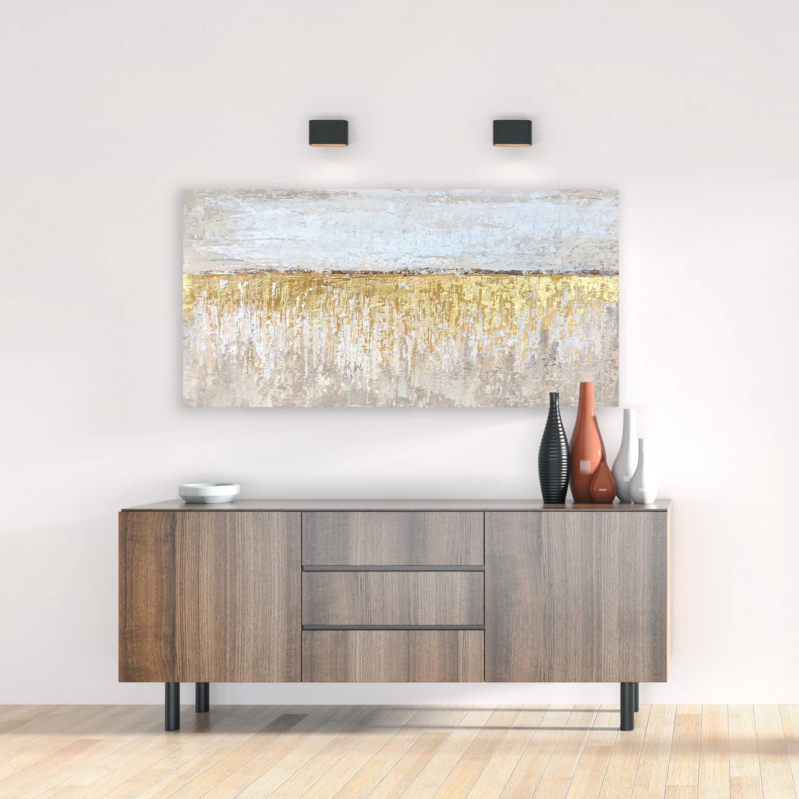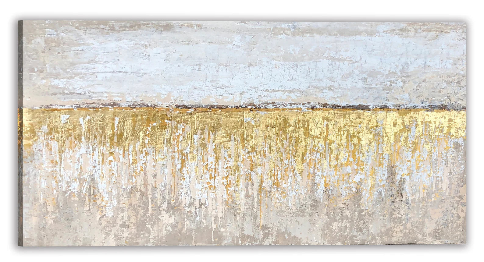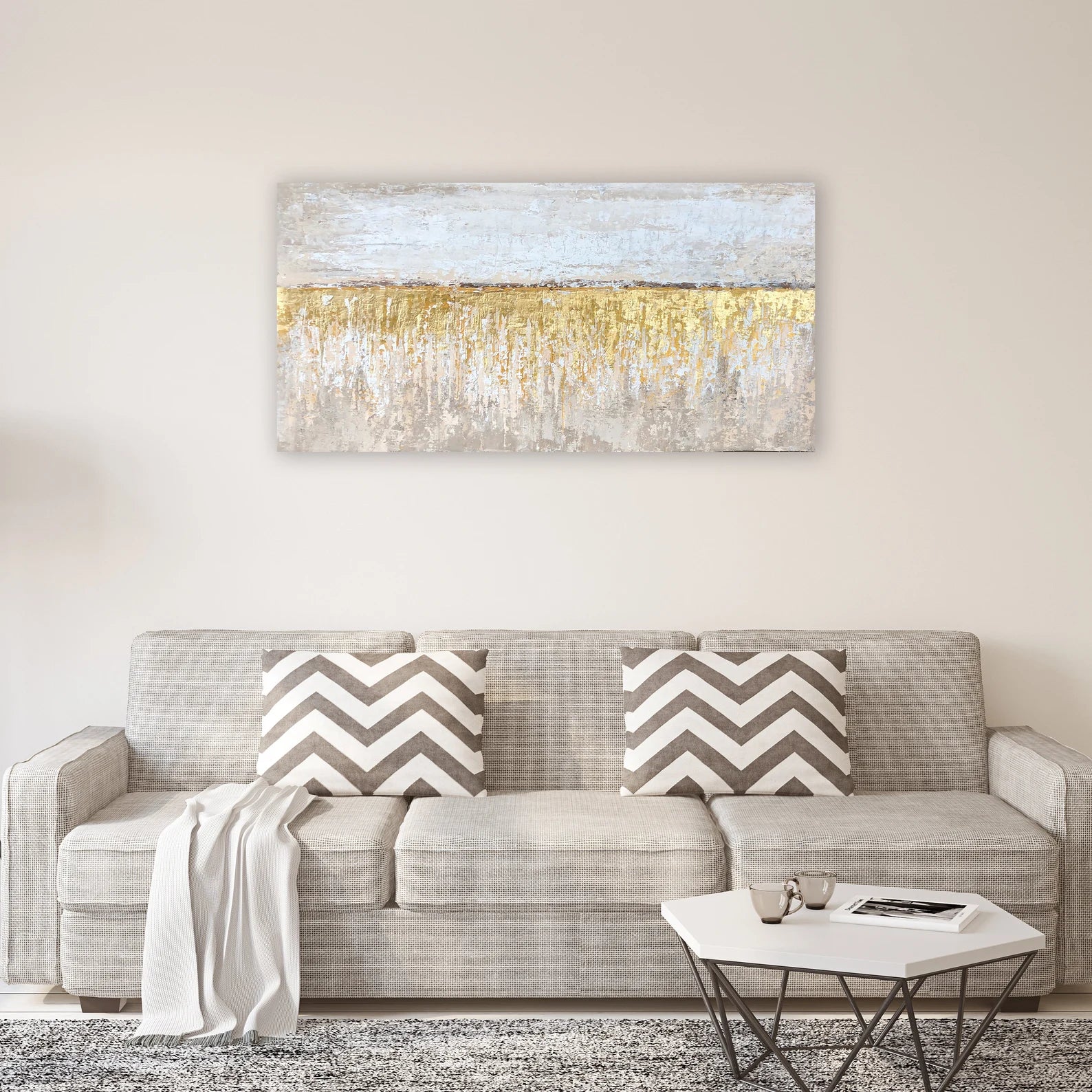 Marrying modern and glamorous styles, this oil painting is sure to grab glances (and compliments!) in any arrangement. This artful accent showcases a contemporary abstract image in GOLD and gray that blend easily with a variety of color palettes and aesthetics. this piece is hand-painted on canvas and stretched over wooden bars for a gallery-wrapped look. Since it measures 27.5'' H x 55'' W x 1.5'' D overall, this generously sized design is perfect for sprucing up wide-open walls. Wall-mounting hardware is included.