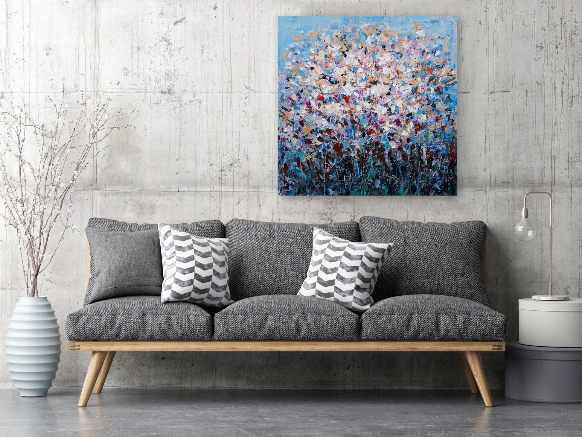 This beautiful piece of hand-painted contemporary artwork was made using oil paints on canvas. Perfect for your living room, dining room or even your office space.