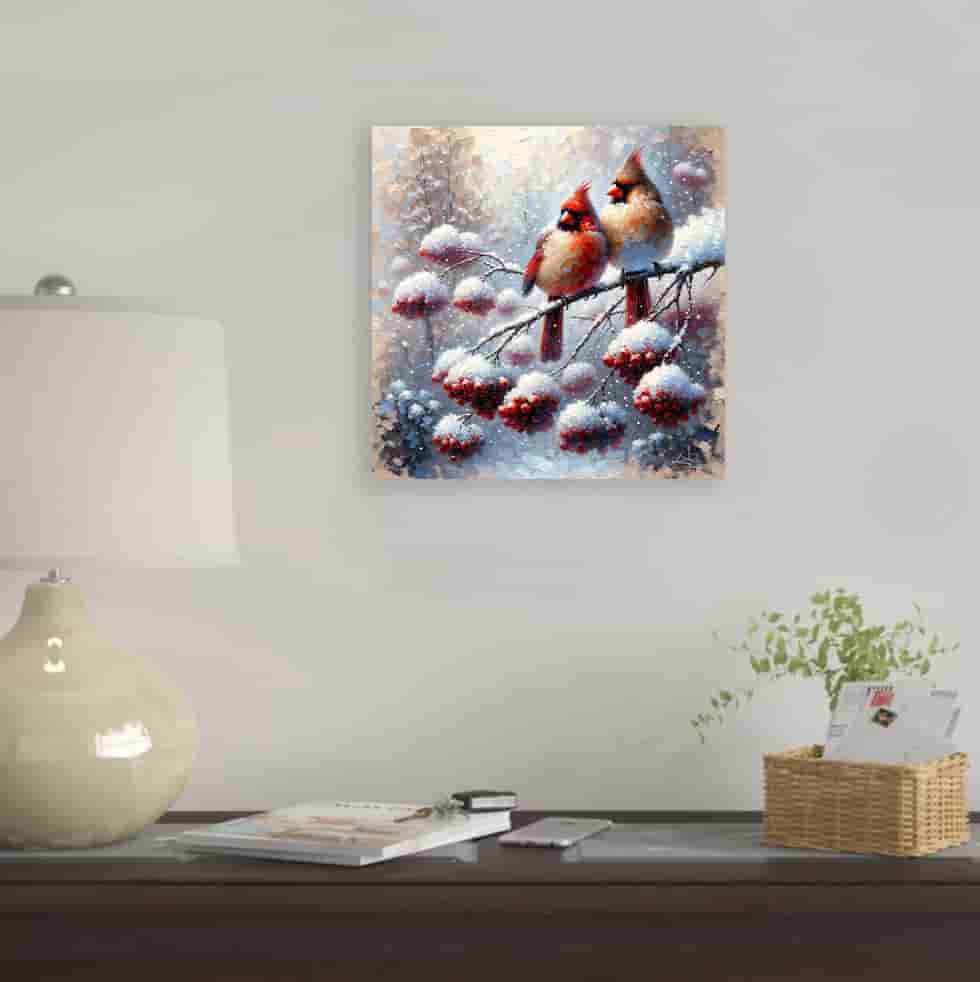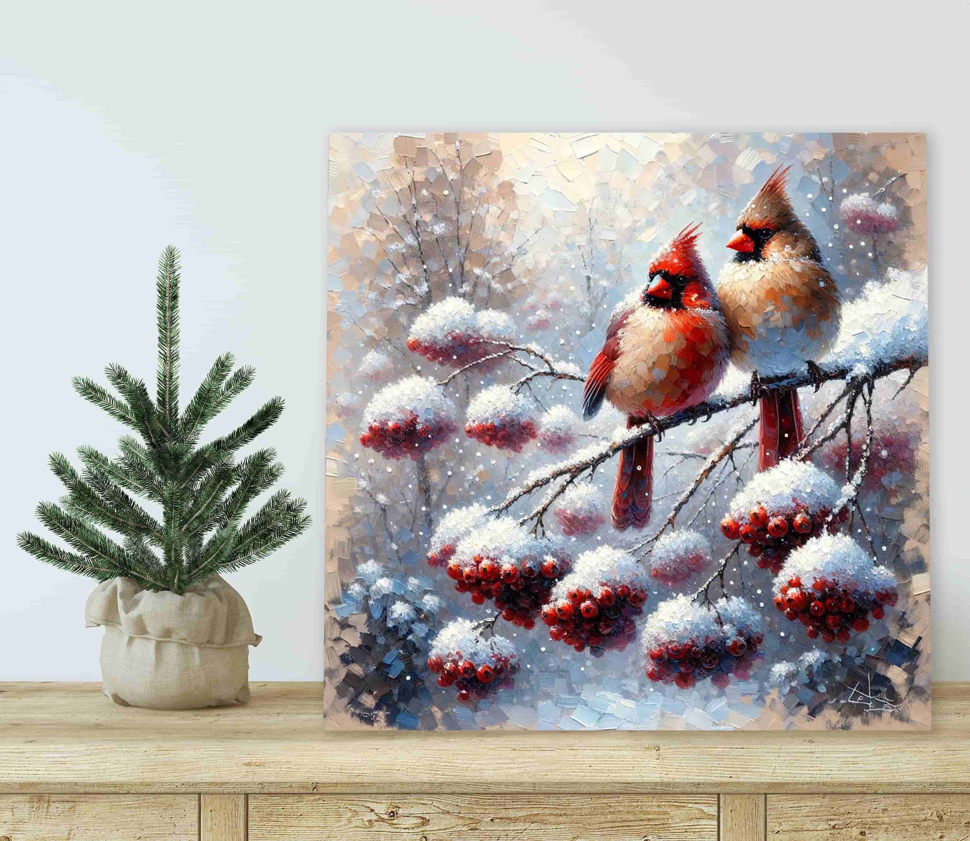 Bring the elegance of winter indoors with "Frosted Serenade," and let the quiet beauty of the cardinals sing to you throughout the season. Available now, this canvas print is a timeless testament to nature's artistry, waiting to grace your walls with its peaceful presence.