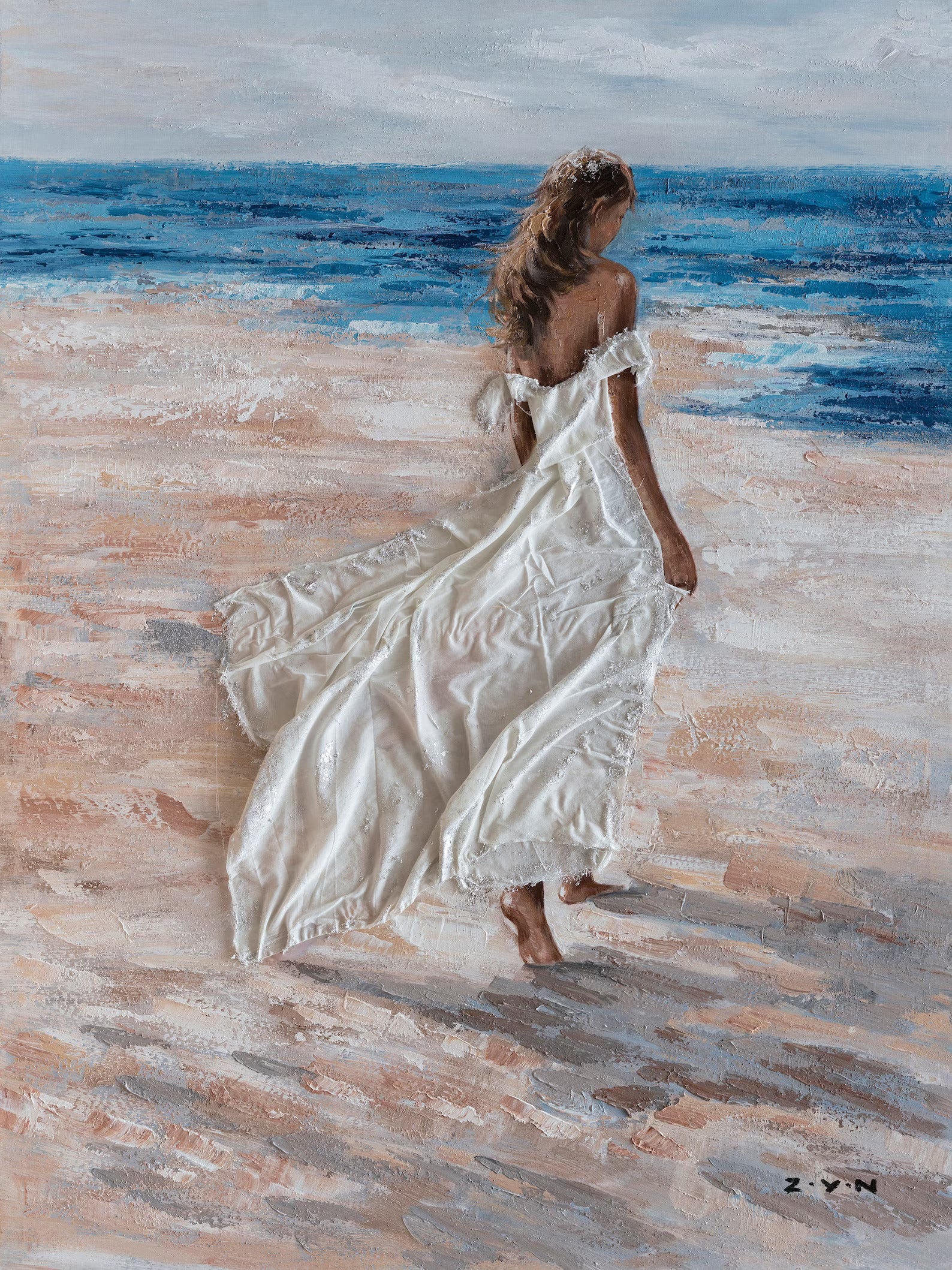 Experience the serenity of the beach with the "Barefoot Girl on the Beach" original oil painting. The artist's magical brush depicts a graceful girl walking barefoot on the sand with her white skirt and long brown curly hair swaying in the sea breeze. With her head slightly lowered and a shy demeanor, the girl's healthy complexion perfectly complements the serene surroundings of the flat sand beach and the calm blue sea water on the horizon.