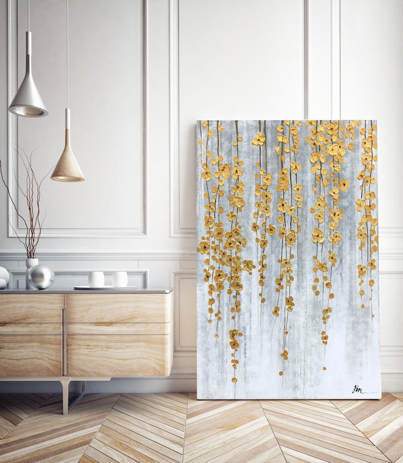 "Golden Drift: A Contemporary Hand-Painted Abstract Art of Naturally Drooping Flowers" a stunning hand-painted abstract artwork featuring naturally drooping golden flowers. This masterpiece was crafted by a contemporary artist using golden pigments and adorned with gold foil, making the entire piece shimmer with a 3D effect.The artist painted delicate, willow-like branches in soft brown hues, skillfully using a painting knife to sculpt thick golden paint into the shape of petals. The finishing touch is the brown stamen in the middle of each flower, adding a level of realism to the painting.In the light gray and white background, the soft branches appear to be swaying in the wind, creating a sense of movement and liveliness. This artist's brilliance is in making a static oil painting feel dynamic and alive.This beautiful and elegant oil painting features varying lengths of brown soft branches, with bunches of golden flowers adding to the overall allure. Whether you're a professional designer looking for a unique work of art or an art lover seeking to add to your collection, "Golden Drift" is a must-have piece.Perfect for hanging in any space, from living rooms to bedrooms, entrances to offices, dining rooms to bathrooms, and bars, this painting will bring a gallery-like effect and enhance the luxury of your surroundings. Surprise your family and friends with this exceptional work of art.Our small art studio based in California also accepts custom paintings. If you want to commission a painting in a different size or with a unique design, please leave us a message. Our artists will work with you to create a one-of-a-kind piece tailored to your vision.