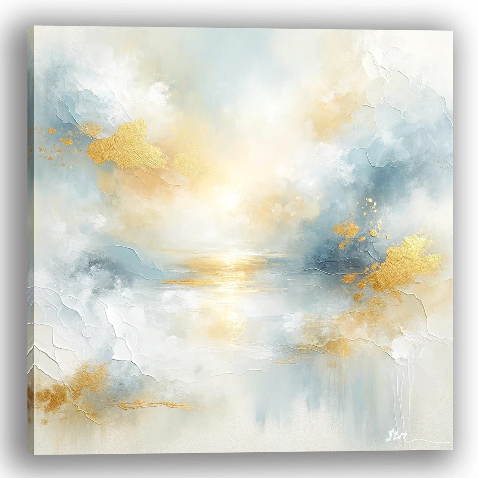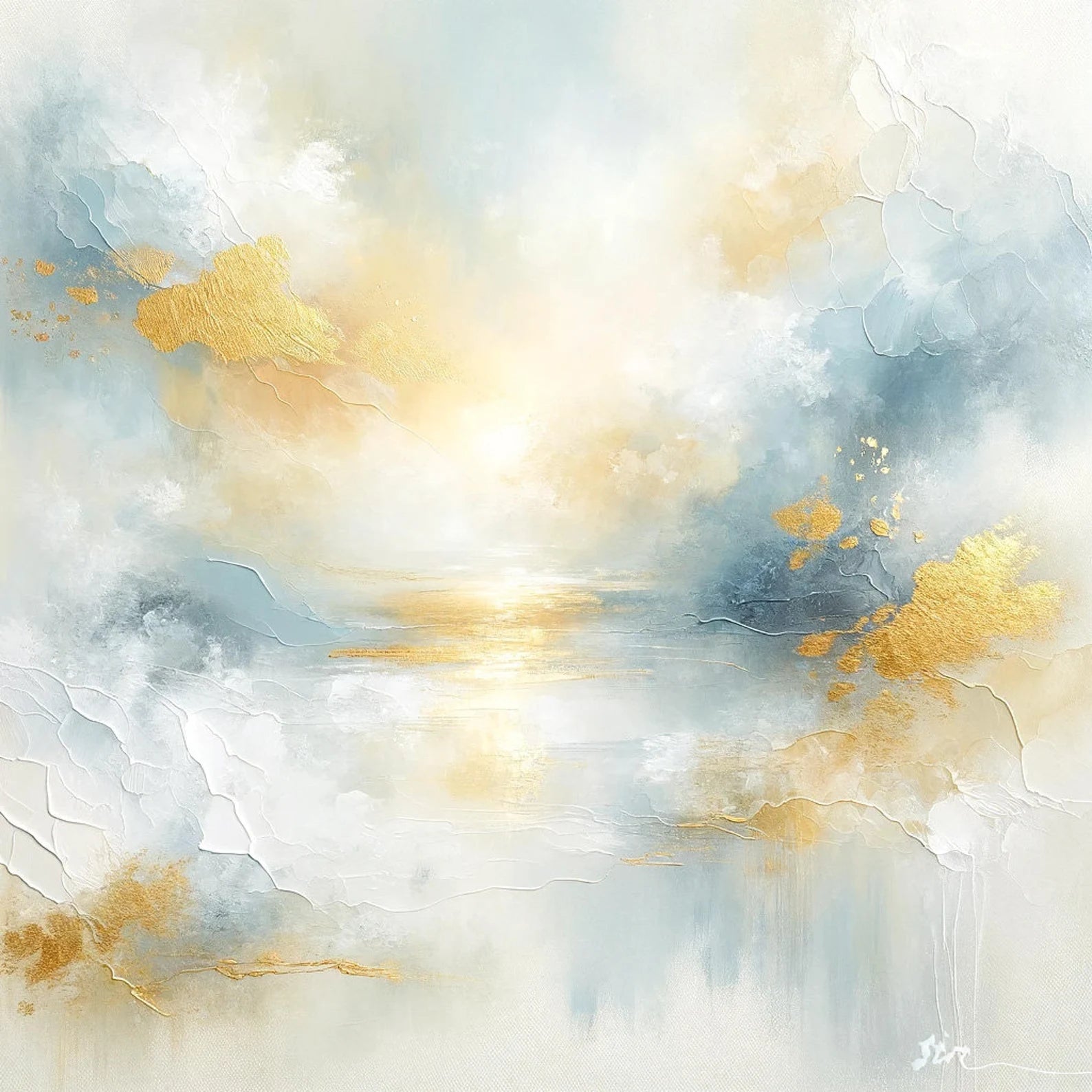 This exquisite hand-painted abstract art piece captures the essence of tranquility through its gentle interplay of golden and azure hues. What sets this painting apart is its unique textural quality, achieved through the use of mixed media, which invites not only visual pleasure but also a tactile experience. The gold leaf accents add a luxurious dimension, making it a statement piece for any modern home. Each brushstroke carries depth and emotion, creating a landscape that’s both ethereal and grounding.