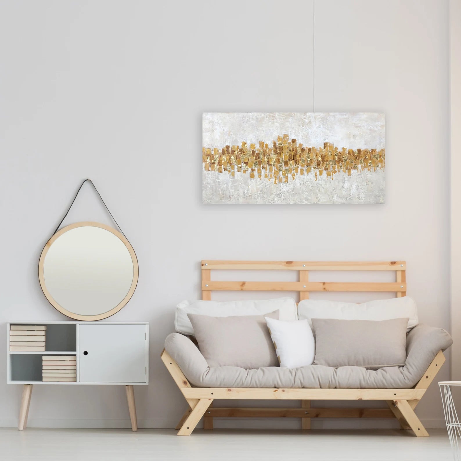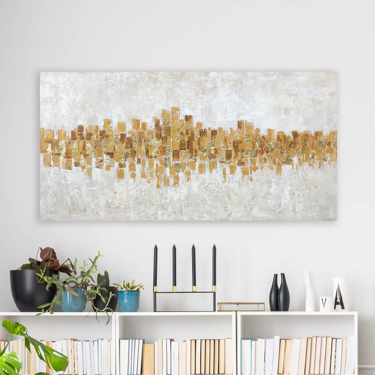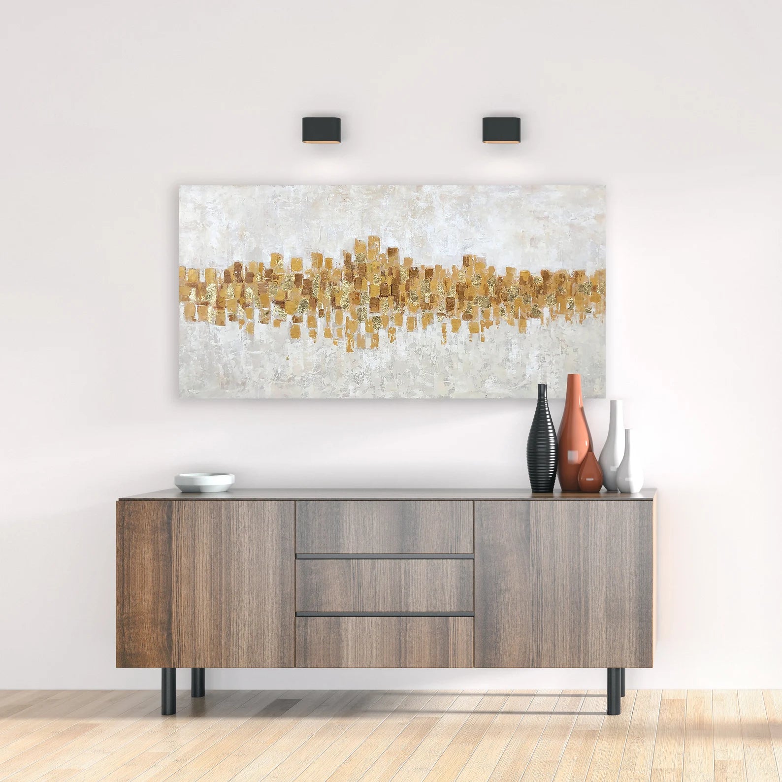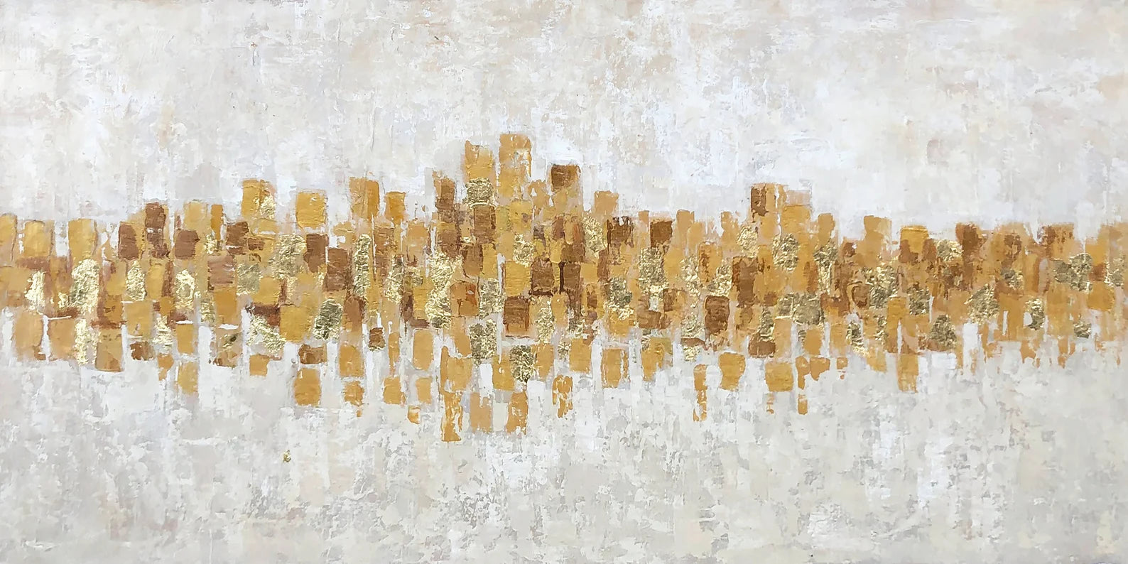 Marrying modern and glamorous styles, this oil painting is sure to grab glances (and compliments!) in any arrangement. This artful accent showcases a contemporary abstract image in GOLD and gray that blend easily with a variety of color palettes and aesthetics. this piece is hand-painted on canvas and stretched over wooden bars for a gallery-wrapped look. Since it measures 27.5'' H x 55'' W x 1.5'' D overall, this generously sized design is perfect for sprucing up wide-open walls. Wall-mounting hardware is included.