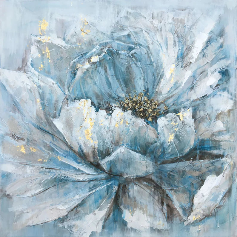 Overall, "Blue Serenity" is a striking and unique piece of original artwork that captures the essence of a flower in an abstract and modern way. The thick texture and use of gold leaf decorations add depth and character to the painting, making it a great addition to any living room, bedroom, or office space.