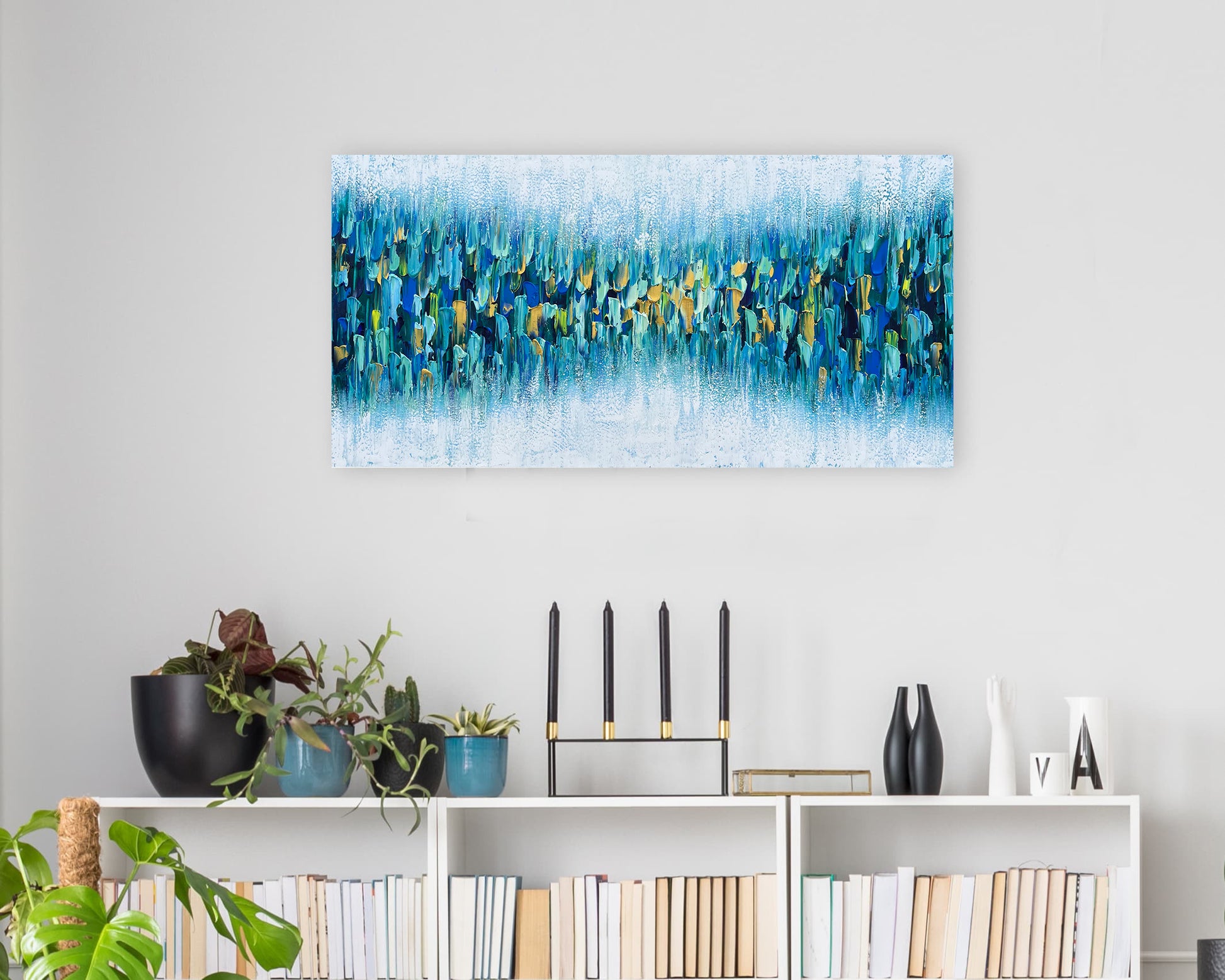 "Blue Haven" is a transcendent piece of art that captures the tranquil depths of a celestial sea. This painting is a harmonious blend of azure and sapphire, with gentle streaks of gold that cascade down the canvas like sunbeams piercing through ocean waves. The colors flow together in a soothing rhythm, creating a sanctuary of calm for the viewer.