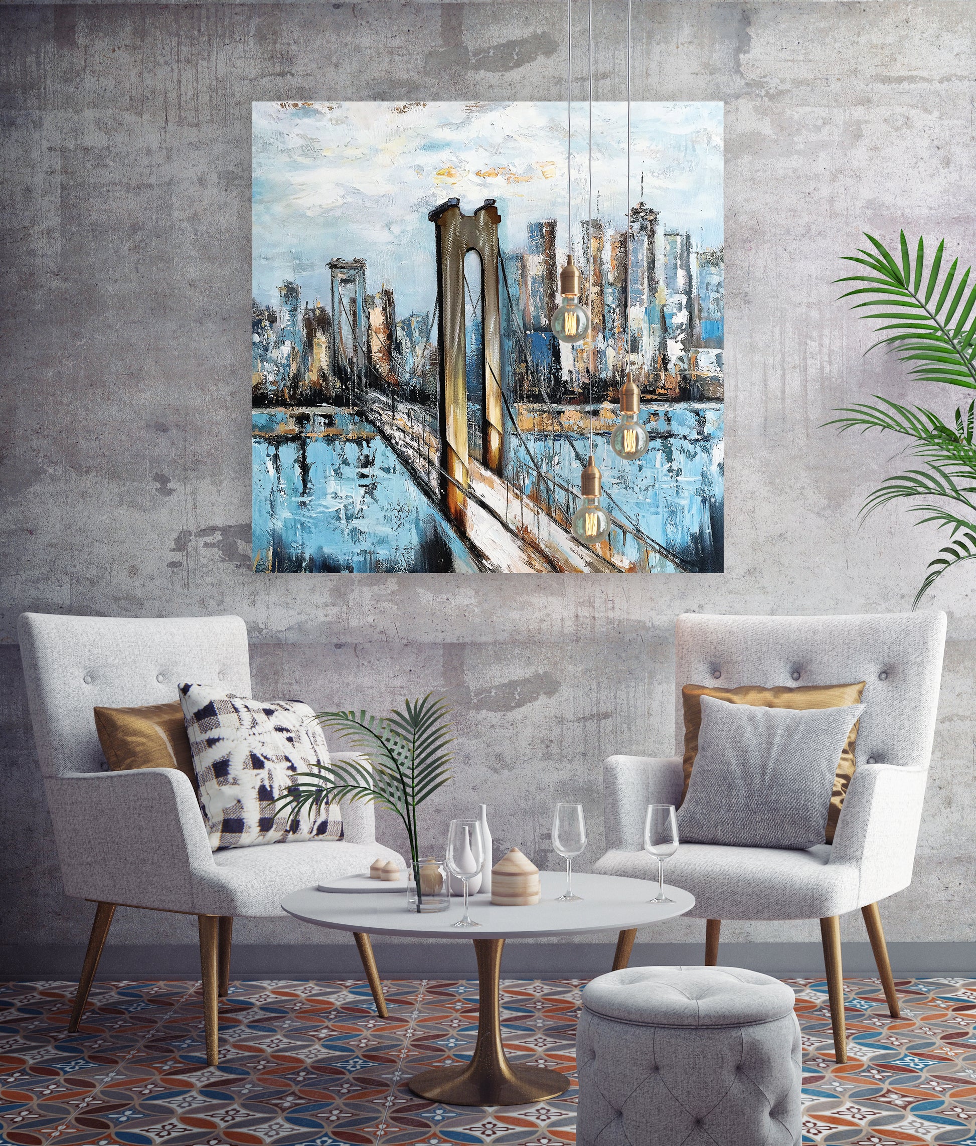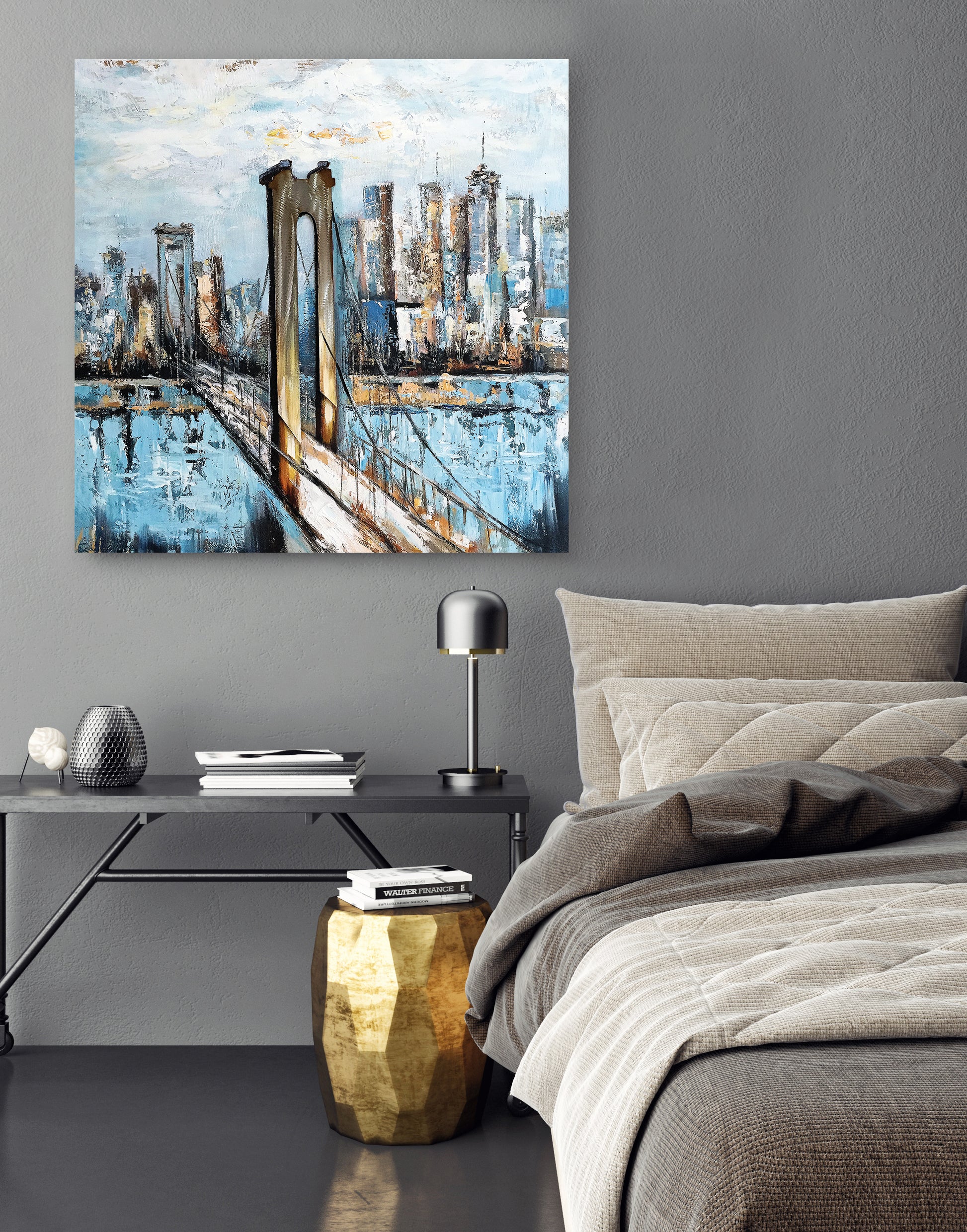 Original art "Urban Escape" - Hand-Painted Cityscape with Bridge, Textured Skyline Impasto, Metropolitan Decor Art