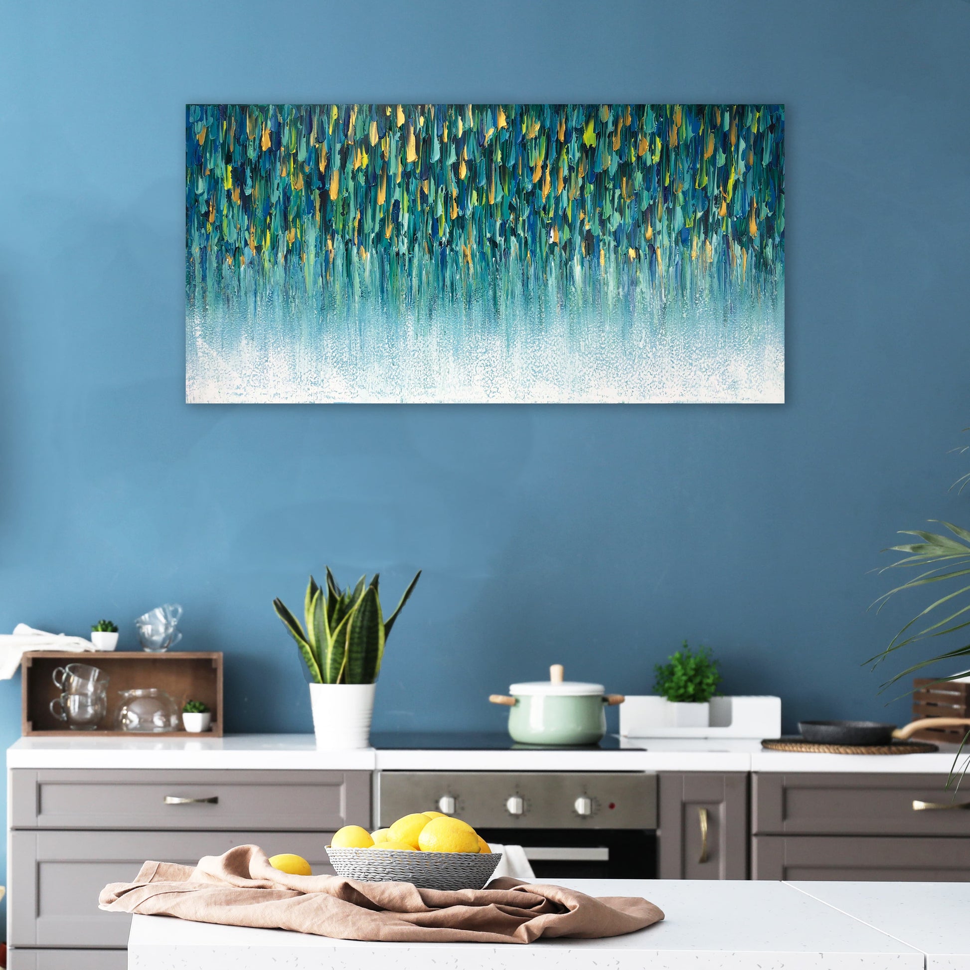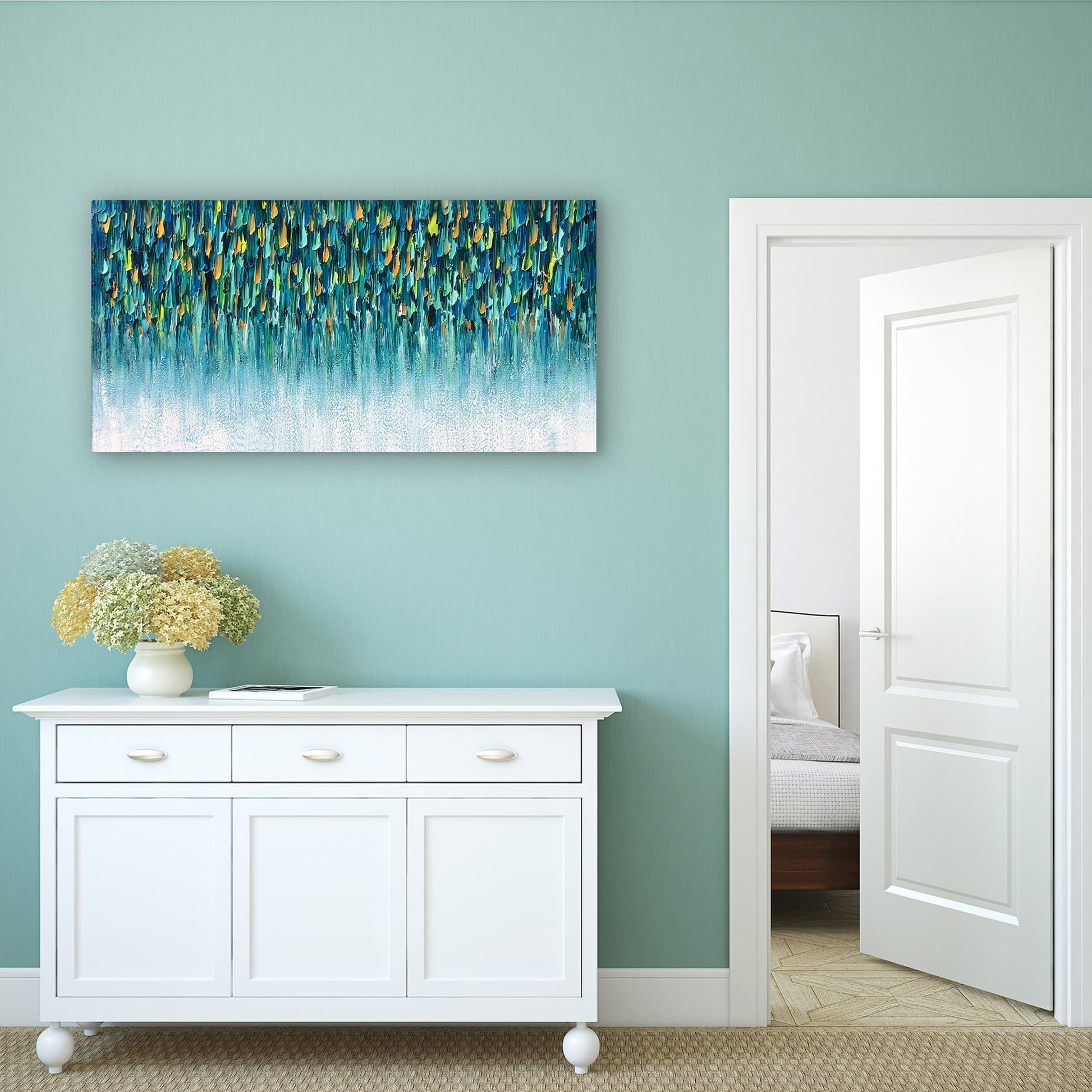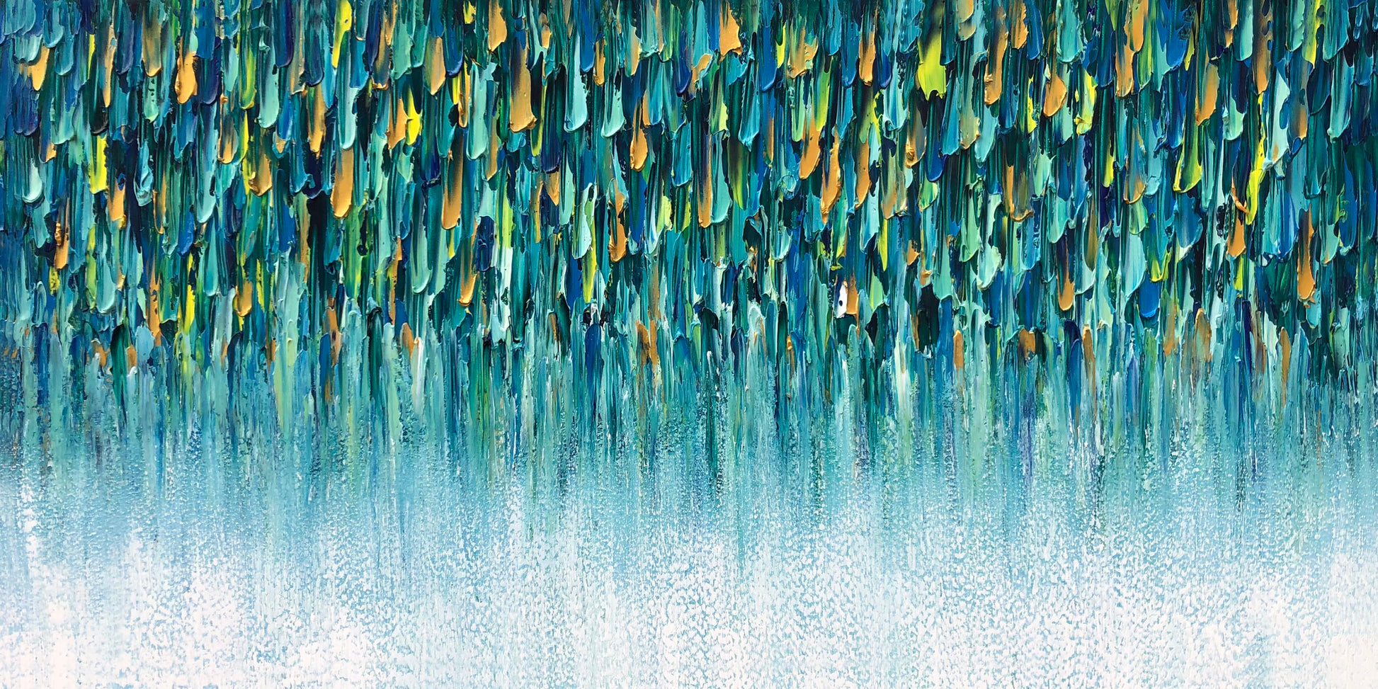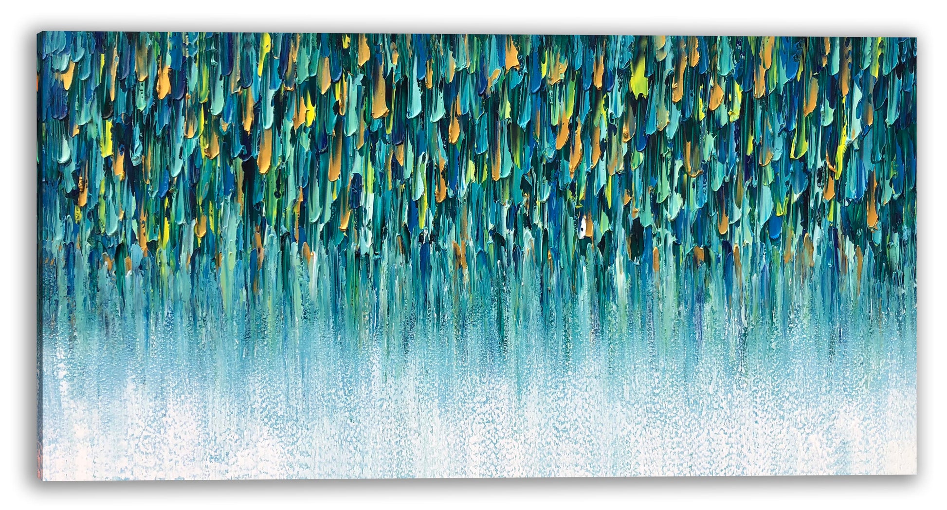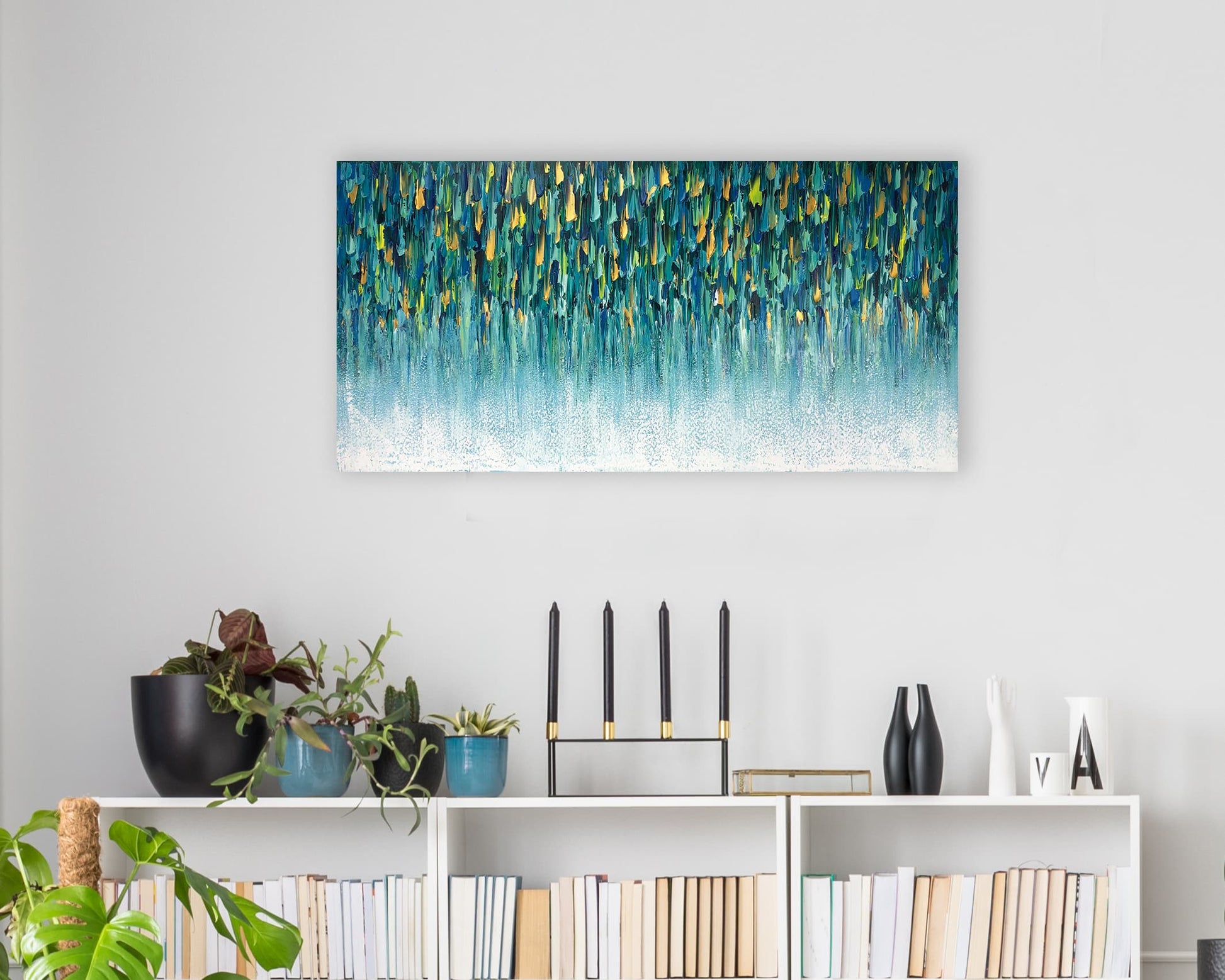 "Cascade of Dreams" is an entrancing painting that captures the imagination with its vibrant flow of colors. Like a waterfall of creativity, this artwork spills an array of blues and greens across the canvas, accented by hints of golden yellow that glisten like the morning sun on dew-kissed foliage.