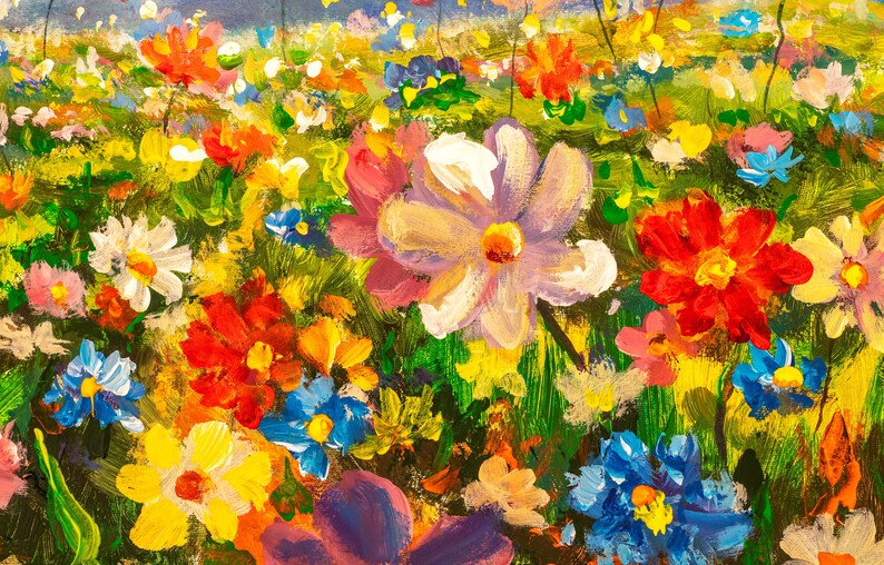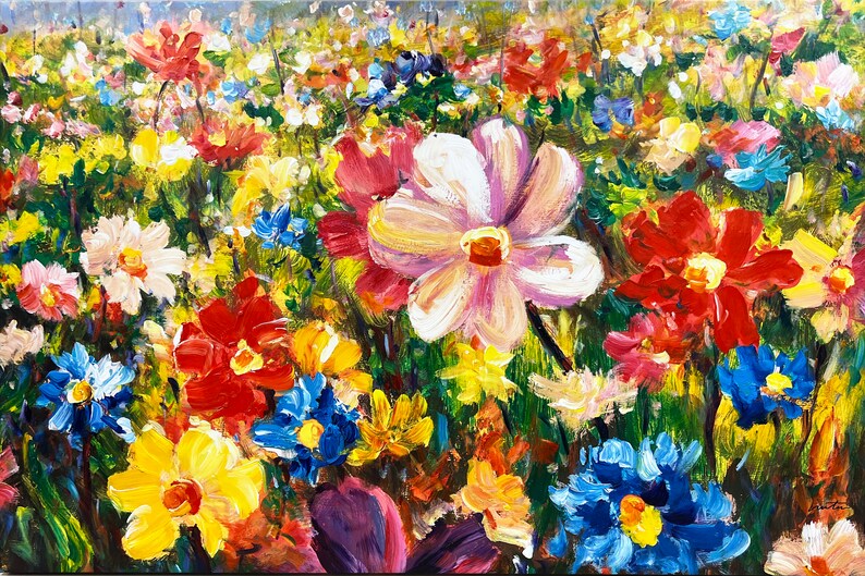 Bring the beauty of spring into your home with "Colorful Wildflowers", a stunning oil painting by the artist. This close-up depiction of blooming wildflowers on a lush green grass background is not only a feast for the eyes but also an expression of the artist's infinite creativity.