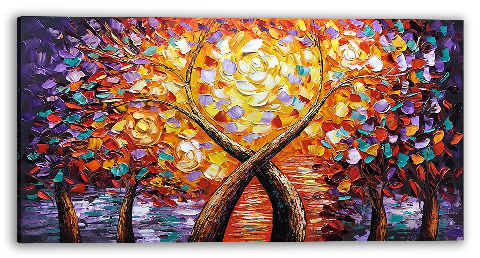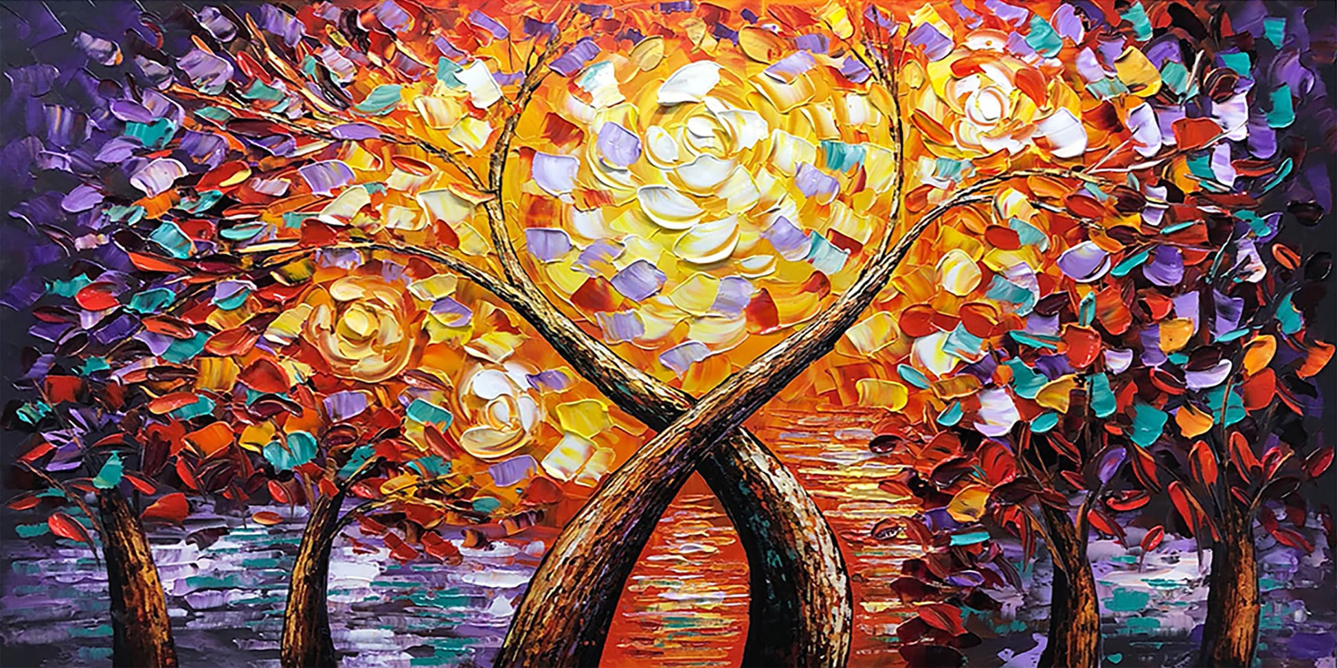 "Spectrum of Life" is a visually stunning masterpiece that celebrates the vibrant diversity and beauty of existence. Each stroke of paint is a bold declaration of color, a testament to life’s vivid spectrum. The interweaving branches of the trees serve as a metaphor for the interconnectedness of all living things, each leaf a different hue, yet part of the same tapestry.