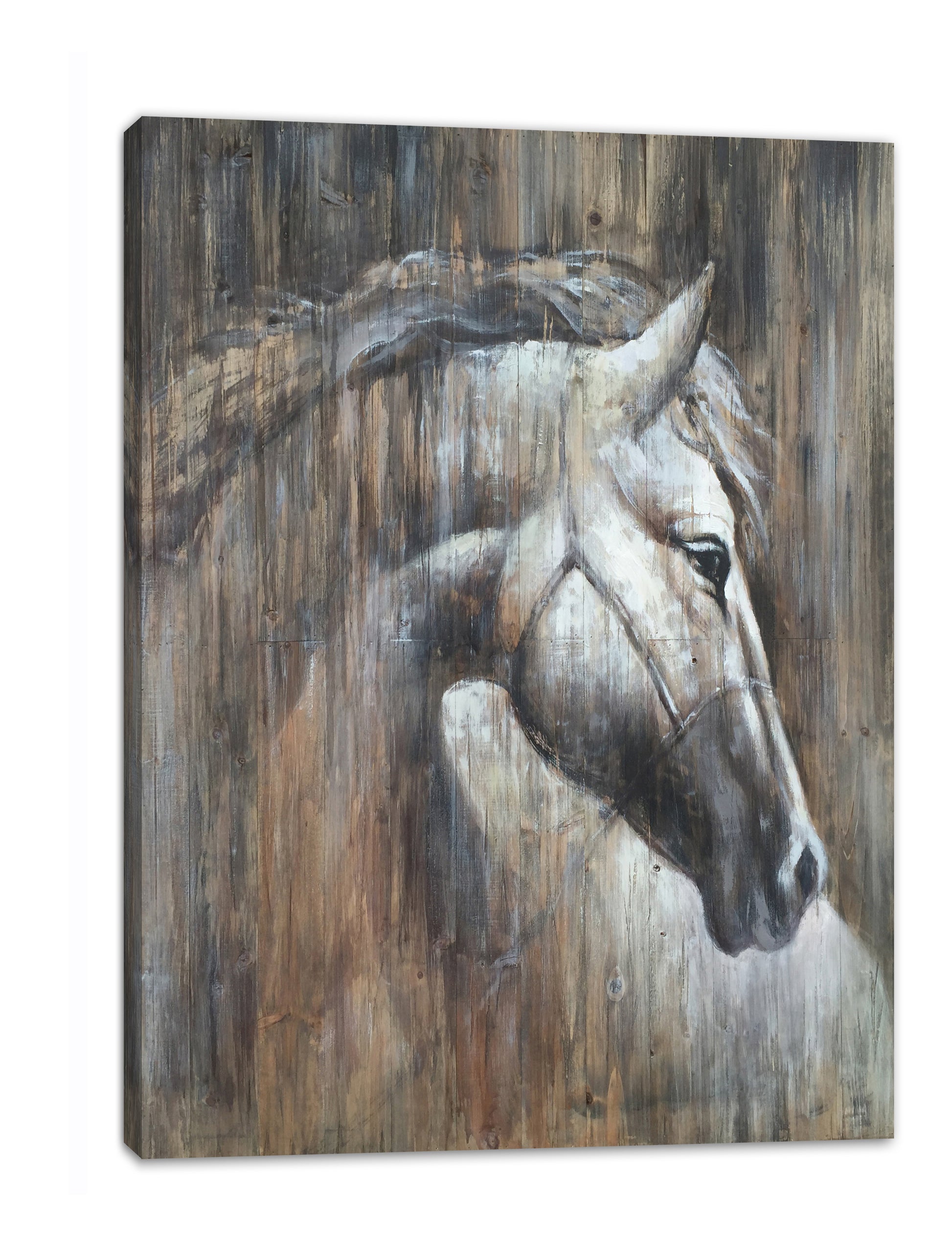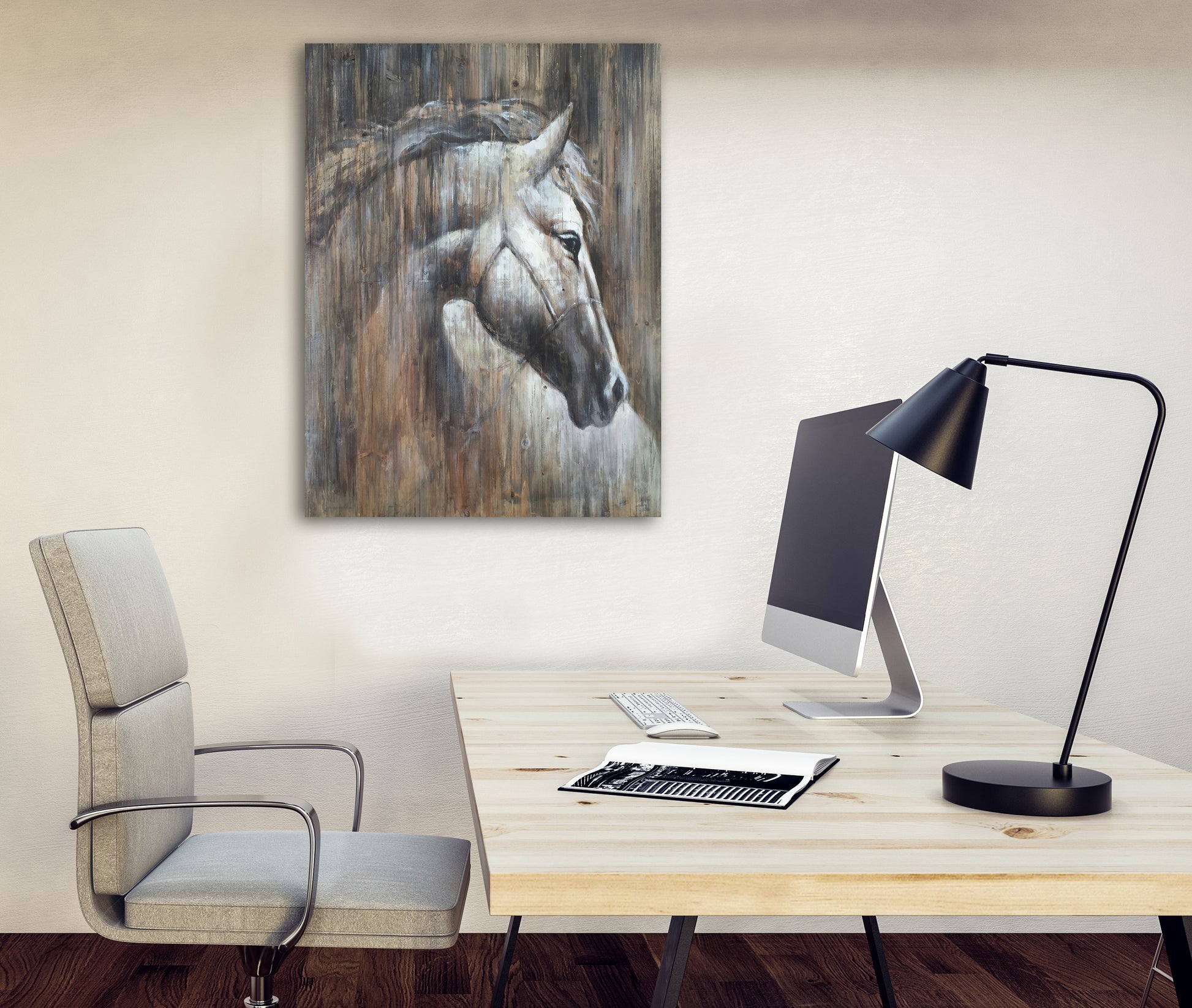 Bring rustic style to your living room, dining room, or home office with this distinctive wrapped painting. Entitled “Horse on the Wood” this rectangular oil painting is painted on canvas, and stretched over a wooden frame. It features the profile of a horse in shades of gray and brown, with a technique that mimics the look of distressed wood planks. This piece comes with wall mounting hardware, so it’s easy to hang vertically over your sofa, dining room table, or desk.