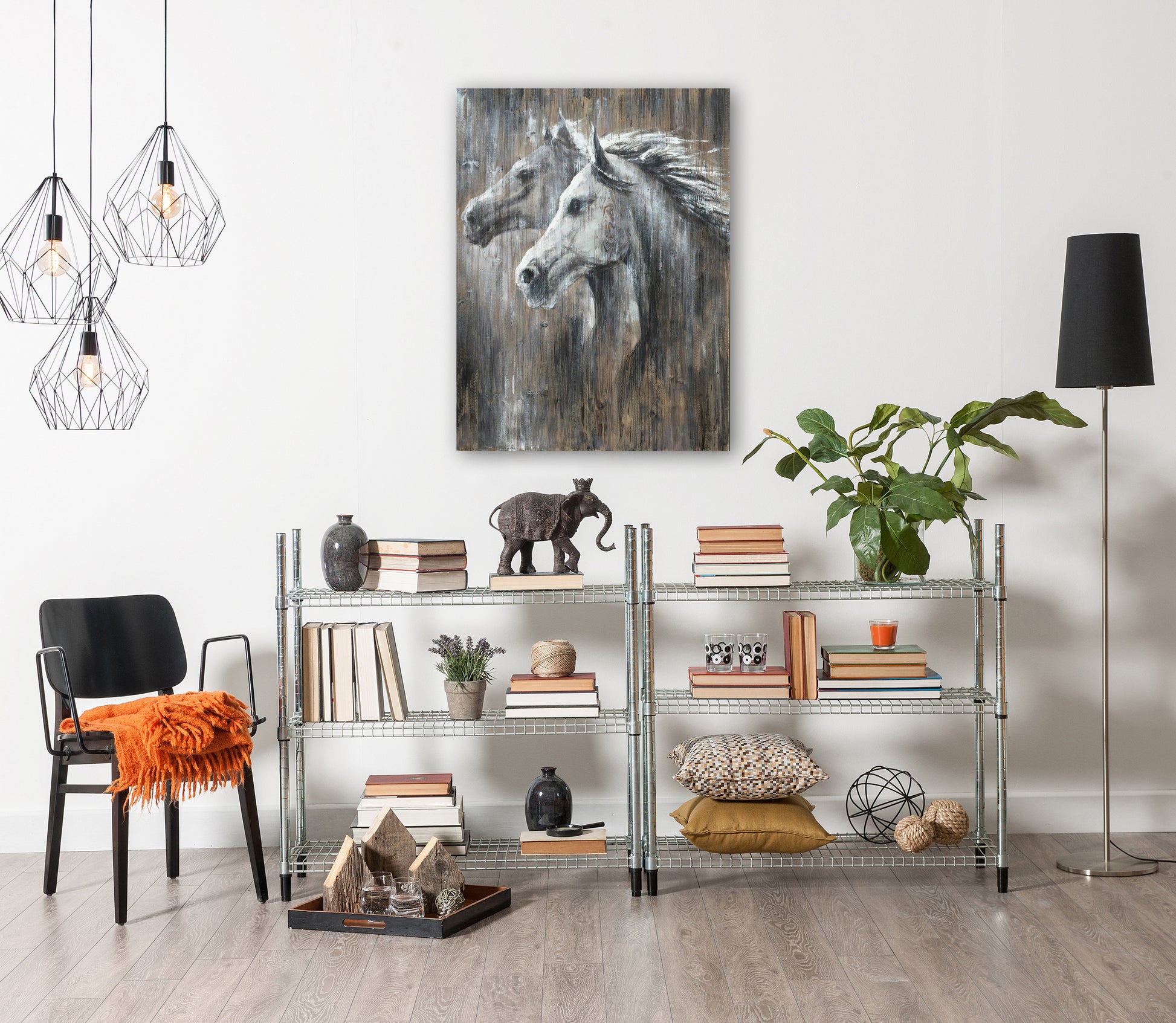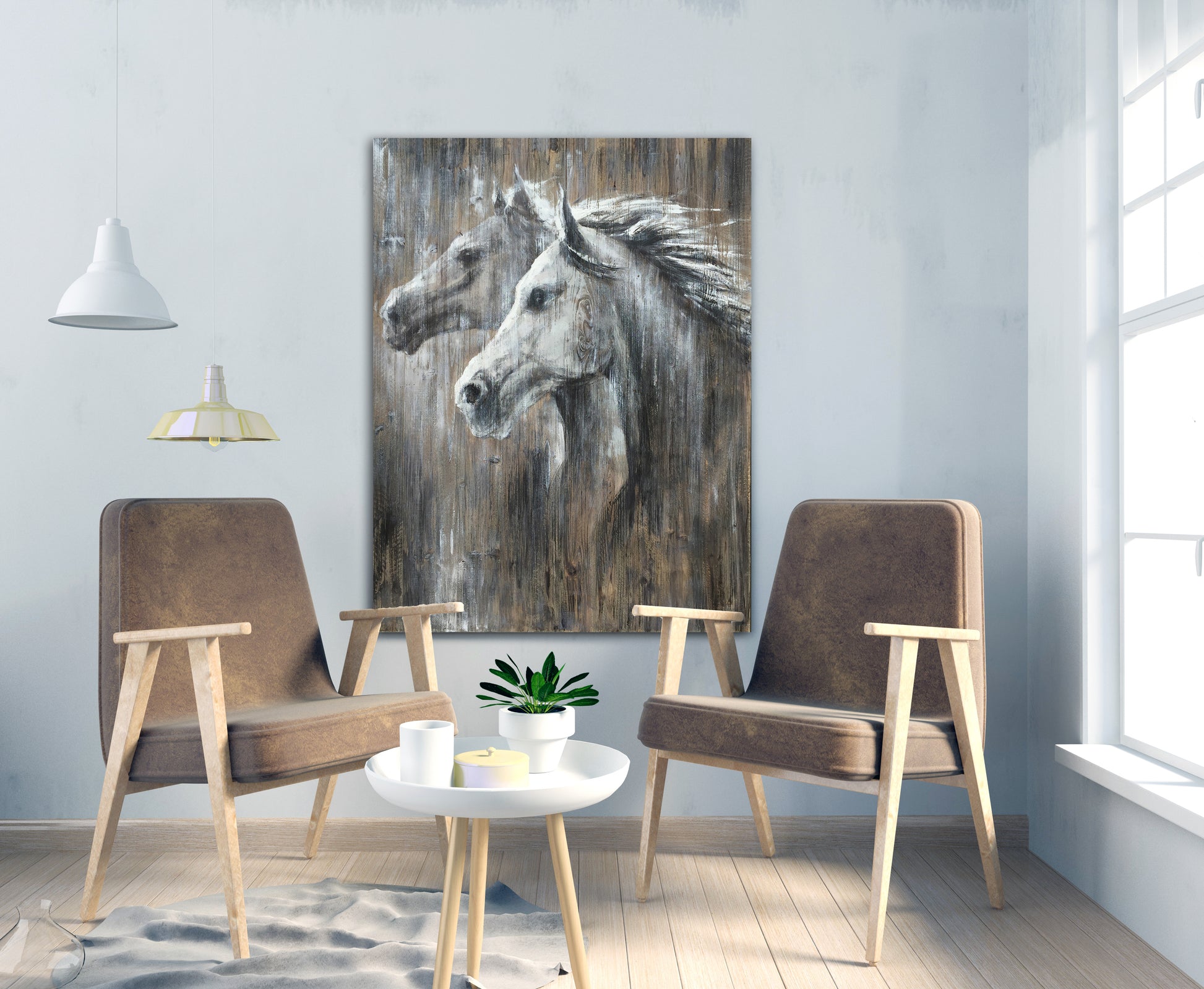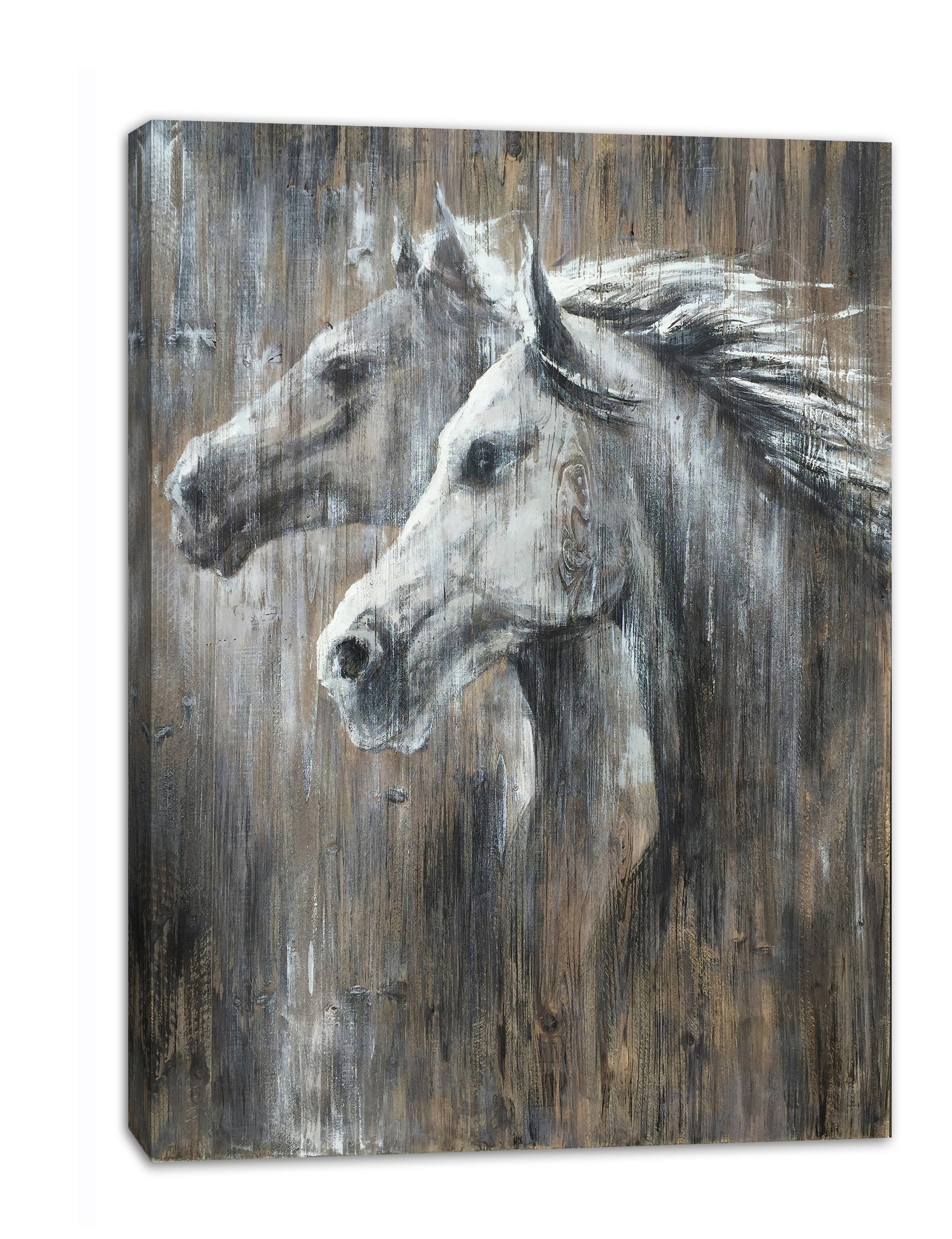 Bring rustic style to your living room, dining room, or home office with this distinctive wrapped painting. Entitled “Western Horse I,” this rectangular oil painting is painted on canvas, and stretched over a wooden frame. It features the profile of a horse in shades of gray and brown, with a technique that mimics the look of distressed wood planks. This piece comes with wall mounting hardware, so it’s easy to hang vertically over your sofa, dining room table, or desk.