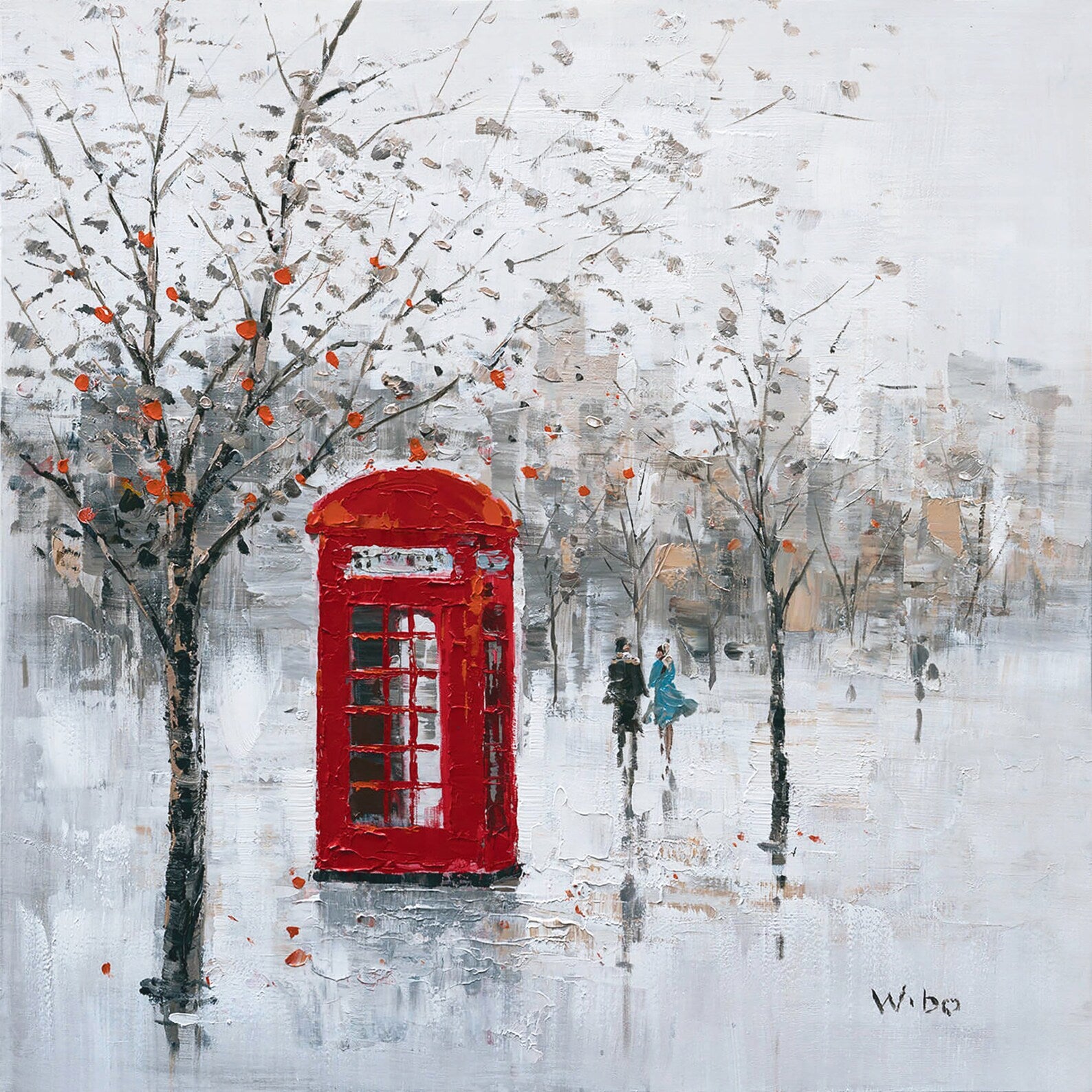 Introducing "Telephone Booth in the Wind" - a breathtaking hand-painted oil painting that captures the essence of urban solitude and isolation. This exquisite artwork depicts a solitary red telephone booth standing on the roadside, with sparse autumn leaves swirling in the wind around it. The attention to detail is truly remarkable, from the texture of the booth's metal surface to the delicate branches of the nearby trees.