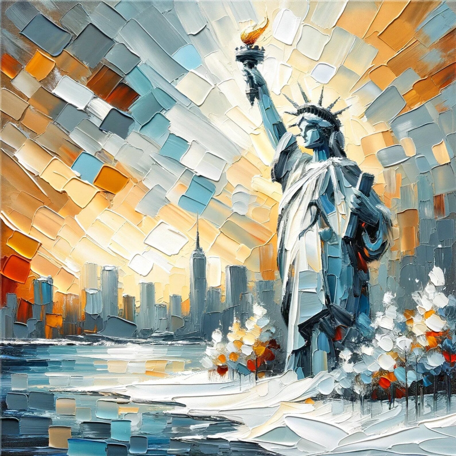 This exquisite piece of art combines modern impasto techniques with iconic imagery to create a captivating depiction of the Statue of Liberty against the New York City skyline. The textured oil painting, sized at 30x30 inches, is hand-painted on a high-quality wrapped canvas that brings life and depth to any space it adorns. Its bold palette knife strokes and vibrant color contrasts evoke the energy and spirit of the city, making it an ideal statement piece for urban home decor enthusiasts. Each canvas is meticulously crafted, ensuring a unique and original masterpiece that can transform your living space or office with its dynamic visual impact. This artwork is not just a decoration; it's an investment in handcrafted artistry that stands out and speaks to the soul of New York.