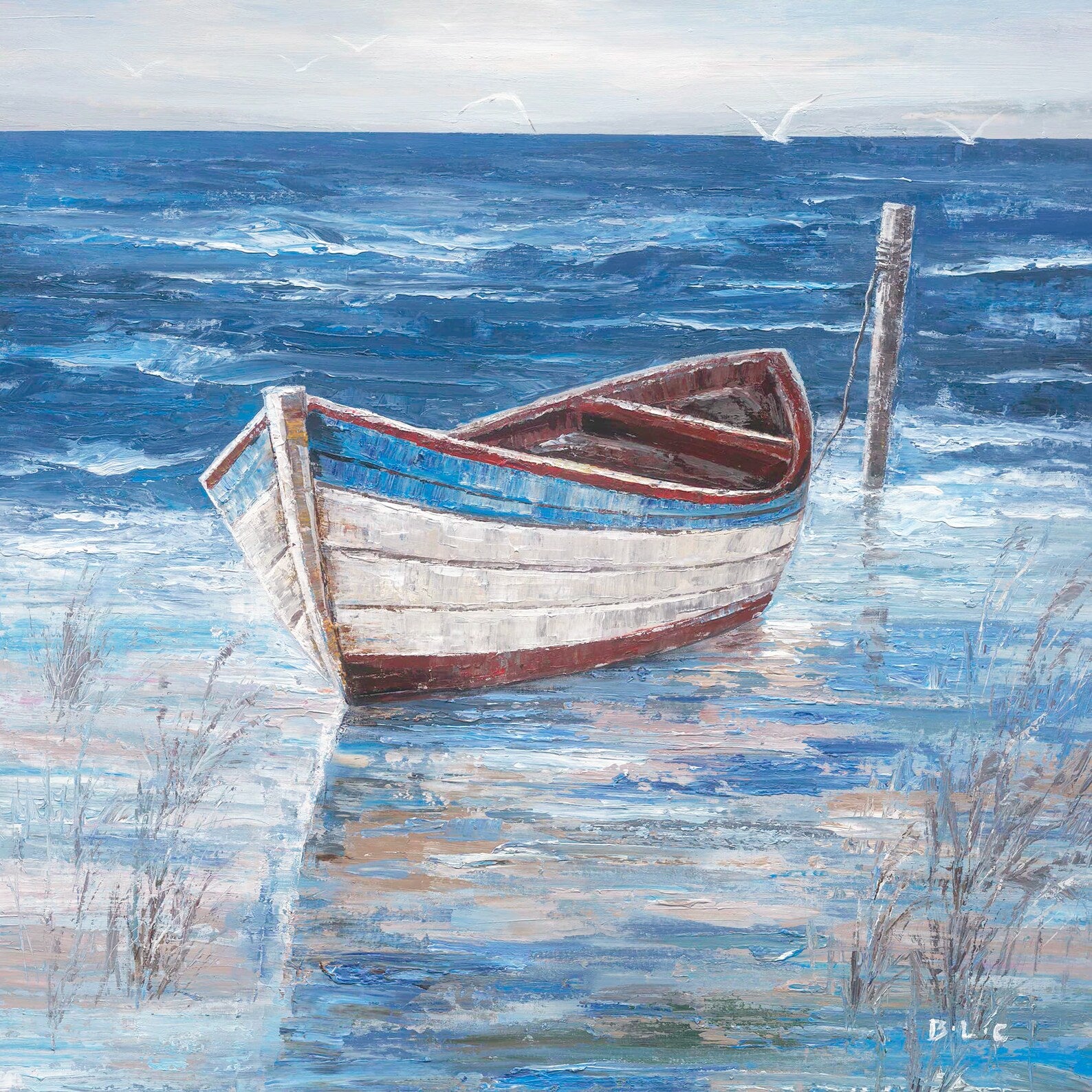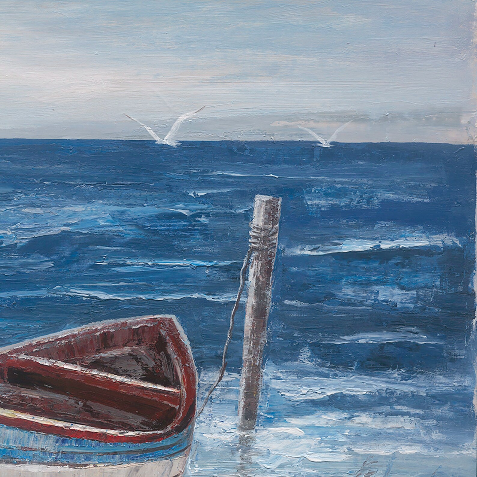 Transform your space into a captivating coastal retreat with our exquisite 'Blue Boat by the Sea' painting. This stunning hand-painted artwork beautifully captures the serenity of a small boat gently anchored by the sea, its reflection shimmering in the tranquil waters, and graceful seagulls soaring in the distance. The artist skillfully combines shades of blue to create a harmonious composition, accentuated by the contrasting red interior of the boat's hull and the vibrant blue exterior. The coastal and sea come alive, while the expansive blue vistas add depth and a touch of enchantment.