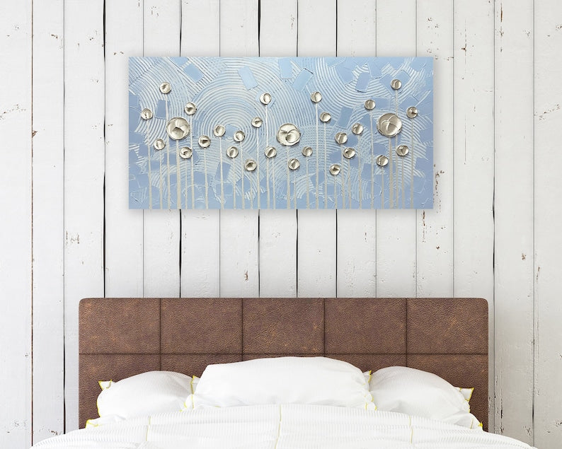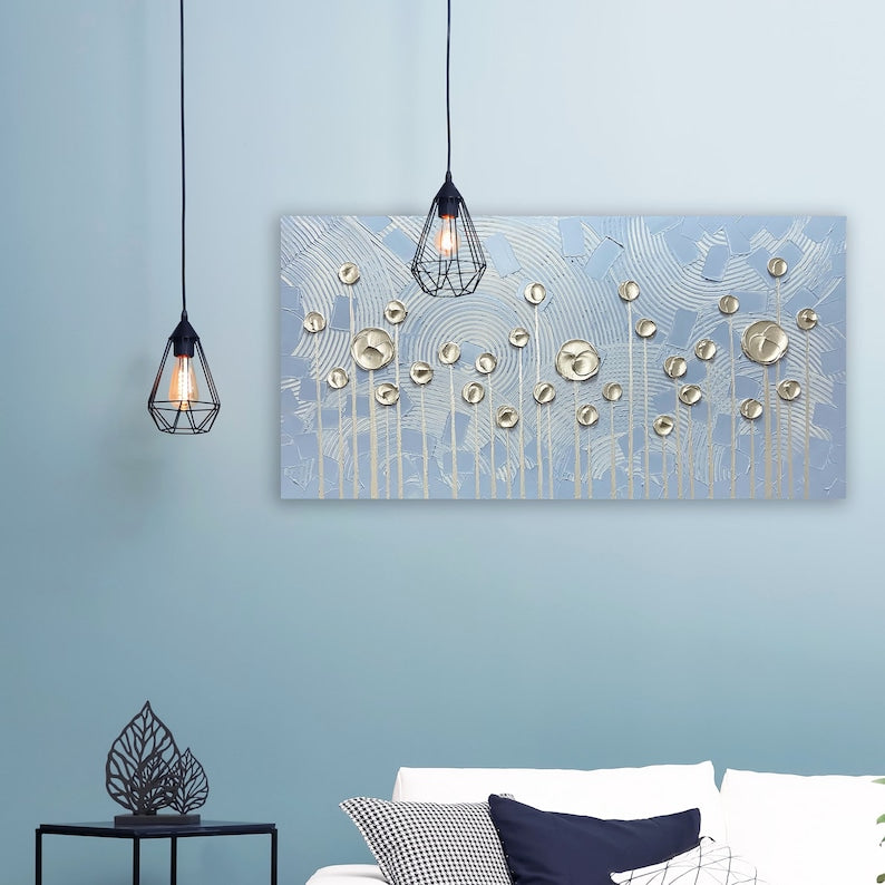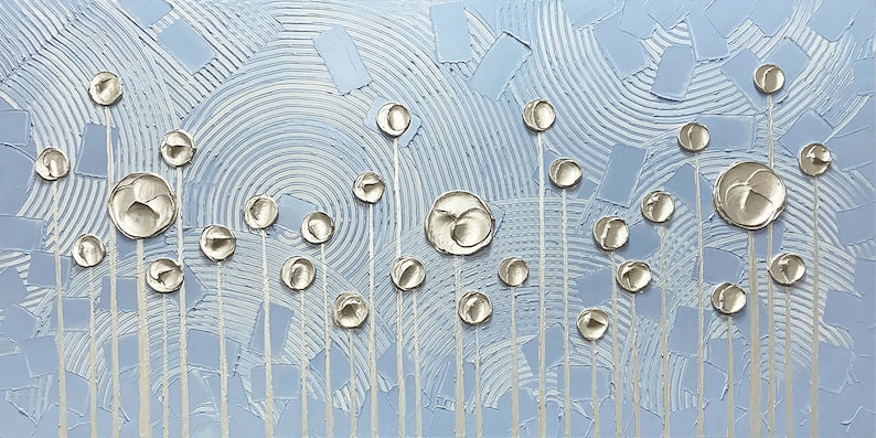 Transform your space with the elegant and stylish "Golden Abstract Flowers" oil painting. This hand-painted masterpiece masterfully blends modern and glamorous styles, creating an eye-catching accent that will complement any decor. Featuring stunning shades of gold and blue, the abstract design showcases blooming golden flowers against a backdrop of circular outlines, reminiscent of the rising sun. The artist's creative touch brings this abstract piece to life with their imaginative use of color and technique.Expertly crafted on canvas and stretched over wooden strips, this gallery-wrapped design is the perfect finishing touch for open walls. The painting is made with high-quality oil paints, ensuring long-lasting beauty and durability. Wall mount hardware is included for easy installation. Ideal for enhancing the look of your living room, dining room, office, or any other space that deserves a touch of contemporary art. Add this unique hand-painted masterpiece to your collection today.Custom paintings are now accepted. If you want to customize different sizes or pictures, please leave me a message. The artist will create and paint according to your ideas.