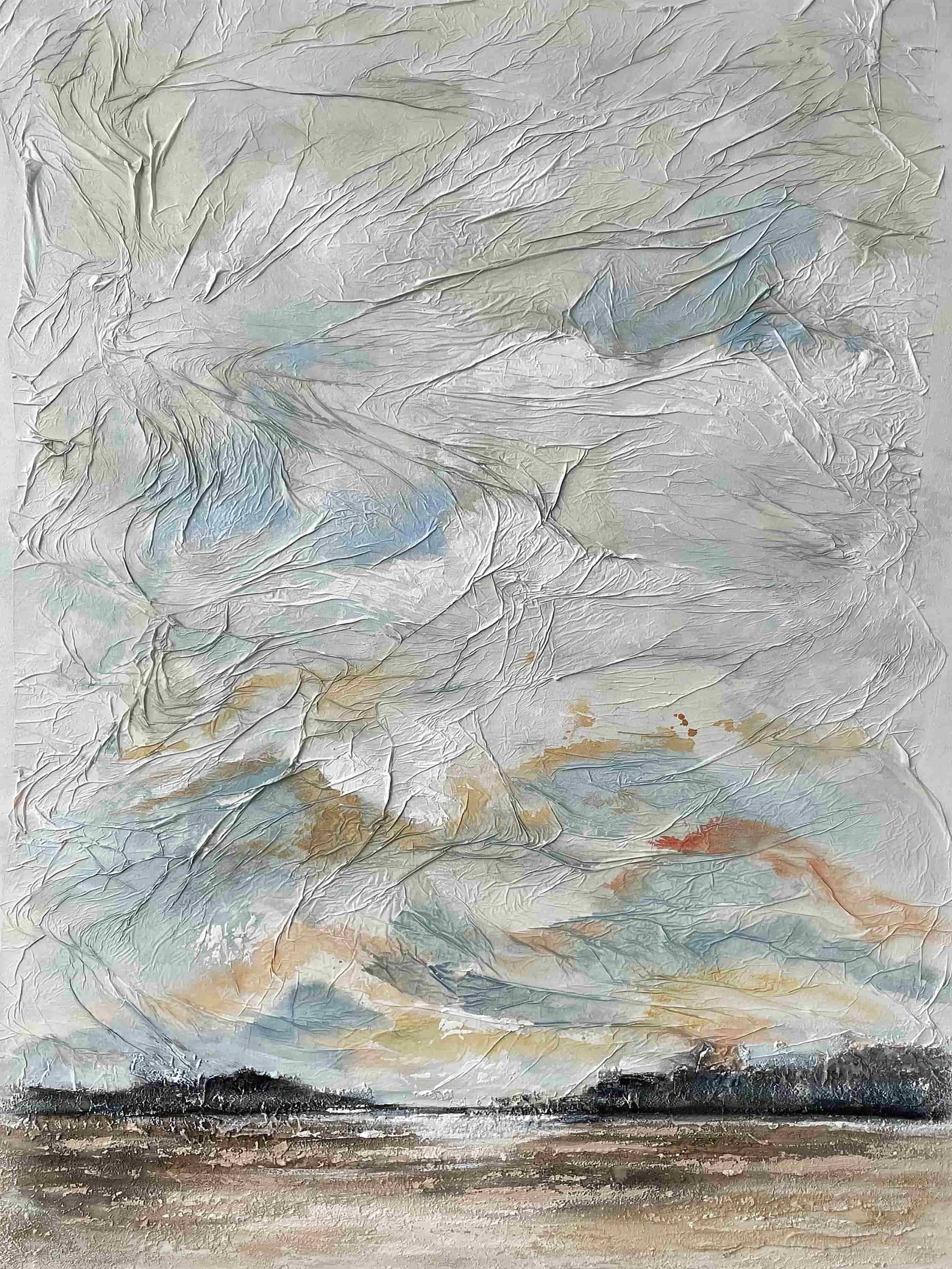 Above the expansive fields, the autumn sky stretches endlessly, its clouds painted in delicate, pale hues that seem to dance with the whispers of the wind. The artist's mastery of special techniques and materials brings forth a mesmerizing portrayal of the celestial canvas, immersing you in the vastness of the heavens.