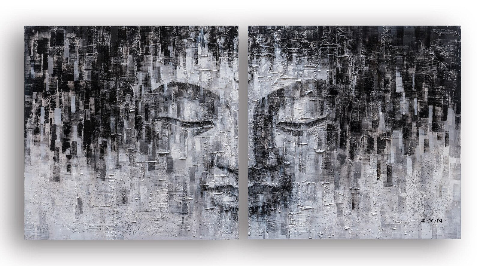 Find peace and contemplation in 'Whispers of Serenity,' a hand-painted diptych that eloquently expresses the tranquil visage of Buddha. Rendered in striking monochromatic tones, this textured abstract artwork brings a modern twist to a timeless symbol of serenity and mindfulness. Each panel is a canvas of exploration, featuring layered textures that invite the viewer to look deeper and find their own inner peace.