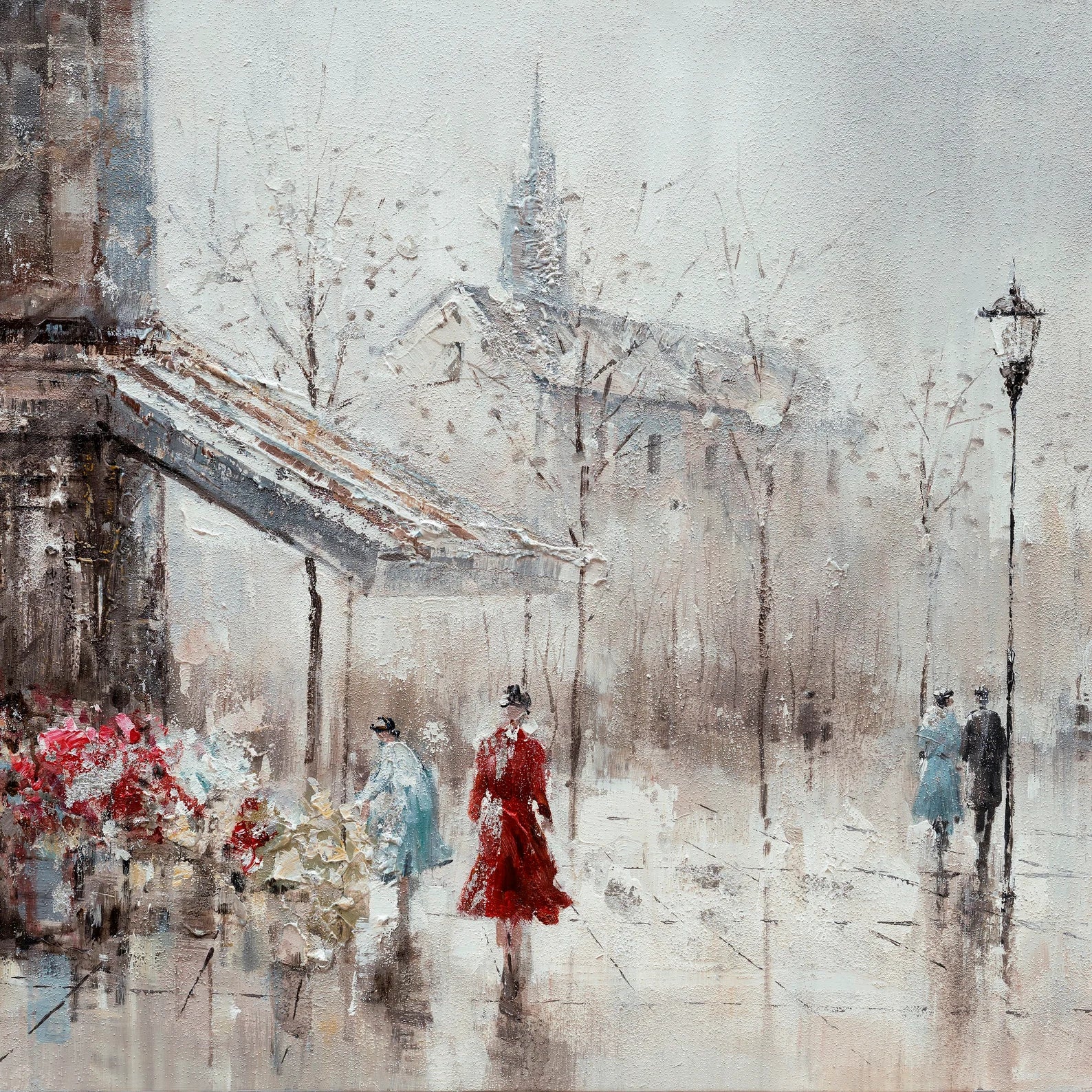 "Red Dress Rendezvous" is an original hand-painted oil painting on wrapped canvas. The artwork depicts a captivating and romantic scene of a woman in a stunning red dress passing a flower shop on a European street. The use of thick oil paints and gray tones creates a unique artistic texture, adding to the timeless charm of the painting.