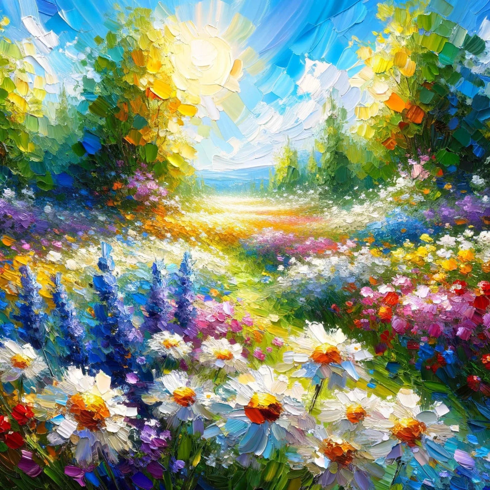 This Impressionist Meadow Bliss is not merely a painting; it's a portal to a world of perpetual spring. The tactile richness of its textured oil brush strokes brings each daisy and lavender bloom to life, inviting the touch of your gaze. Set against a pristine blue sky, this artwork sings a visual symphony of tranquility and vivid splendor. Perfect for collectors seeking a piece that radiates joy and complements any space with nature's timeless beauty. Own a canvas where each glance is a breath of fresh air and every viewing, a walk through an eternal meadow.