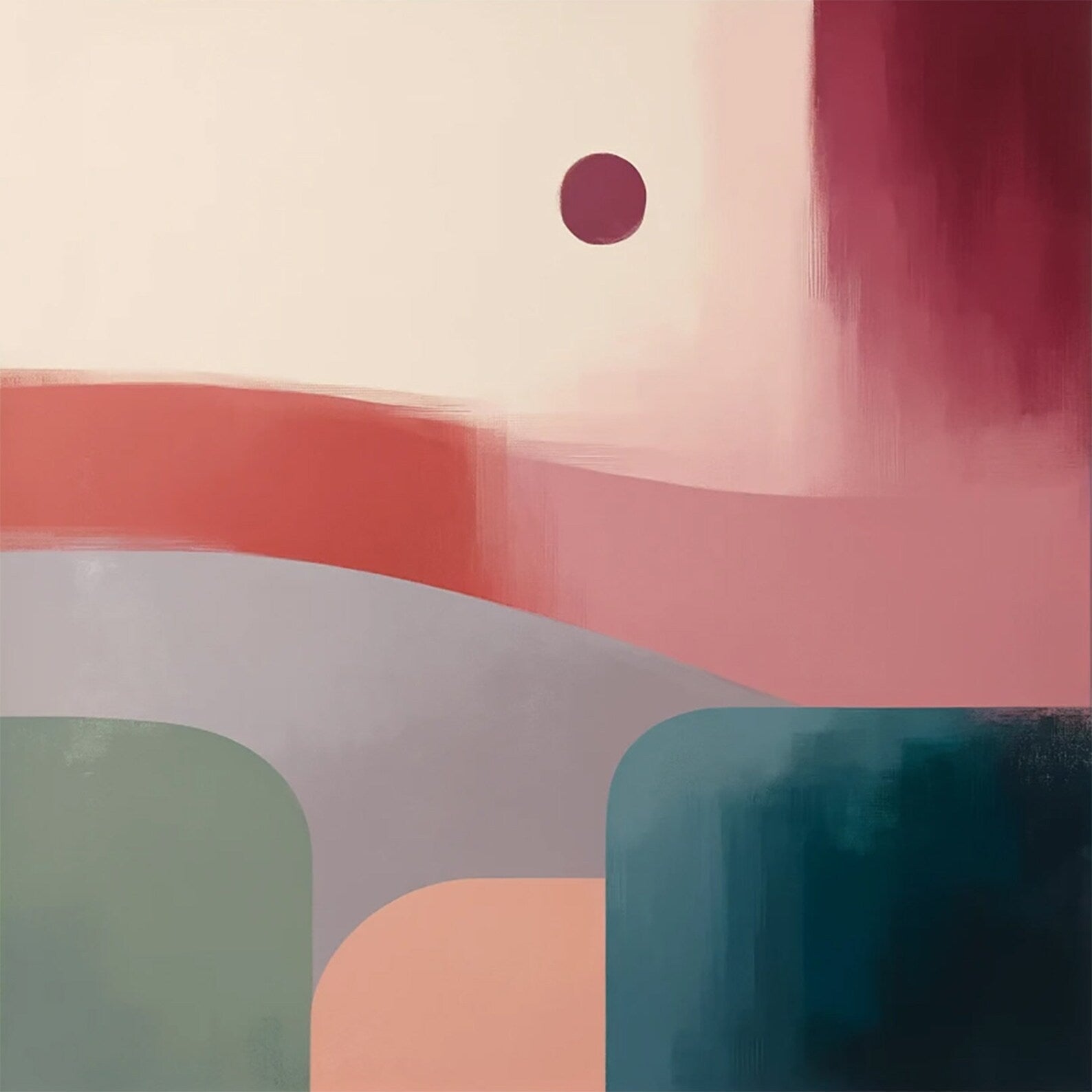 This original, hand-painted artwork features soft curves and bold geometric shapes, with a soothing palette that captures the tranquil moments of dawn. Each paint stroke is carefully applied to create texture and depth, while the singular bold circle acts as a focal point, reminiscent of the rising sun.