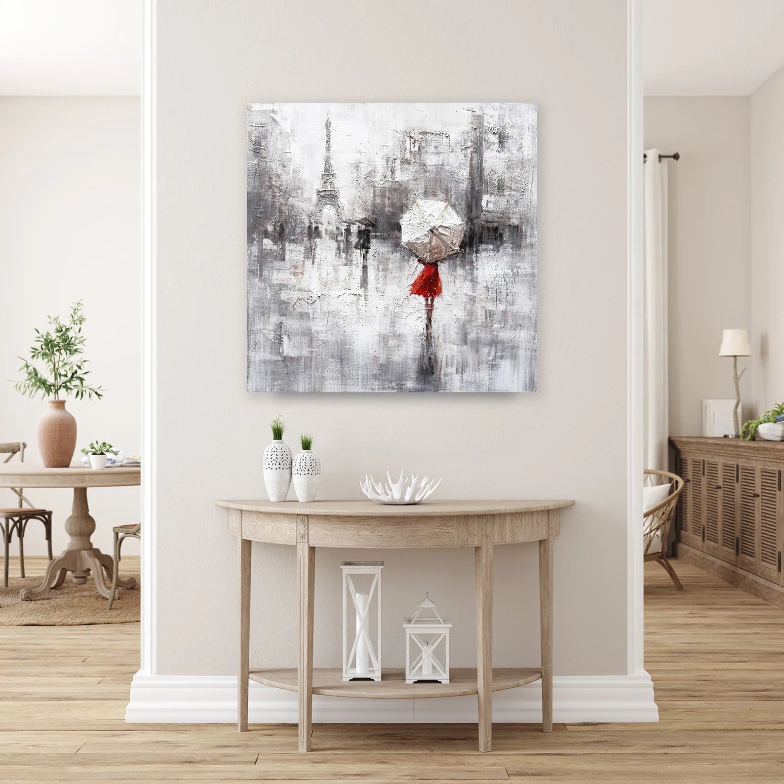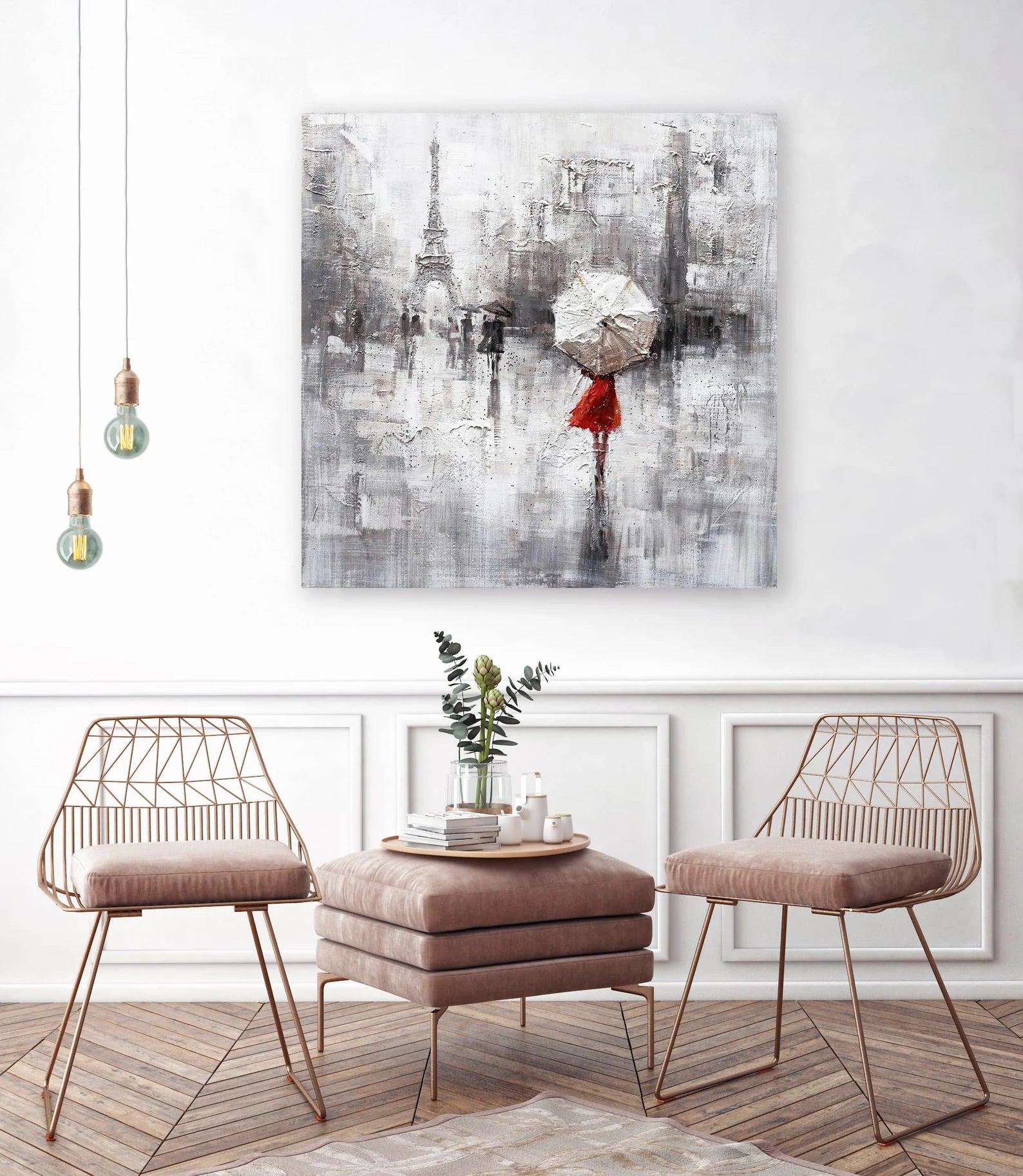 Indulge in the beauty of Paris with our original "Paris in the Rain" hand-painted artwork on a wrapped canvas painting. This exquisite piece captures the essence of Parisian romance, with the iconic Eiffel Tower in the background and a striking girl in a red dress holding an umbrella in the foreground. The painting is crafted with the highest quality thick oil texture and a gray tone, creating a stunning artistic appeal that is sure to captivate and inspire.