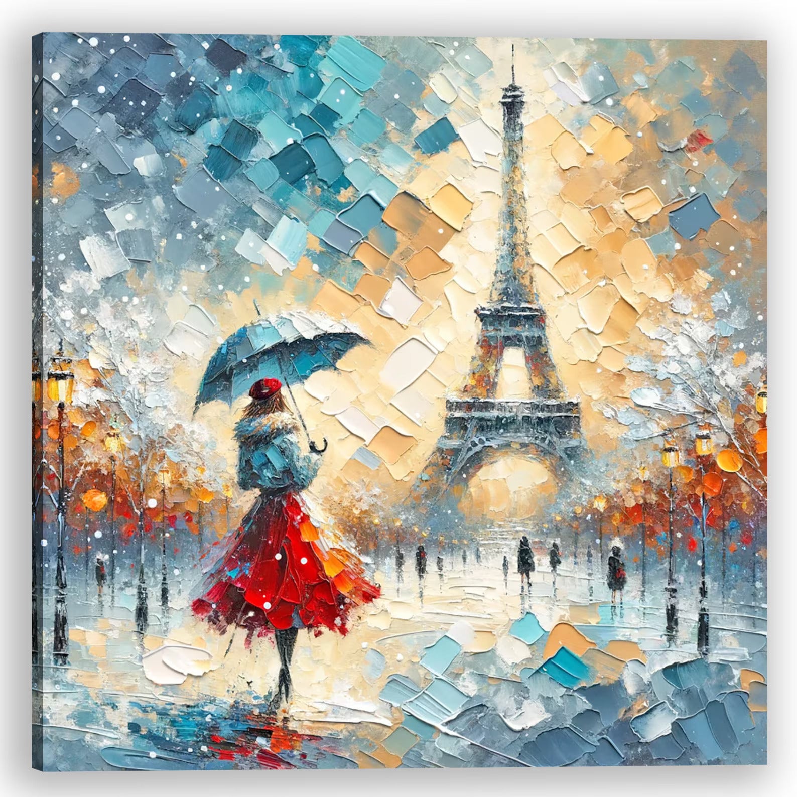 This enchanting canvas art brings the romance of a rainy day in Paris to life through the vivid impasto oil technique. A solitary figure, clad in a red dress and holding an umbrella, stands as a bold splash of color against the muted tones of the city and the iconic Eiffel Tower in the background. The thick, textured layers of paint create a sense of movement and depth, as if the rain is palpably cascading down the canvas. This artwork captures the essence of Parisian chic and the city's timeless charm, making it a captivating focal point in any space. The use of light and color contrast gives this painting an almost musical rhythm, reminiscent of the city's lively streets. It’s more than just a decorative piece; it's a narrative canvas that tells a story of elegance, resilience, and the beauty of everyday moments in one of the world's most beloved cities.