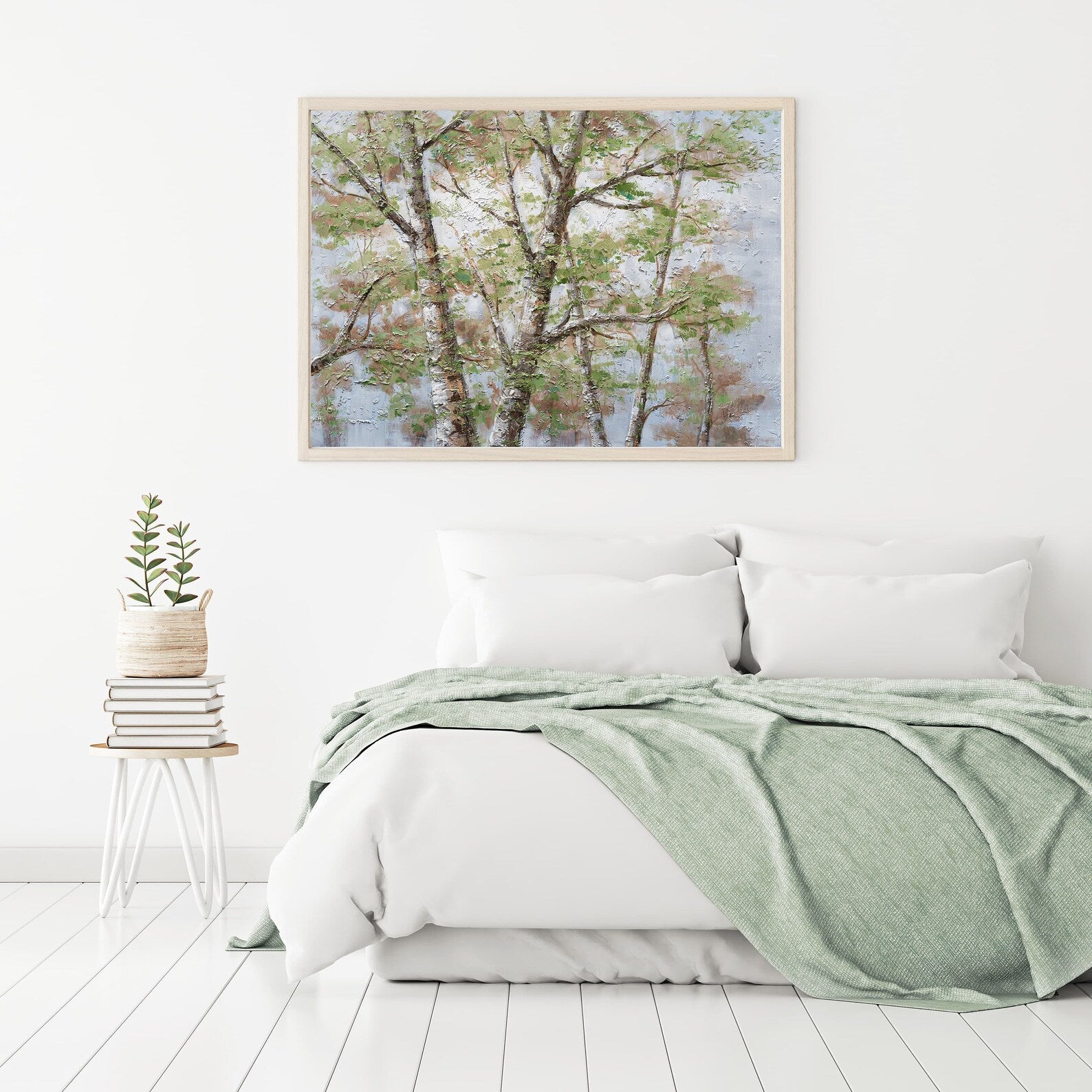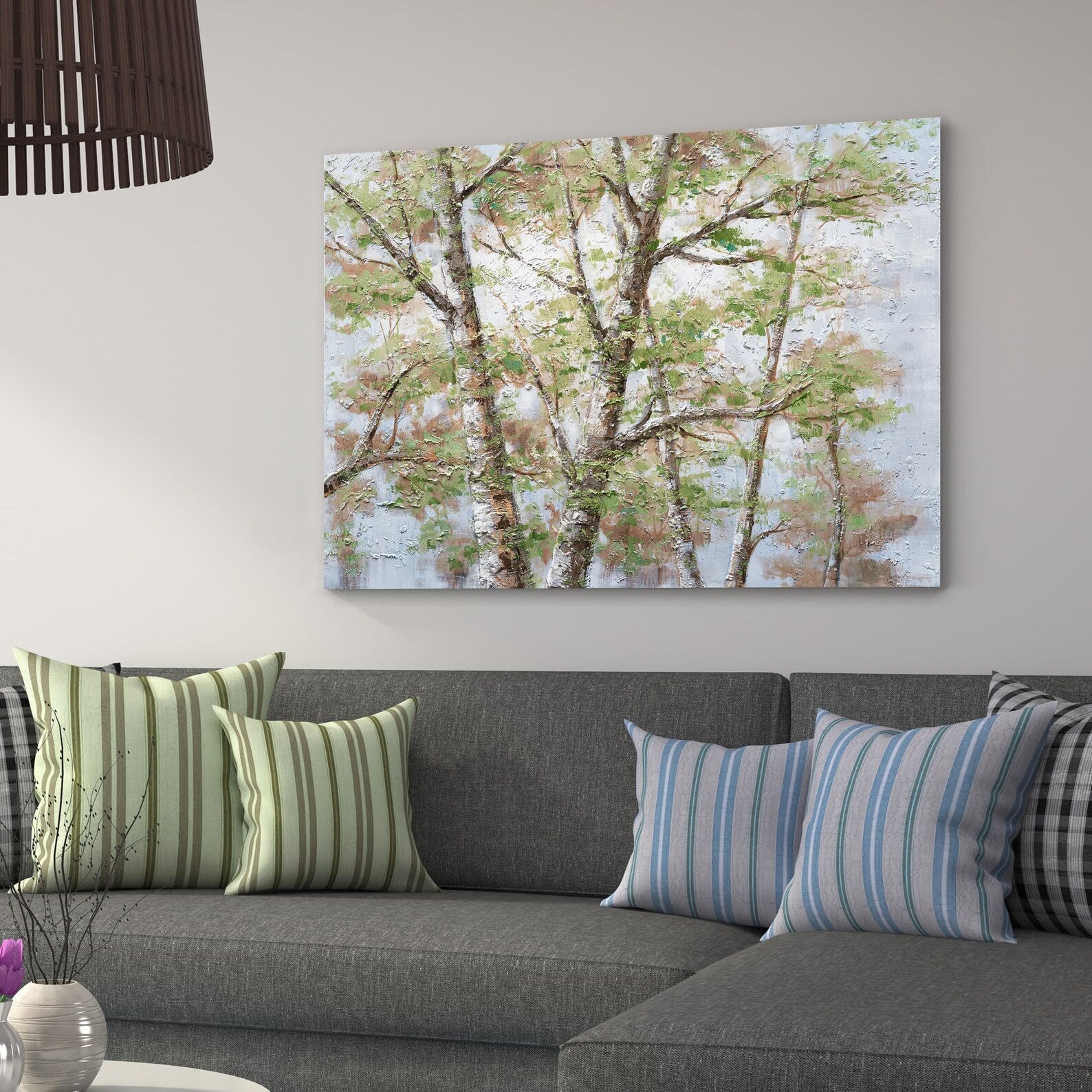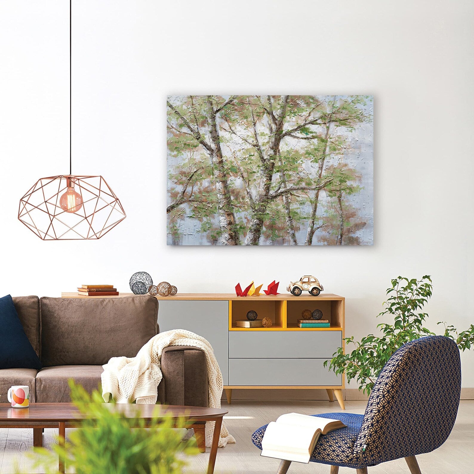 The overall tone of the painting is bright and cheerful, with an emphasis on shades of green, blue, and white. This makes it an ideal piece of art for living rooms, bedrooms, or office spaces where a sense of calm and relaxation is desired. The wrapped canvas format also makes it easy to hang on the wall without the need for framing, and the durability of oil paint ensures that it will retain its vibrancy and color for many years to come. Overall, "Spring Woods" is a beautiful and uplifting work of art that brings the beauty of nature into any space it is displayed in.