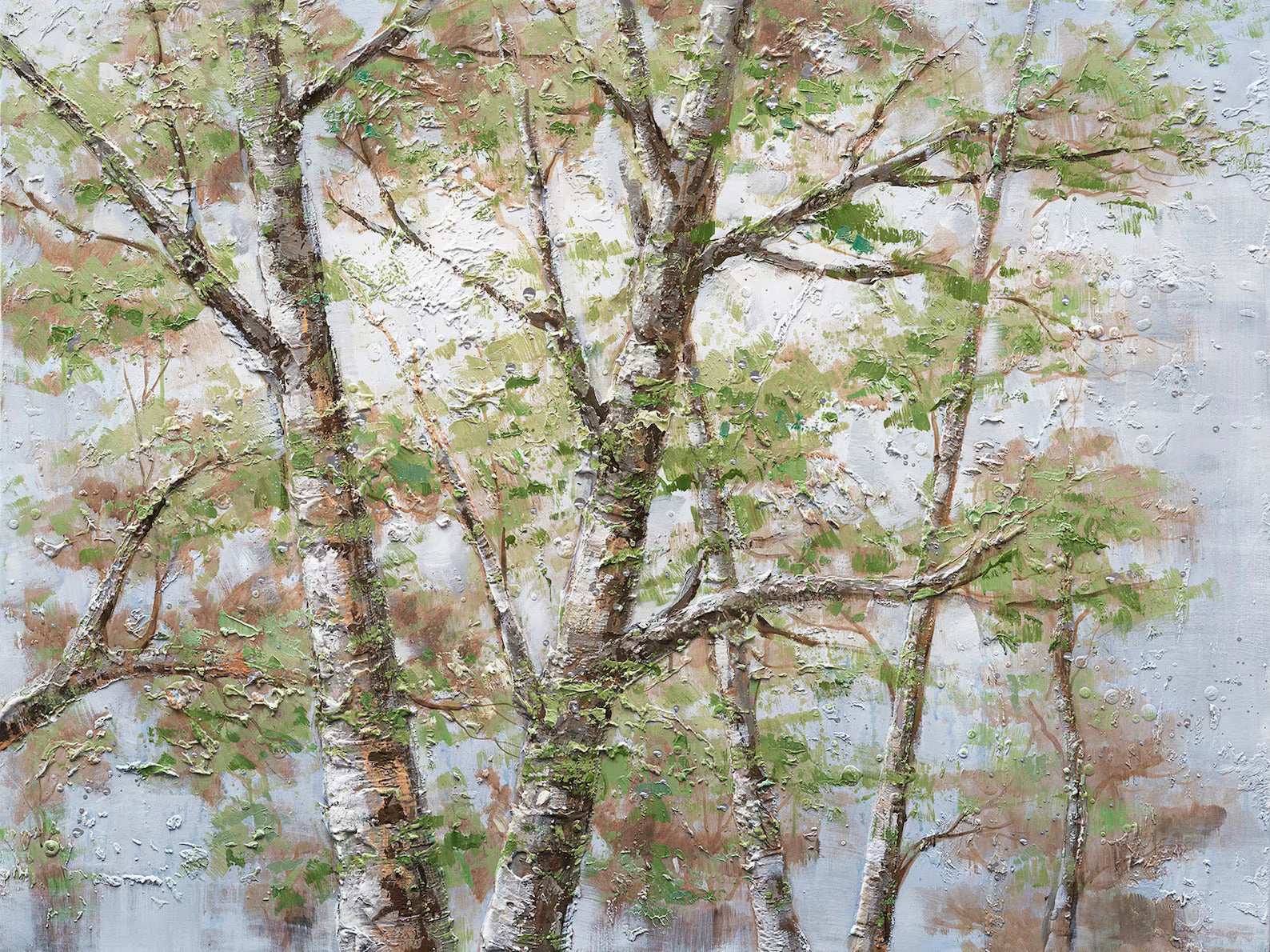 The painting features several thick tree trunks covered with bright green foliage, indicative of new life and growth in springtime. The trees are situated in what appears to be a park or a field, with a light blue sky in the background. The rough texture of the tree trunks is expressed with distinct layers, and the tall and straight trunks give a sense of strength and stability. The artist has used a range of brushstrokes and colors to create texture and depth, with the leaves and branches appearing to sway in the breeze, conveying the sense of movement and life.