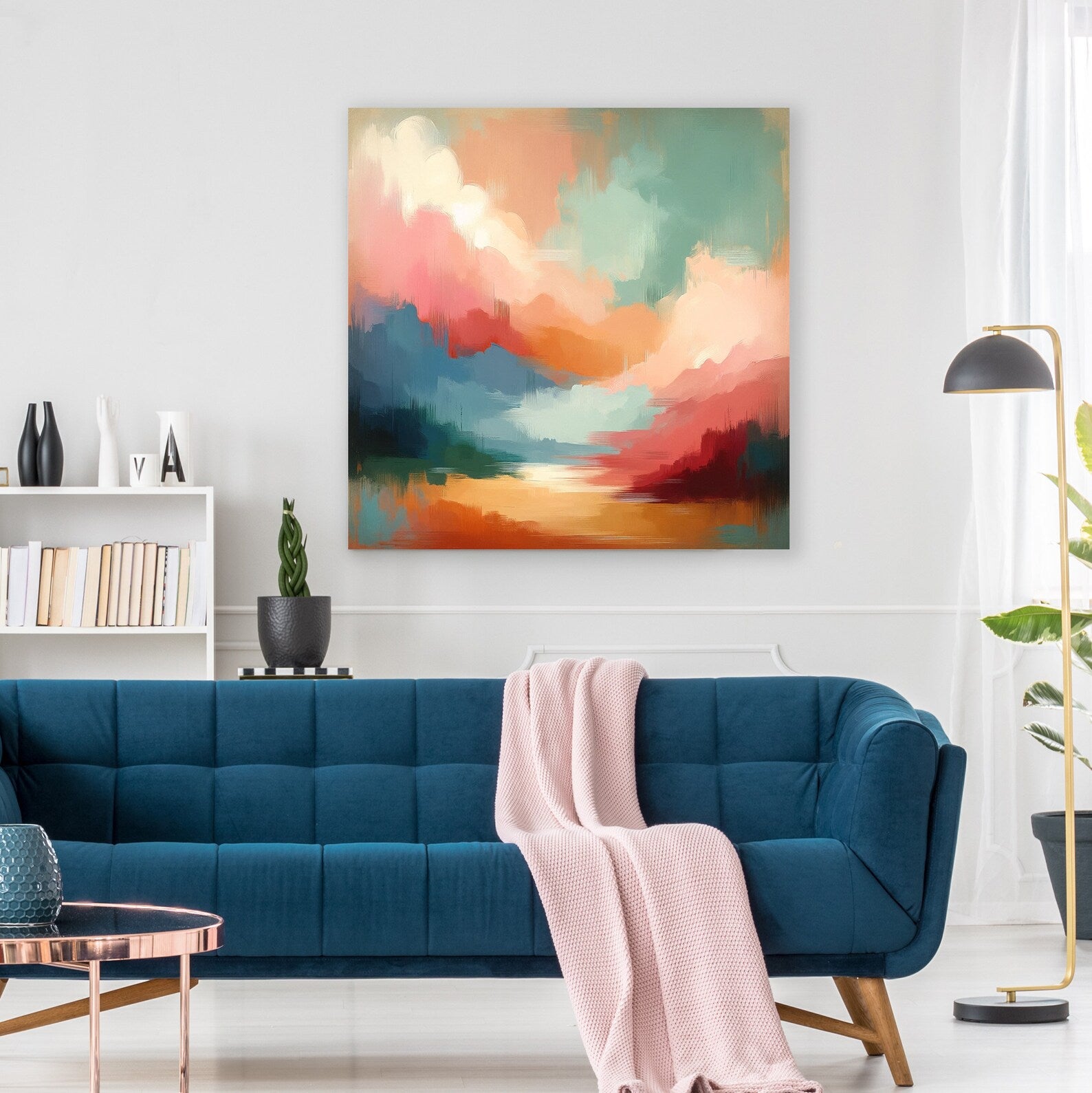This one-of-a-kind, hand-painted canvas is a masterpiece of mood and color, with vibrant pinks, serene blues, and fiery oranges that dance across the canvas, inviting the viewer into a world of tranquility and imagination.