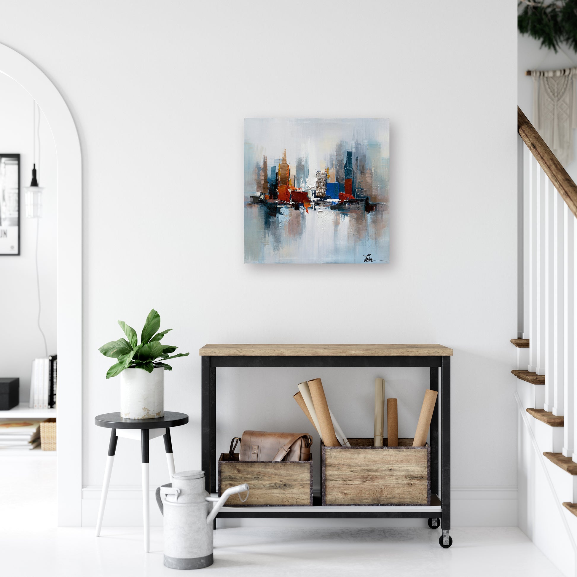 Measuring 24"H x 24"W, this painting is expertly hand-stretched on high-quality stretching rods, making it a truly sophisticated and artistic addition to any space. "Blue Reflections of Manhattan" is perfect for the living room, bedroom or office, and is sure to impress both professional designers and art lovers alike. This piece of art will transform your space into a gallery and be an instant conversation starter.