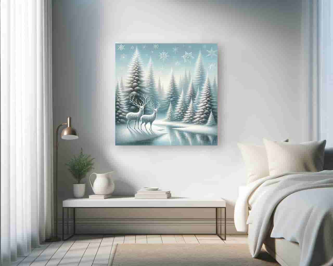 This canvas print invites viewers to contemplate the serene quietude of the season, with each snowflake and frosted needle painted in exquisite detail. The deer, with their intricate patterns and noble antlers, appear as guardians of the forest's secrets, embodying the spirit of the natural world during the most peaceful time of year.