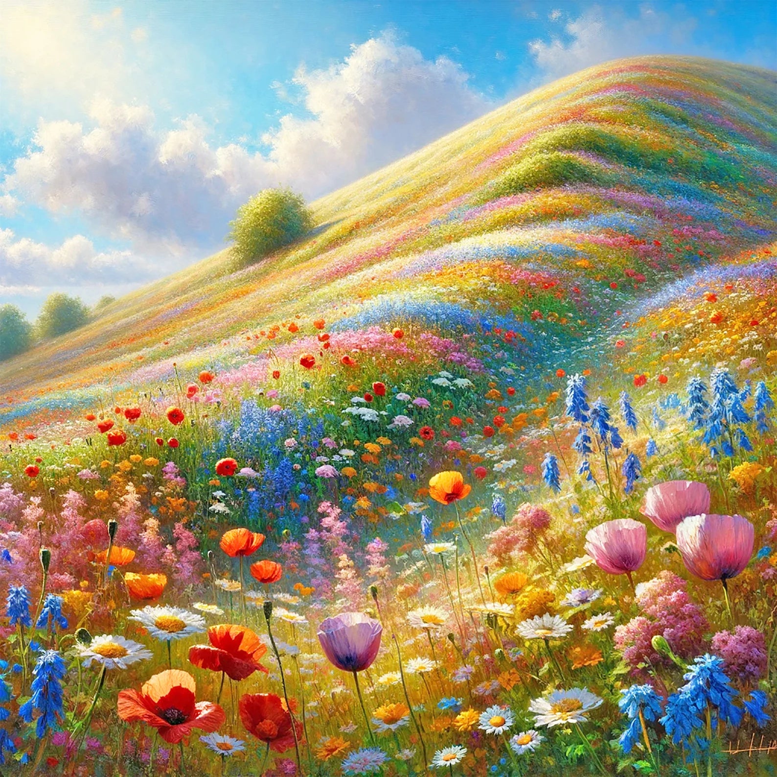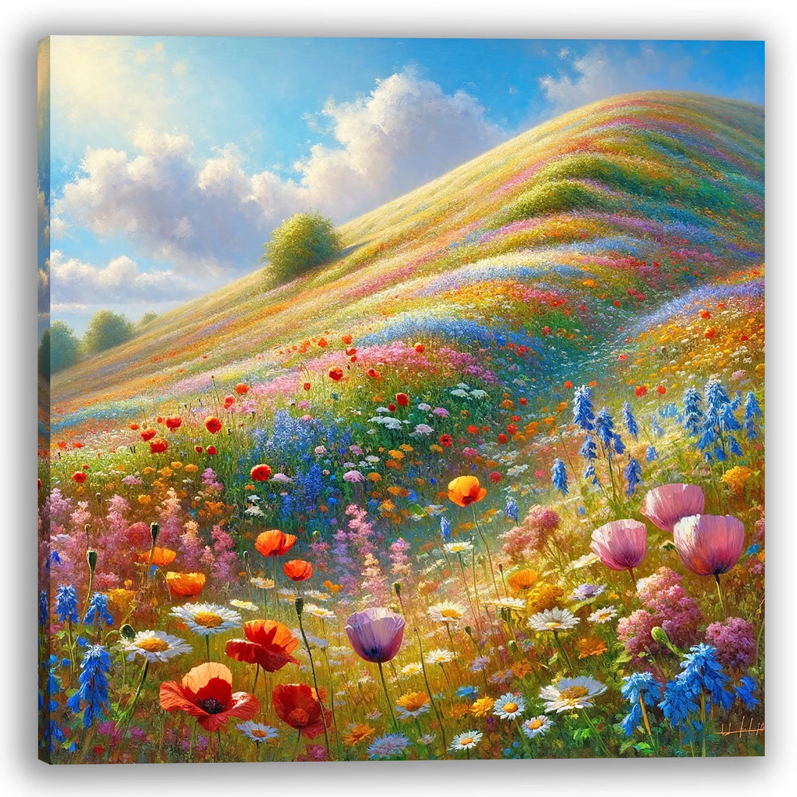 "Immerse yourself in the enchanting beauty of spring with 'Spring's Palette,' a hand-painted impressionist oil painting that brings the wildflower-strewn meadows right into your home. This canvas celebrates the rebirth and beauty of nature with its vibrant colors and dynamic brushstrokes, capturing the whimsical dance of wildflowers against the soft undulations of a hillside.
