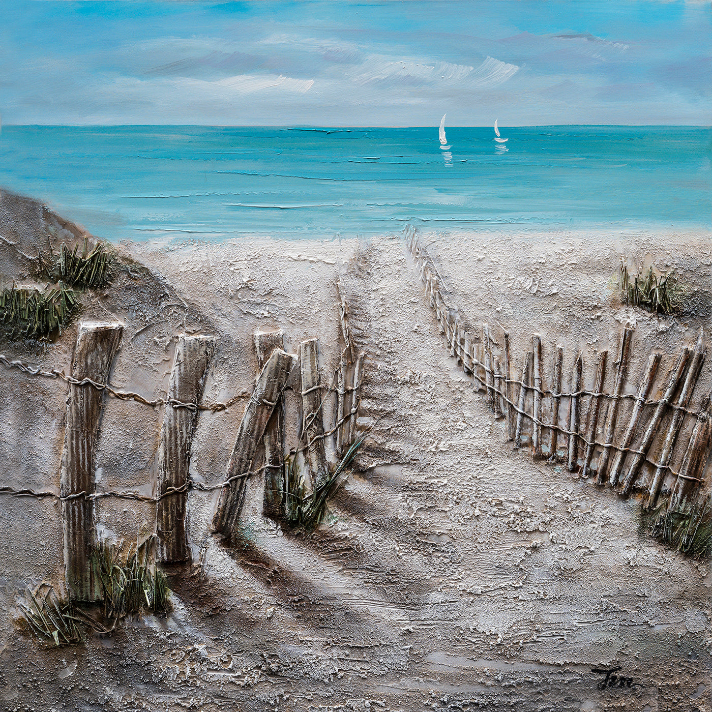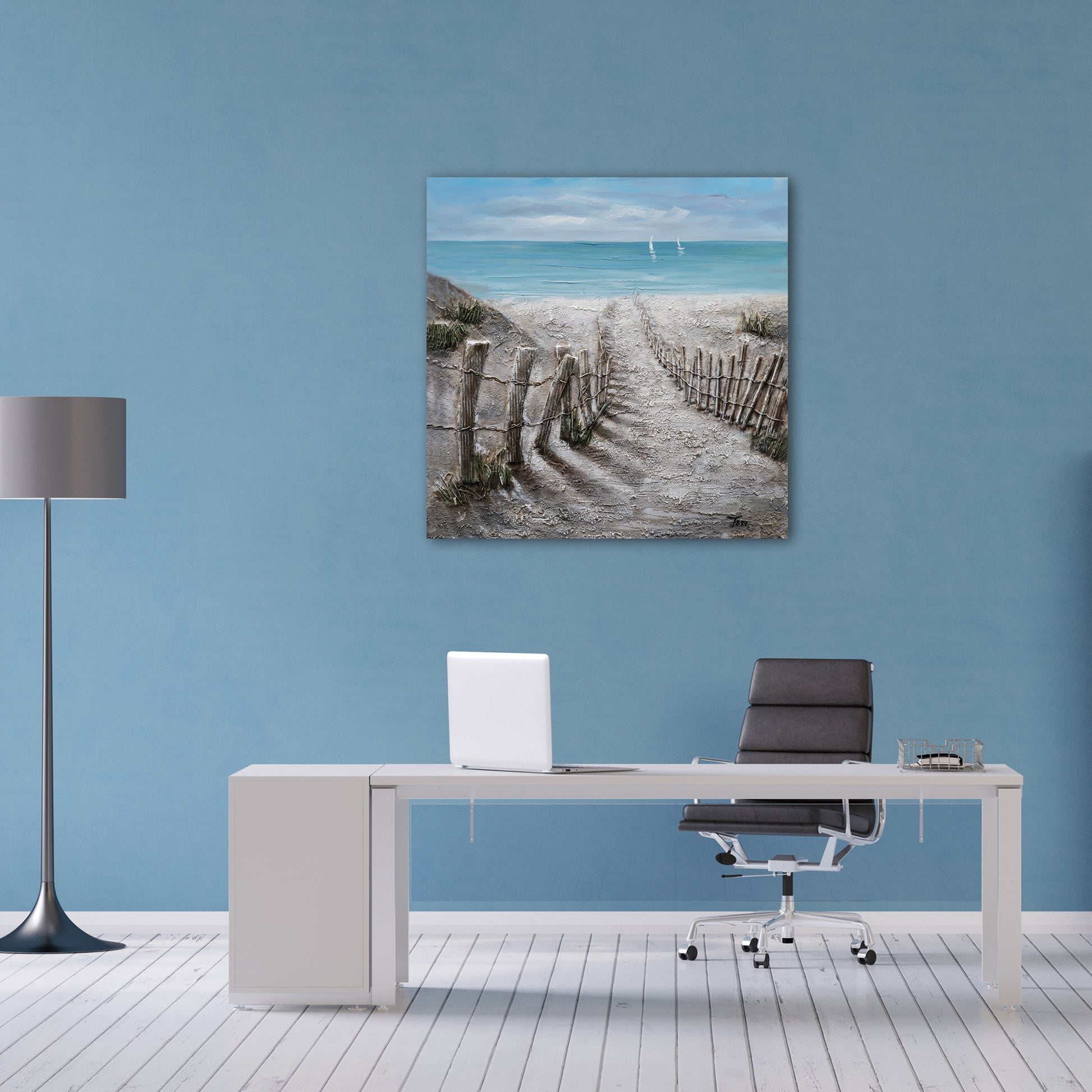 Bring the soothing sounds of the ocean to your home with this oil painting print! This painting leads you down a sandy, dune grass-lined path to the stunning blue water’s edge as sailboats pas by on the horizon. This artful image is 100% hand-painted on artist-grade canvas using oil-based paints, then professionally stretched and gallery-wrapped around a square stretcher bar frame. Measuring 40" H x 40" W x 1.5" D overall, this piece arrives fully assembled and ready to hang right out of the box with wall hooks included for effortless installation.