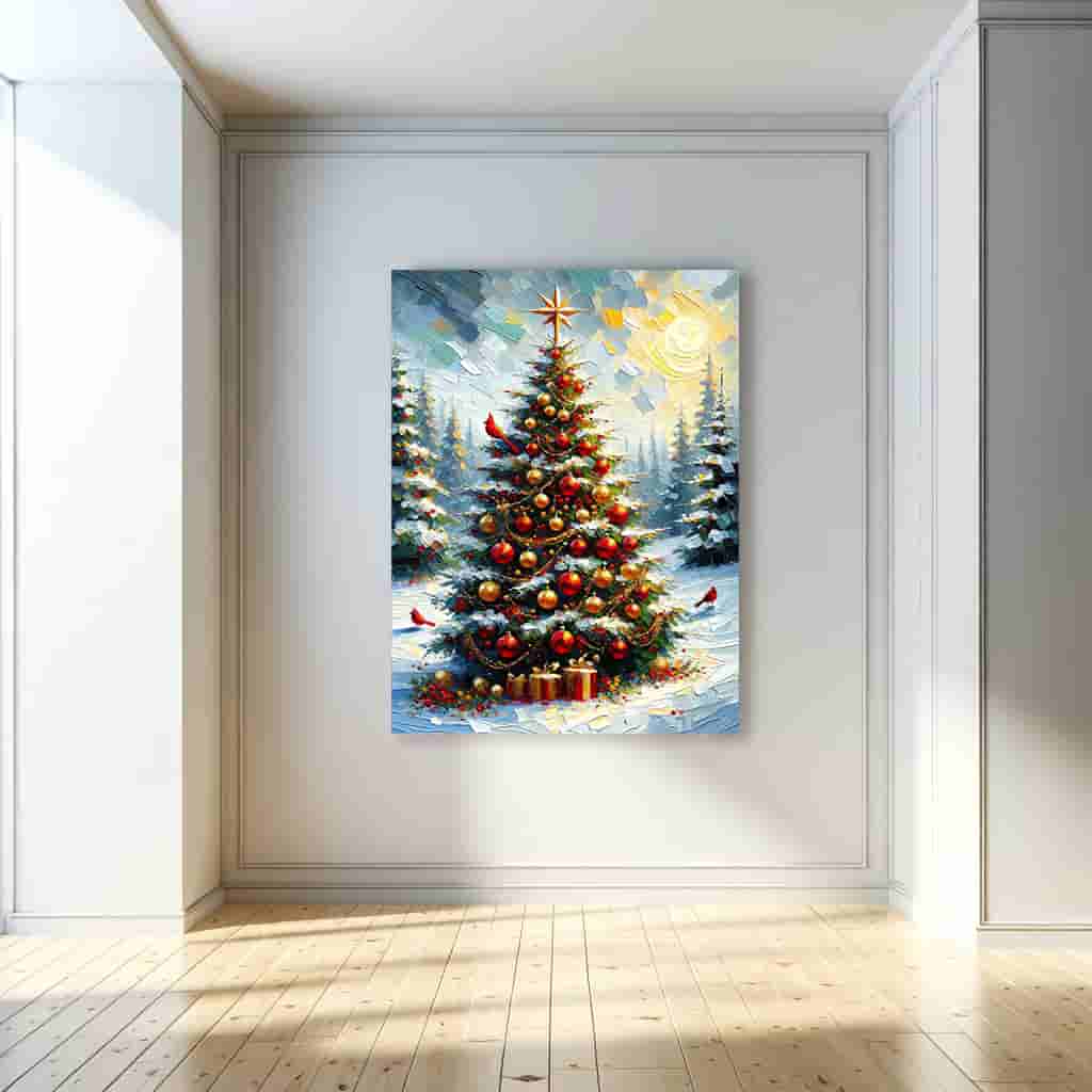 Witness the charming cardinals as they alight upon the tree’s branches, their vivid red feathers a merry complement to the tree's golden decor. These festive birds are symbols of hope and joy, adding an extra touch of life to this already vibrant scene. Below the boughs, a treasure trove of gilded gifts promises the delight of discovery and the generosity of the season.