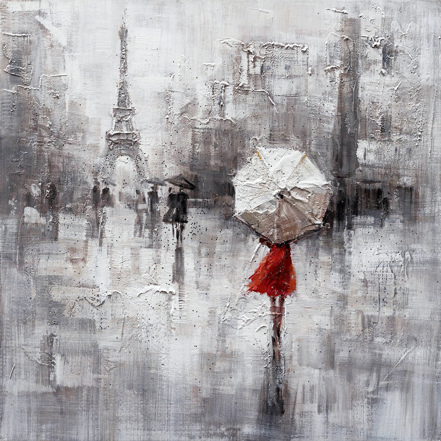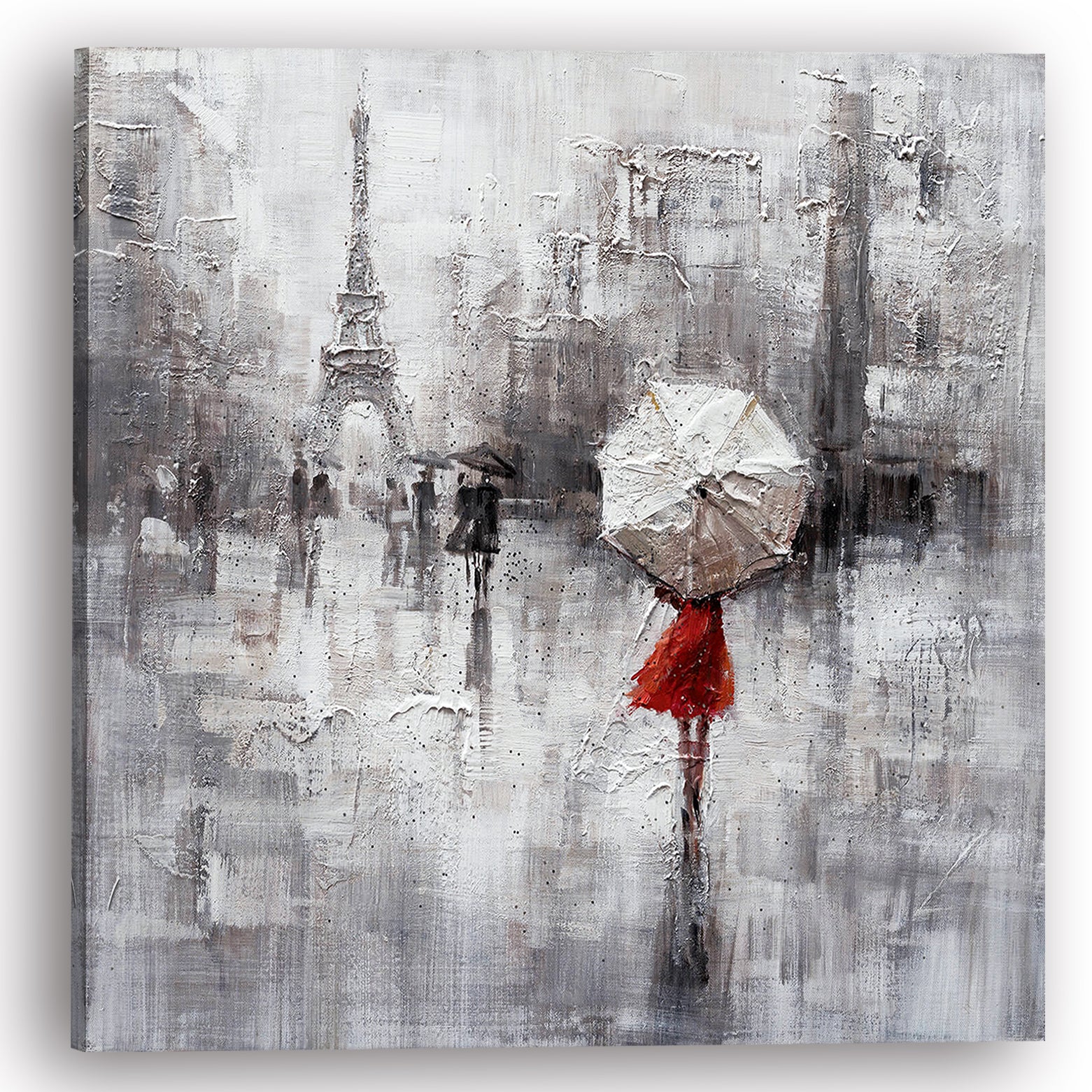 Experience the beauty of Paris with this original, hand-painted oil painting featuring the iconic Eiffel Tower and a girl in a red dress holding an umbrella. The painting is of the highest quality, with a thick oil texture and a gray tone that adds to its artistic appeal.