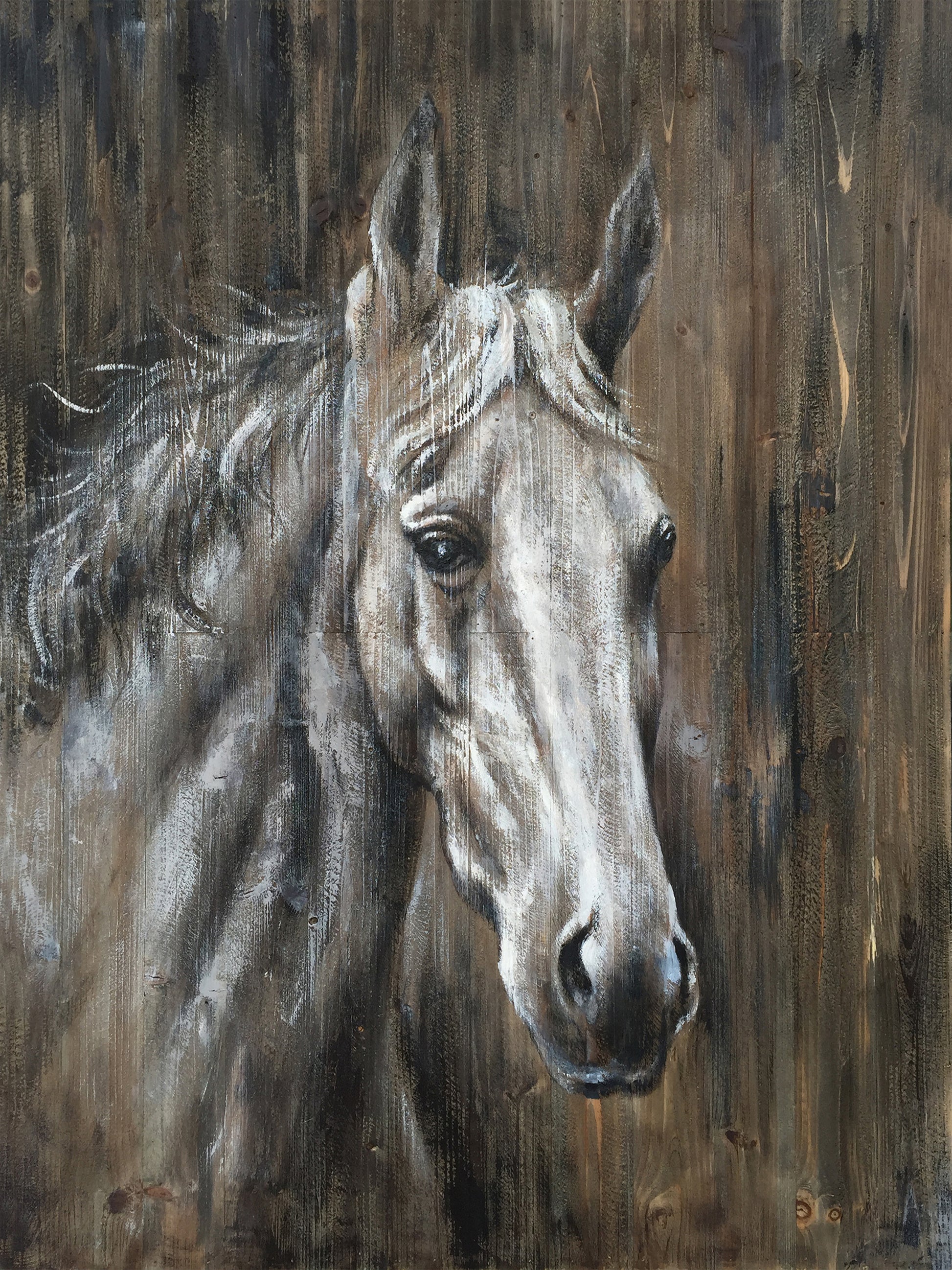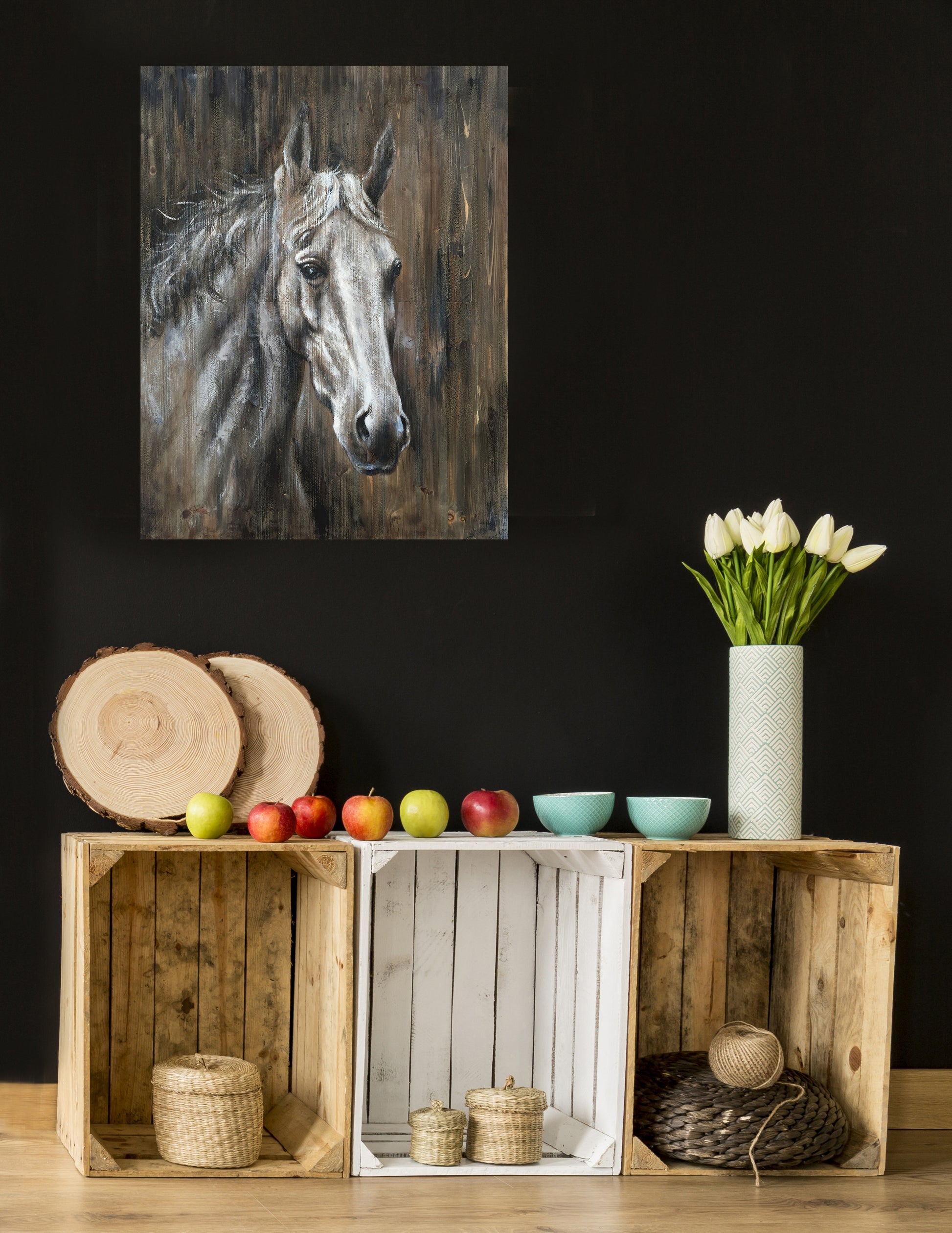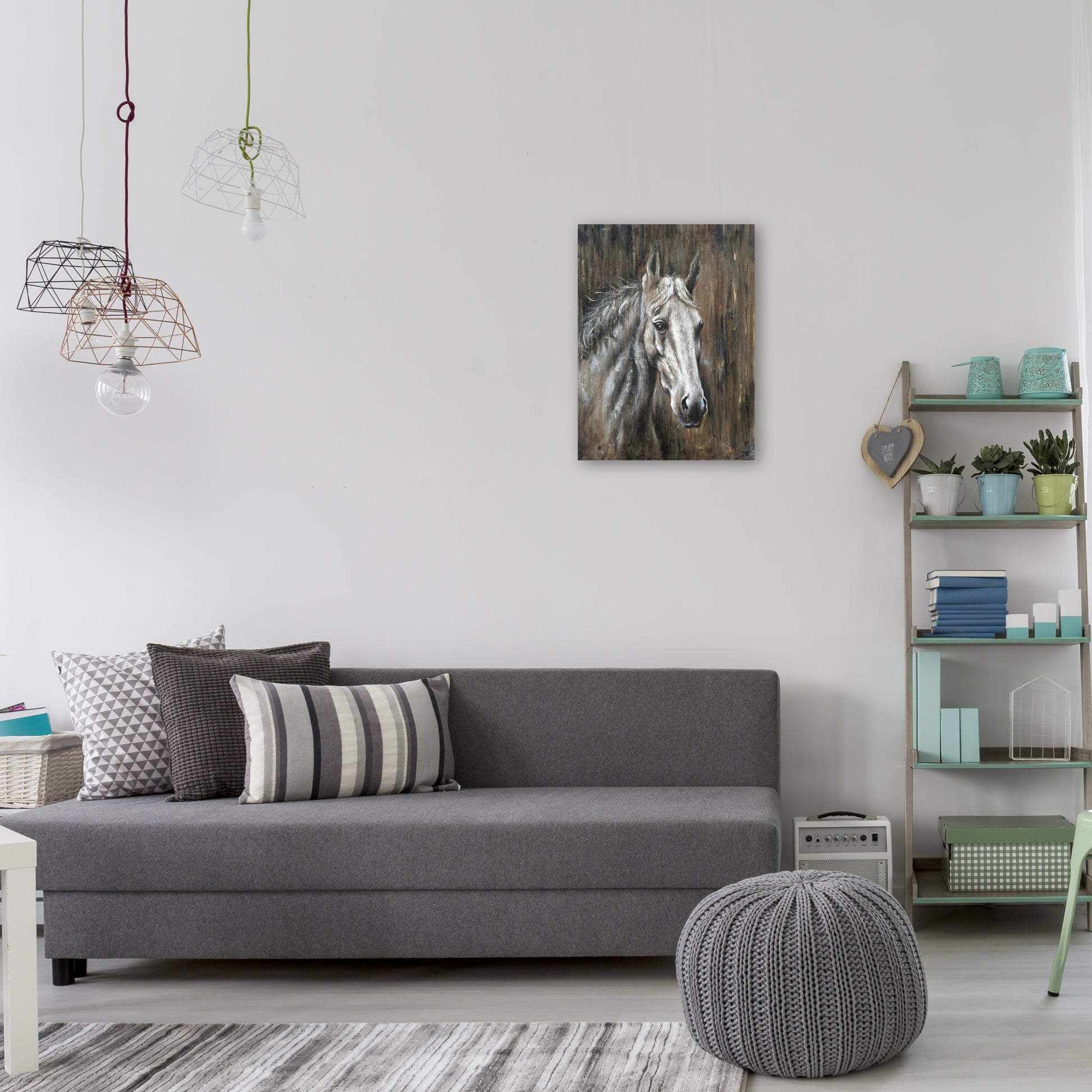 Bring rustic style to your living room, dining room, or home office with this distinctive wrapped painting. Entitled “Texas Horse” this rectangular oil painting is painted on canvas, and stretched over a wooden frame. It features the profile of a horse in shades of gray and brown, with a technique that mimics the look of distressed wood planks. This piece comes with wall mounting hardware, so it’s easy to hang vertically over your sofa, dining room table, or desk.