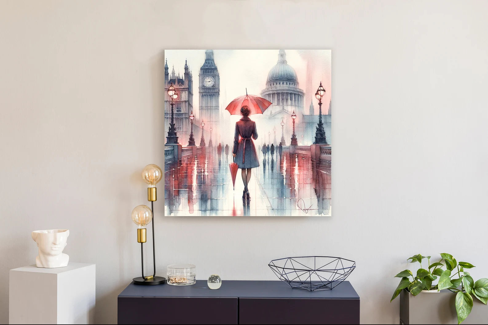 Crafted with care, each brushstroke on this watercolor print evokes the magic of London's misty atmosphere, making it a unique addition to any home. The soft hues and dreamy backdrop set against the vibrancy of an umbrella-clad couple offer a romantic and cozy vibe.