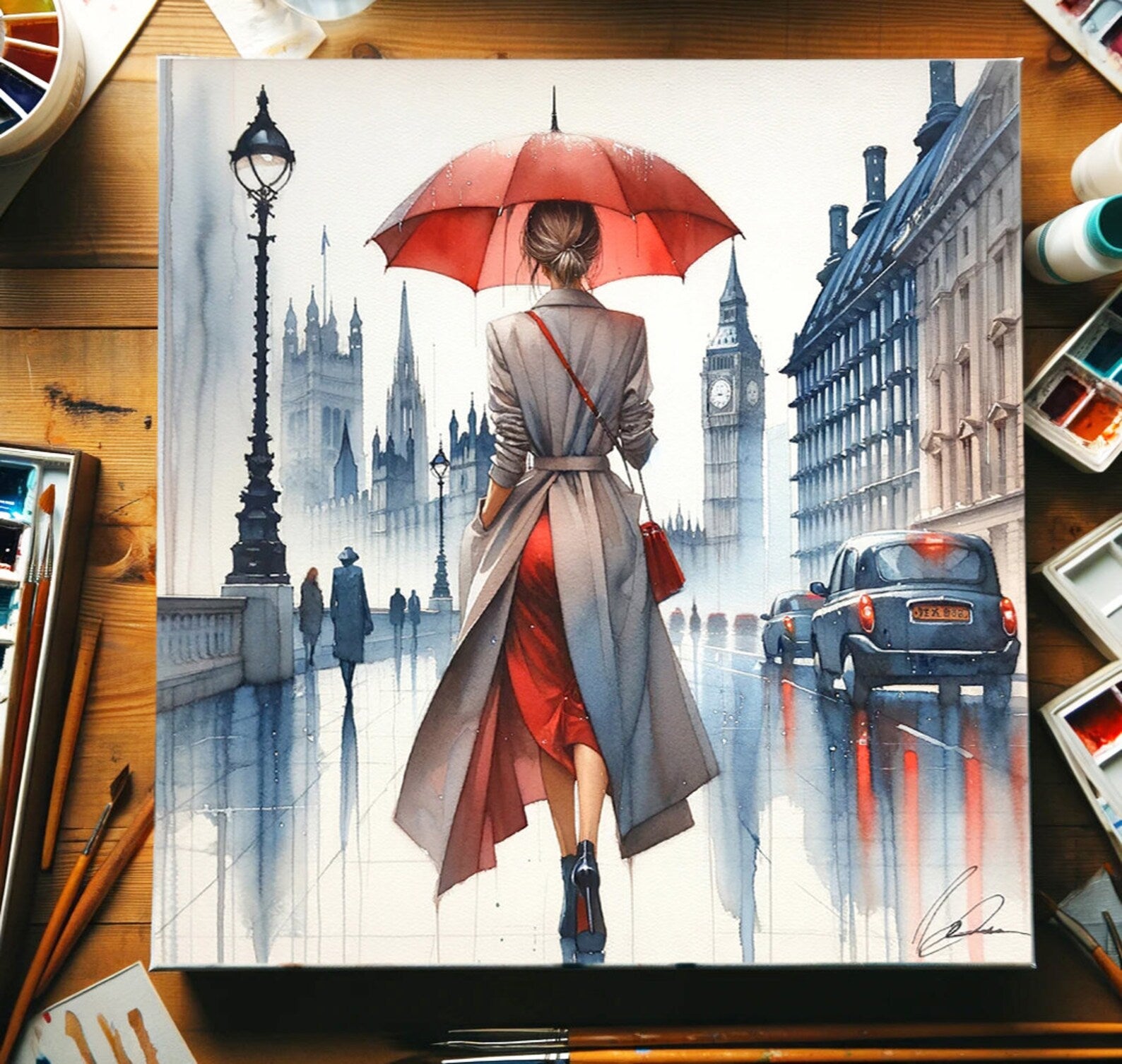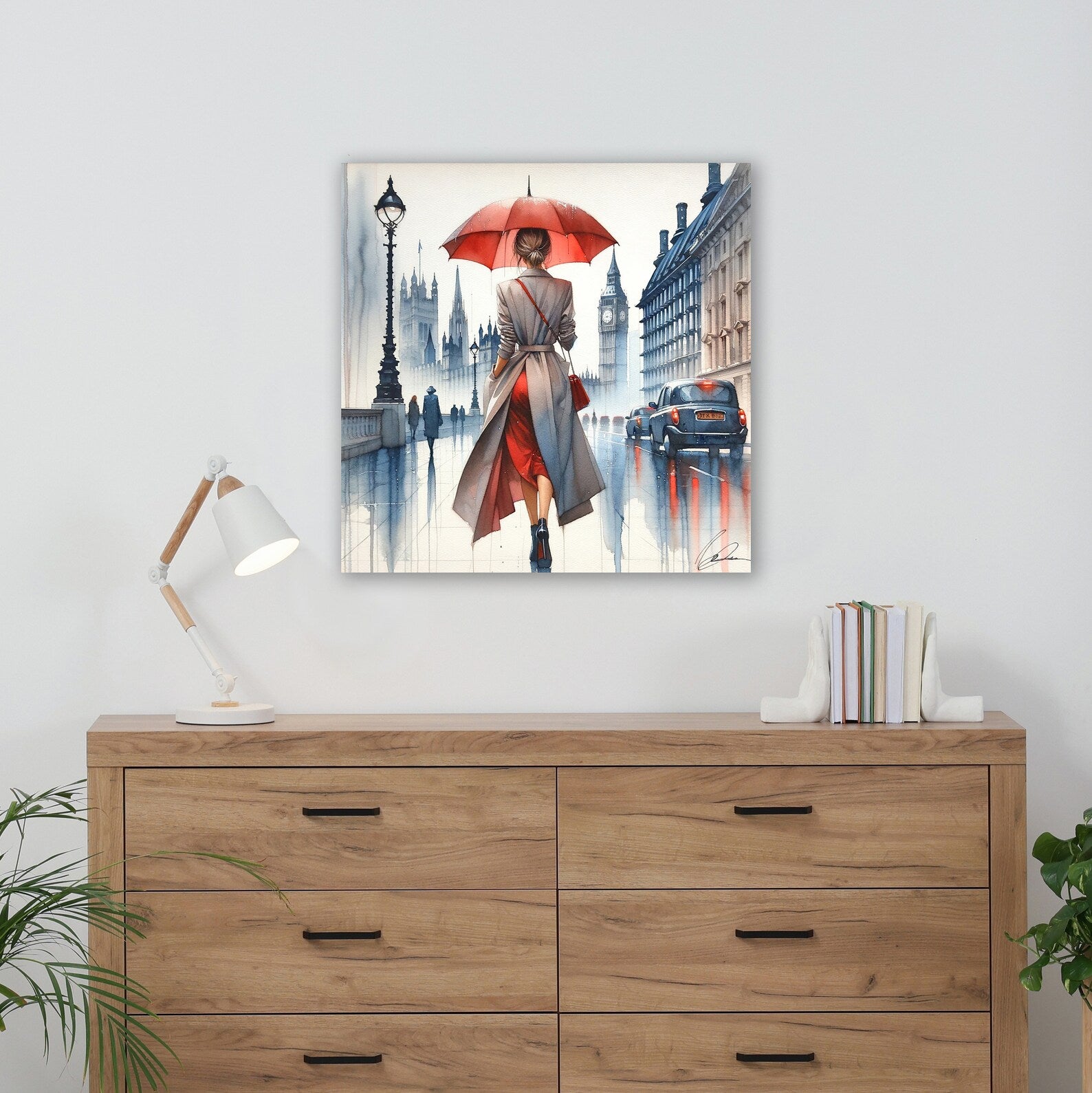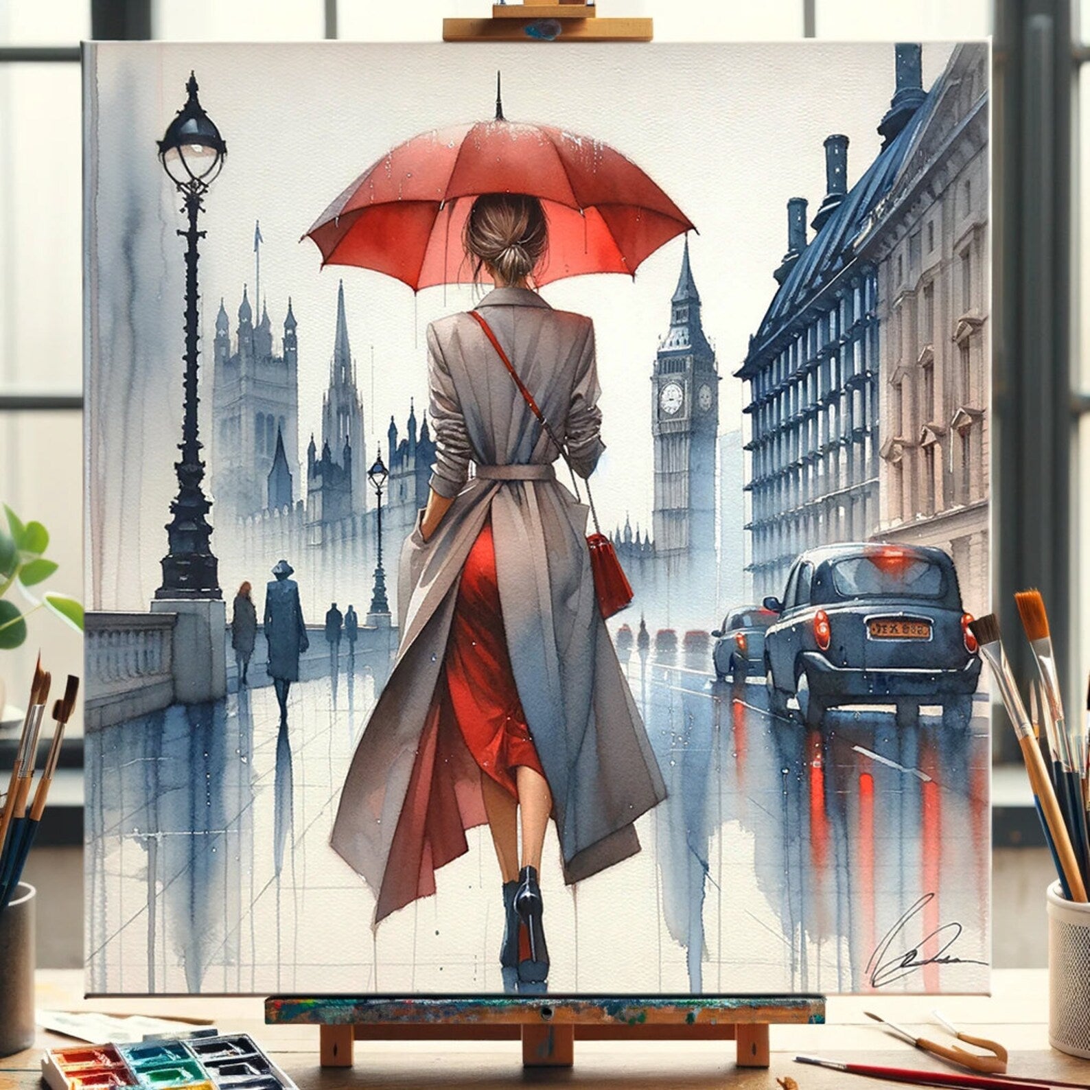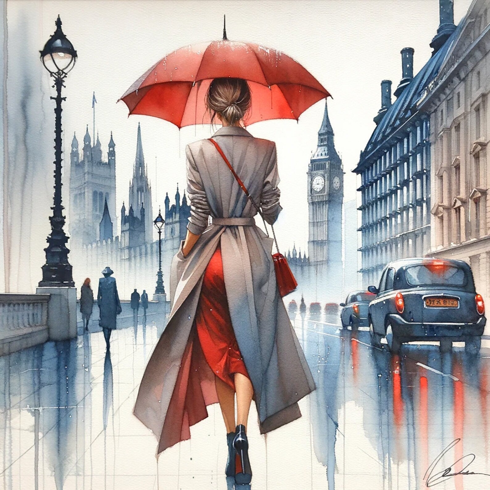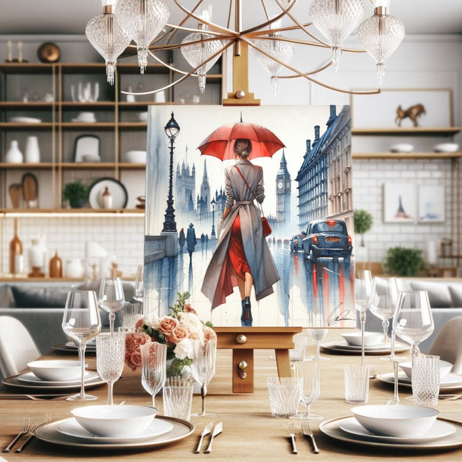 Crafted with a delicate touch, the watercolor technique used in this print gives life to the rainy London scene in a way that's both realistic and dreamy. The grey tones of the cityscape paired with the pop of color from the subject's red dress and umbrella create a striking visual narrative.
