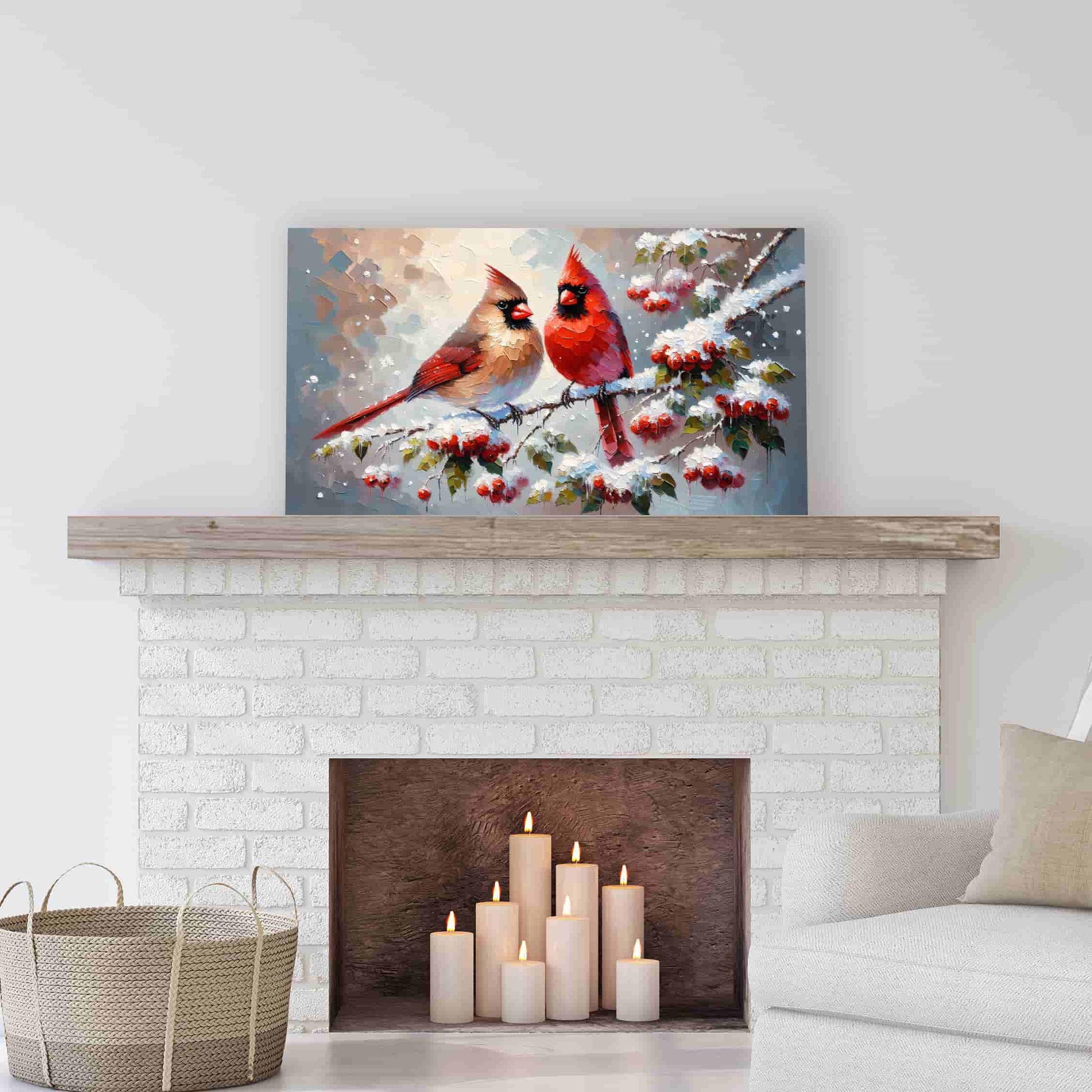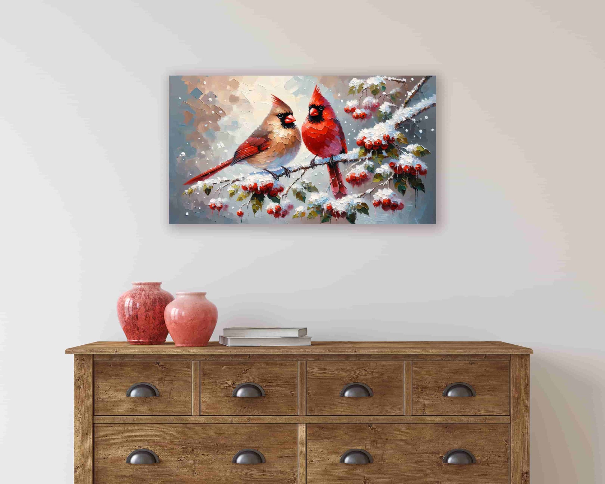 "Whispering Winter's Song - Cardinal Pair on Snow-Dusted Berries" Wrapped Canvas Wall art prints