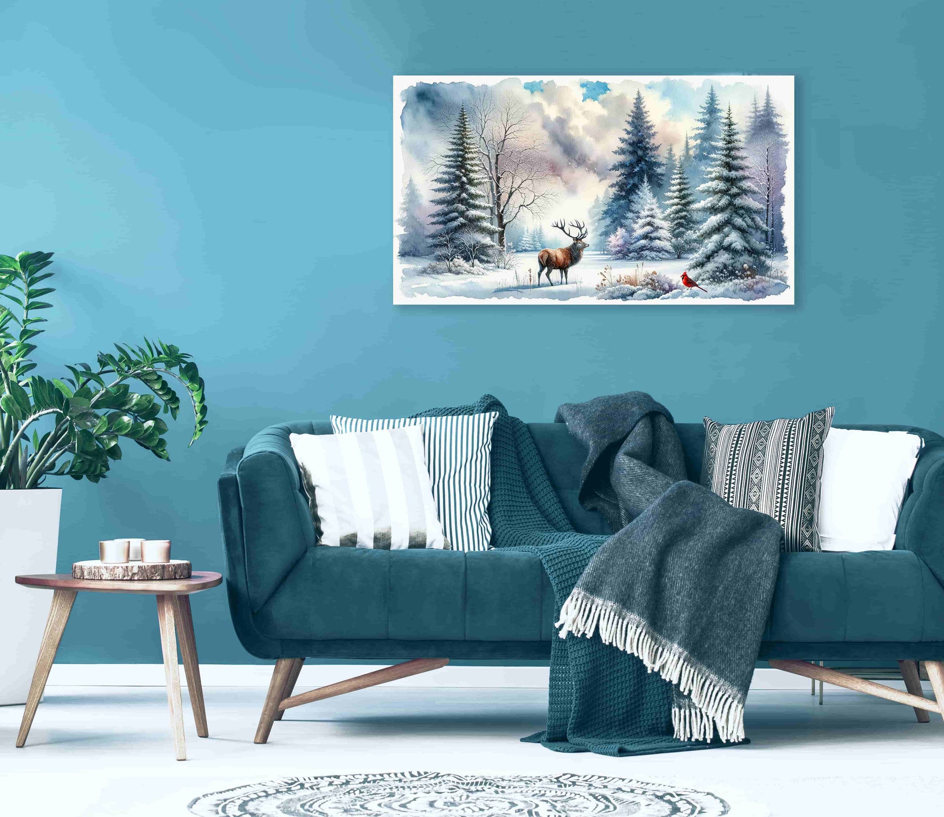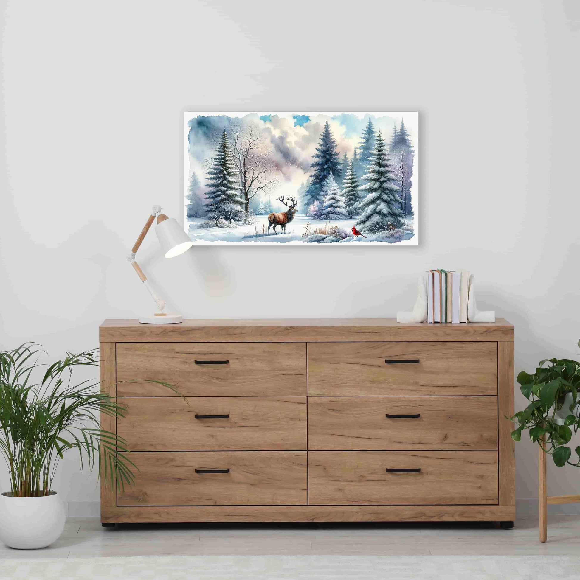 This exquisite artwork transports you to a hushed forest glade where a noble stag stands poised, a solitary cardinal companion perched nearby, both rendered in stunning detail against the soft embrace of winter's touch.