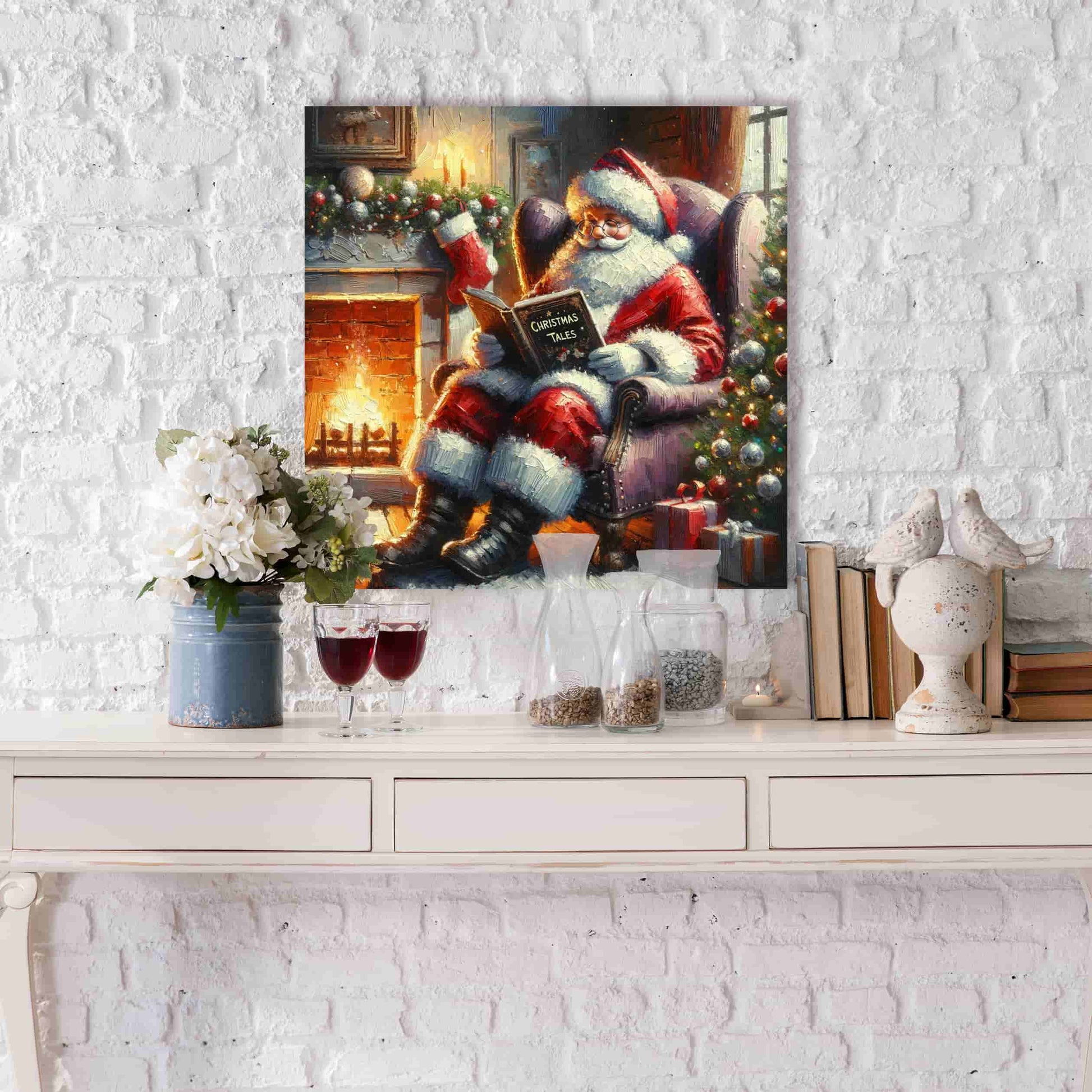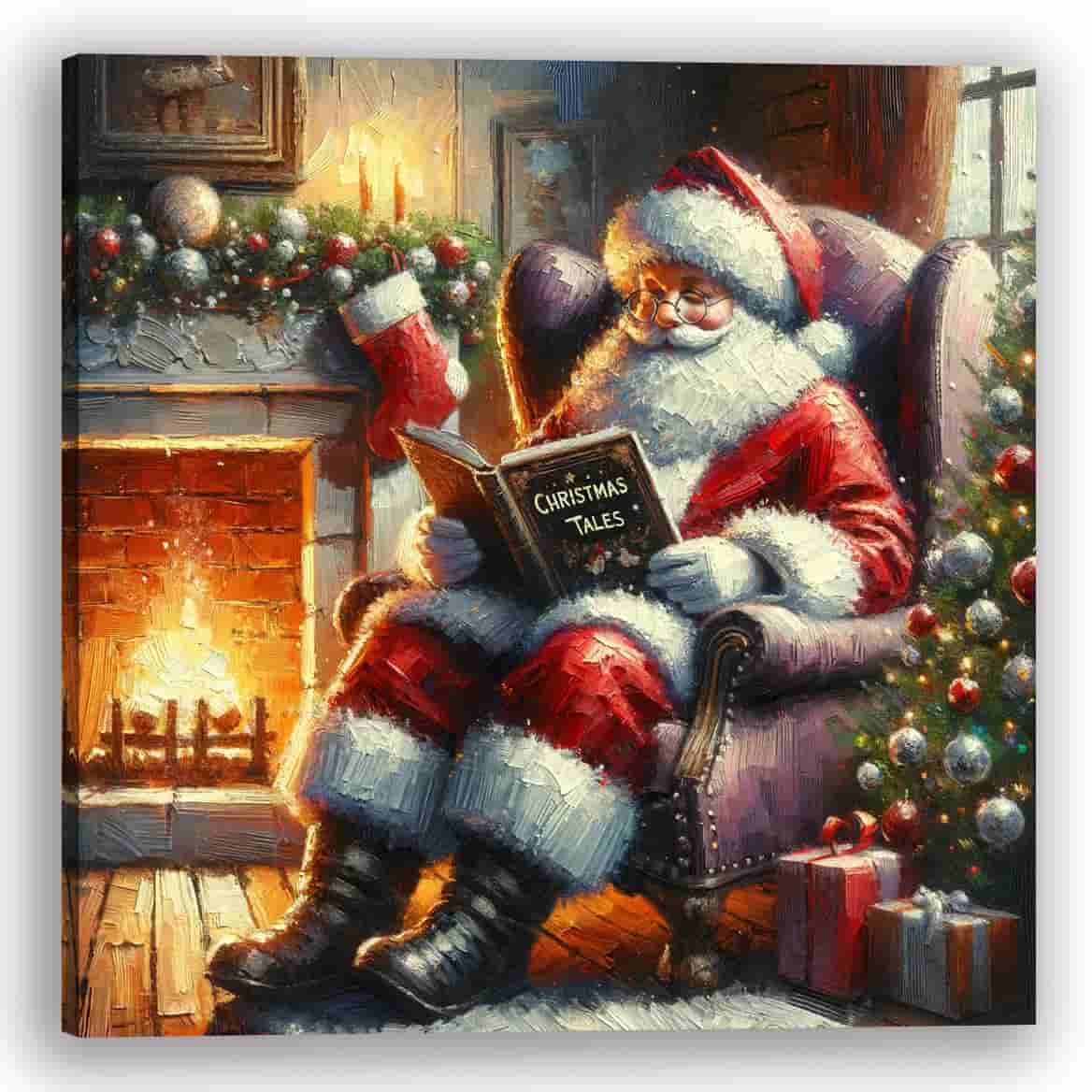 Delve into the heartwarming world of holiday storytelling with our "Yuletide Stories by the Hearth - Santa Claus Reading Canvas Art Print." This captivating piece of art features the beloved figure of Santa Claus, immersed in a book of Christmas Tales, exuding the spirit of the season through his peaceful and joyful demeanor.